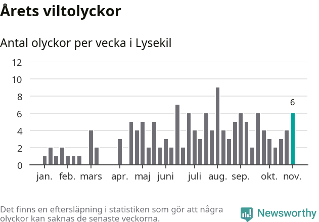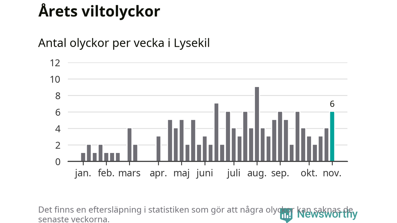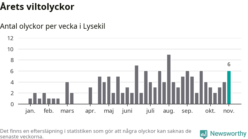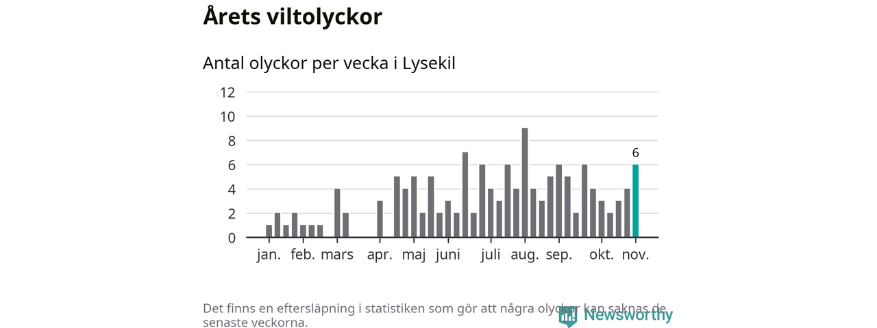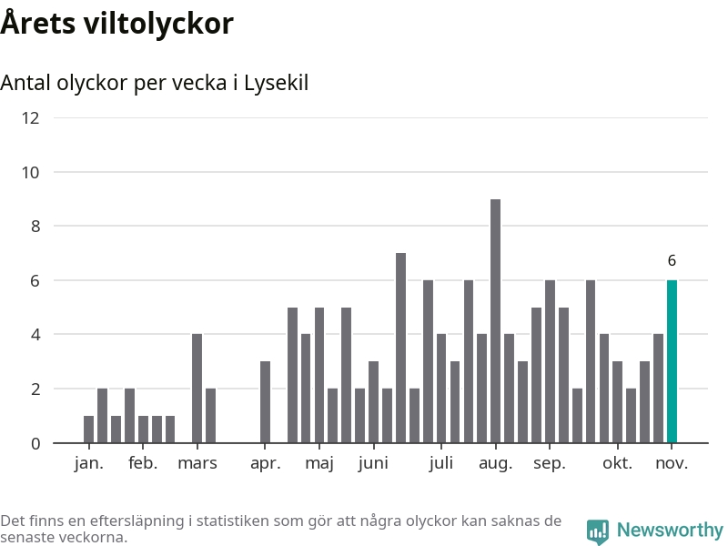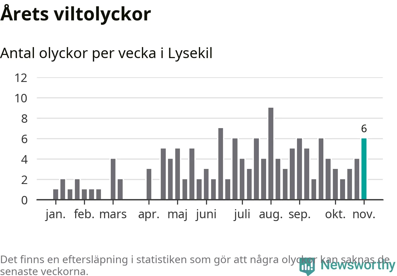 Hittills har sex viltolyckor rapporterats in i Lysekils kommun från vecka 45. Se listan här.