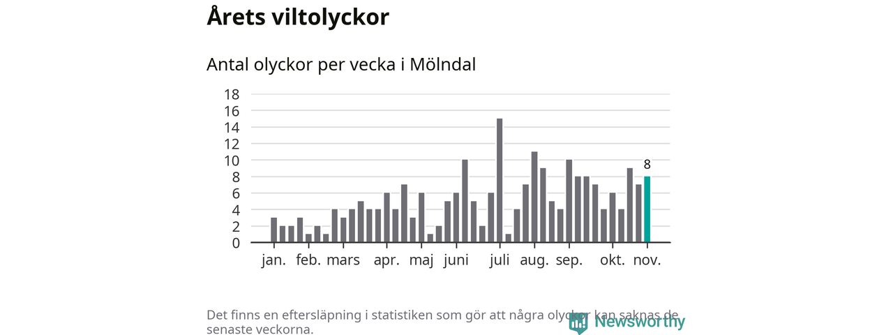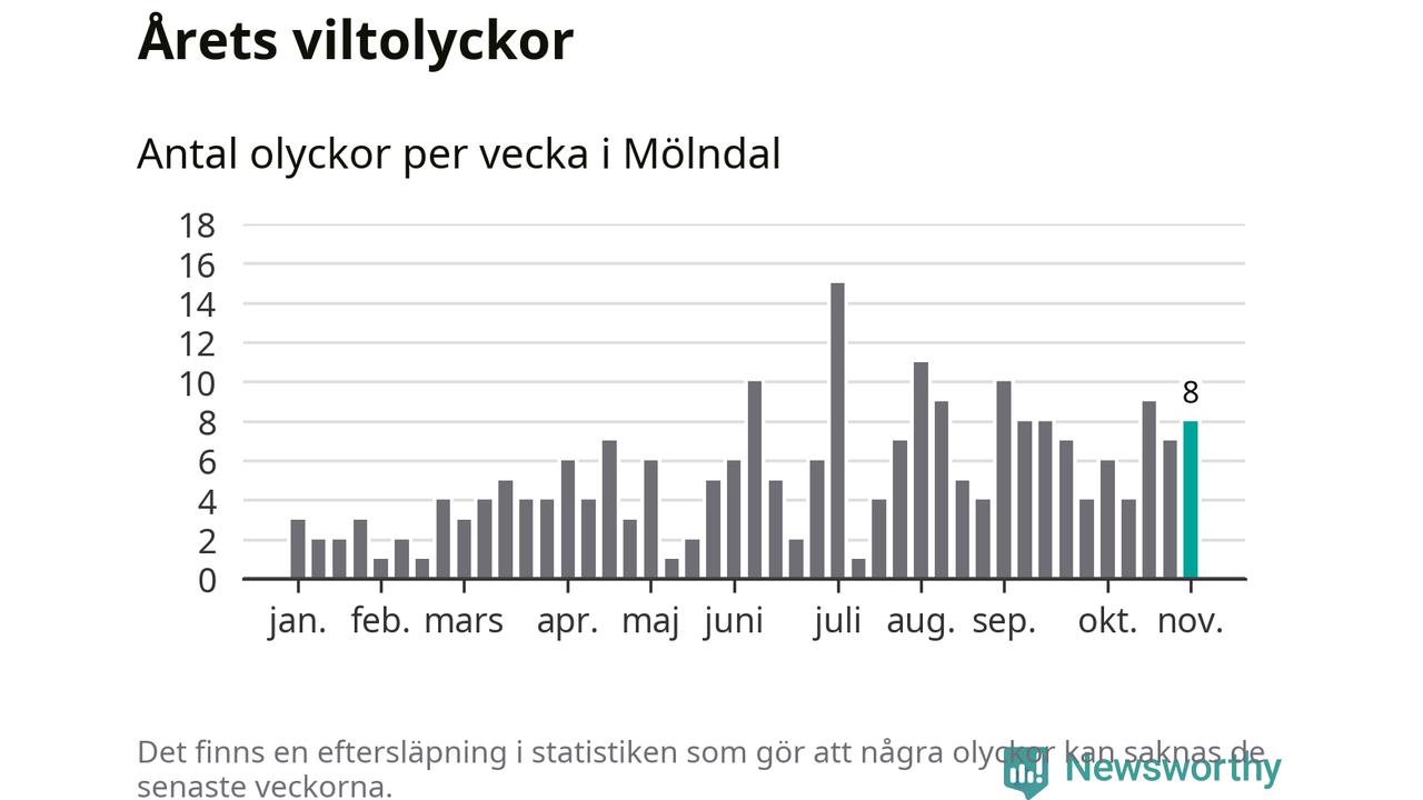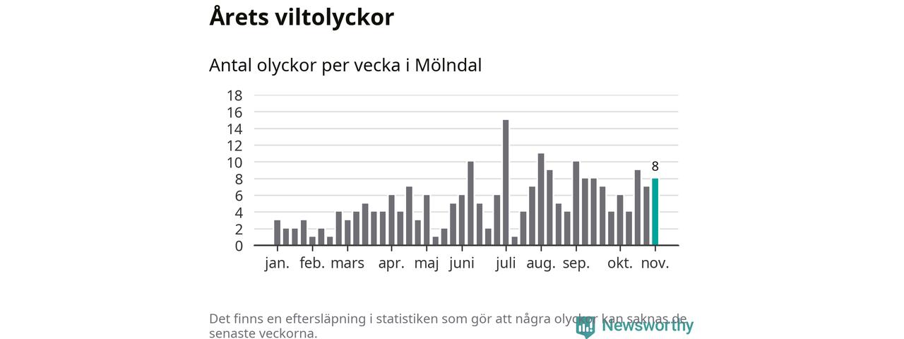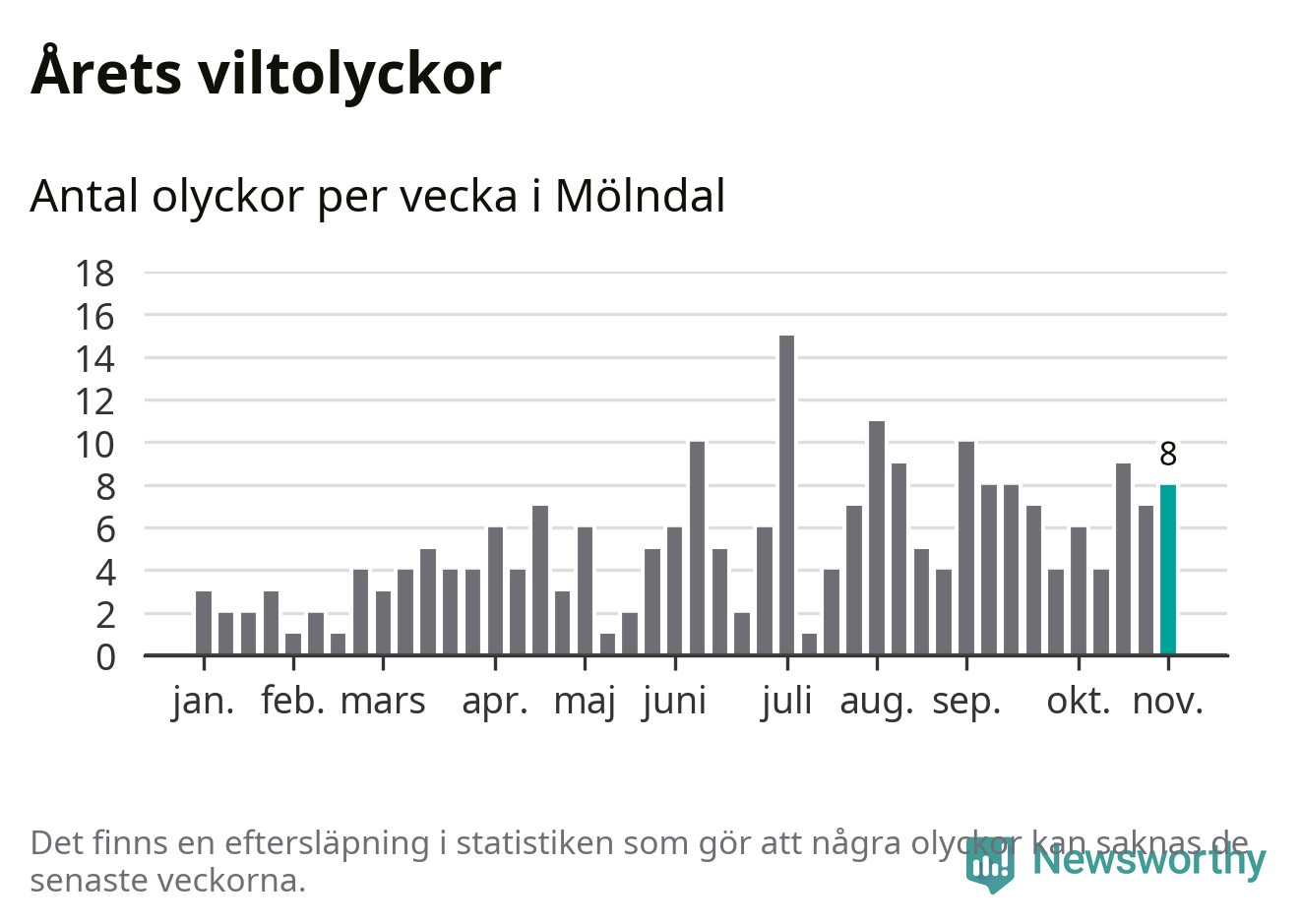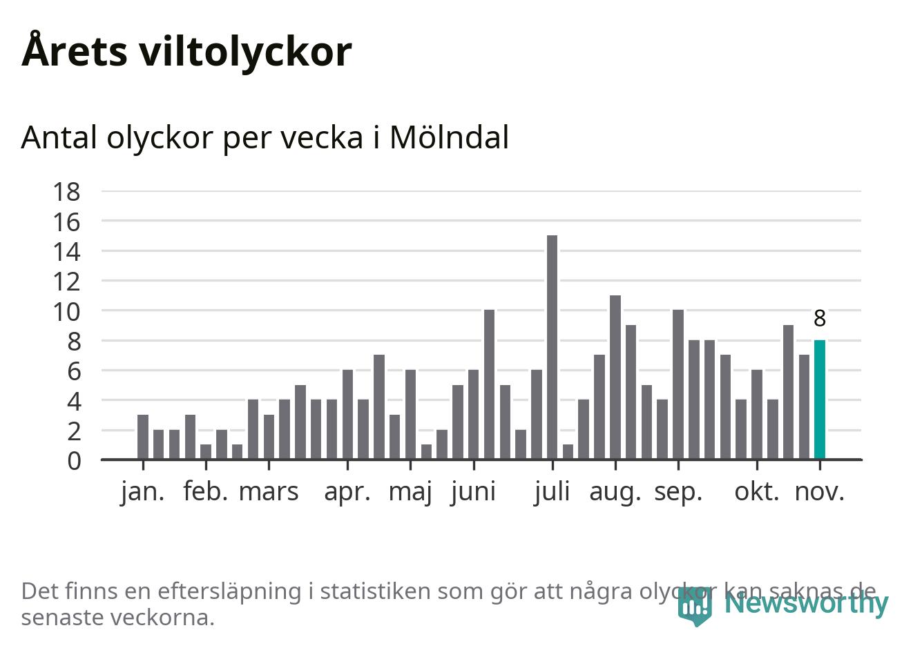 Hittills har åtta viltolyckor rapporterats in i Mölndals kommun från vecka 45. Se listan här.