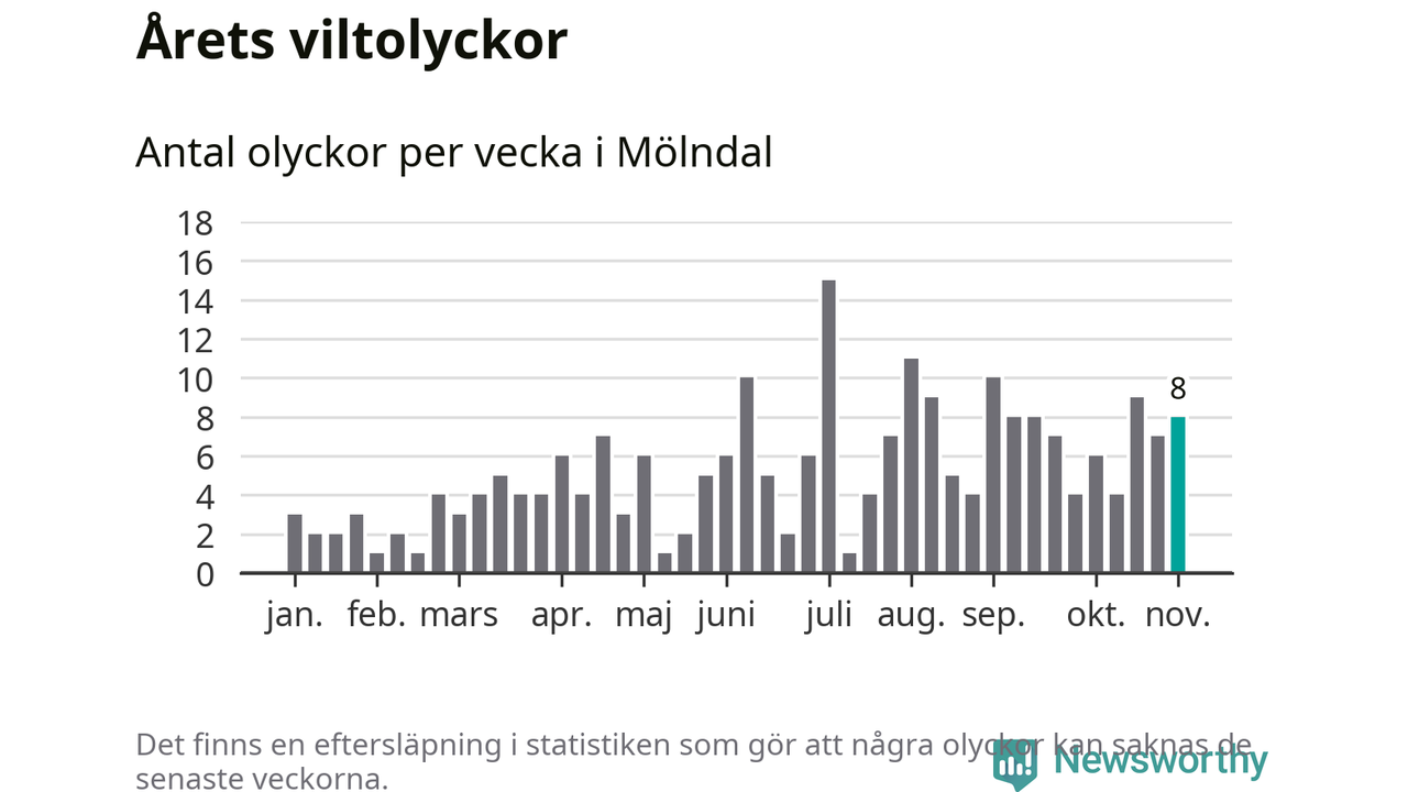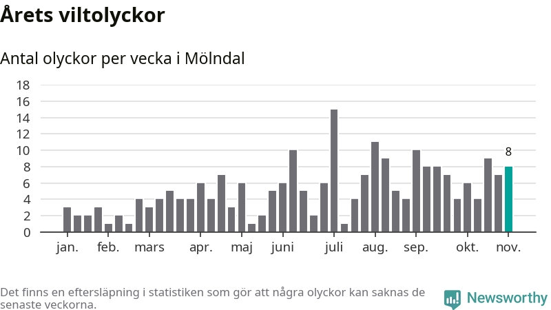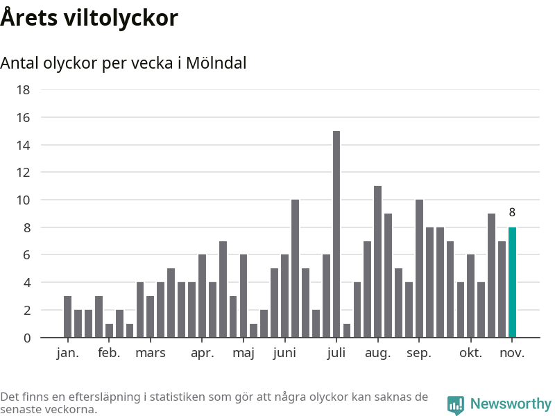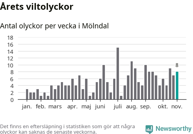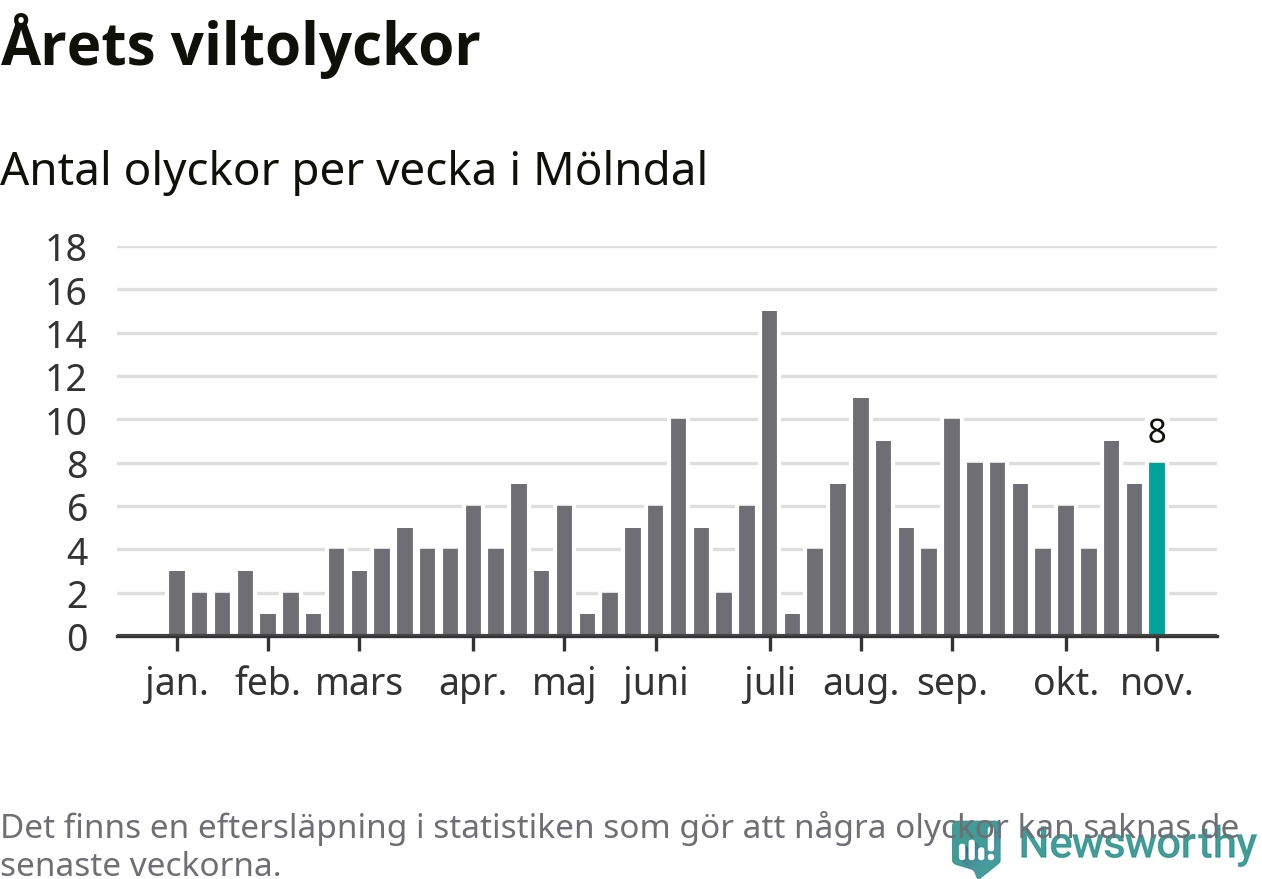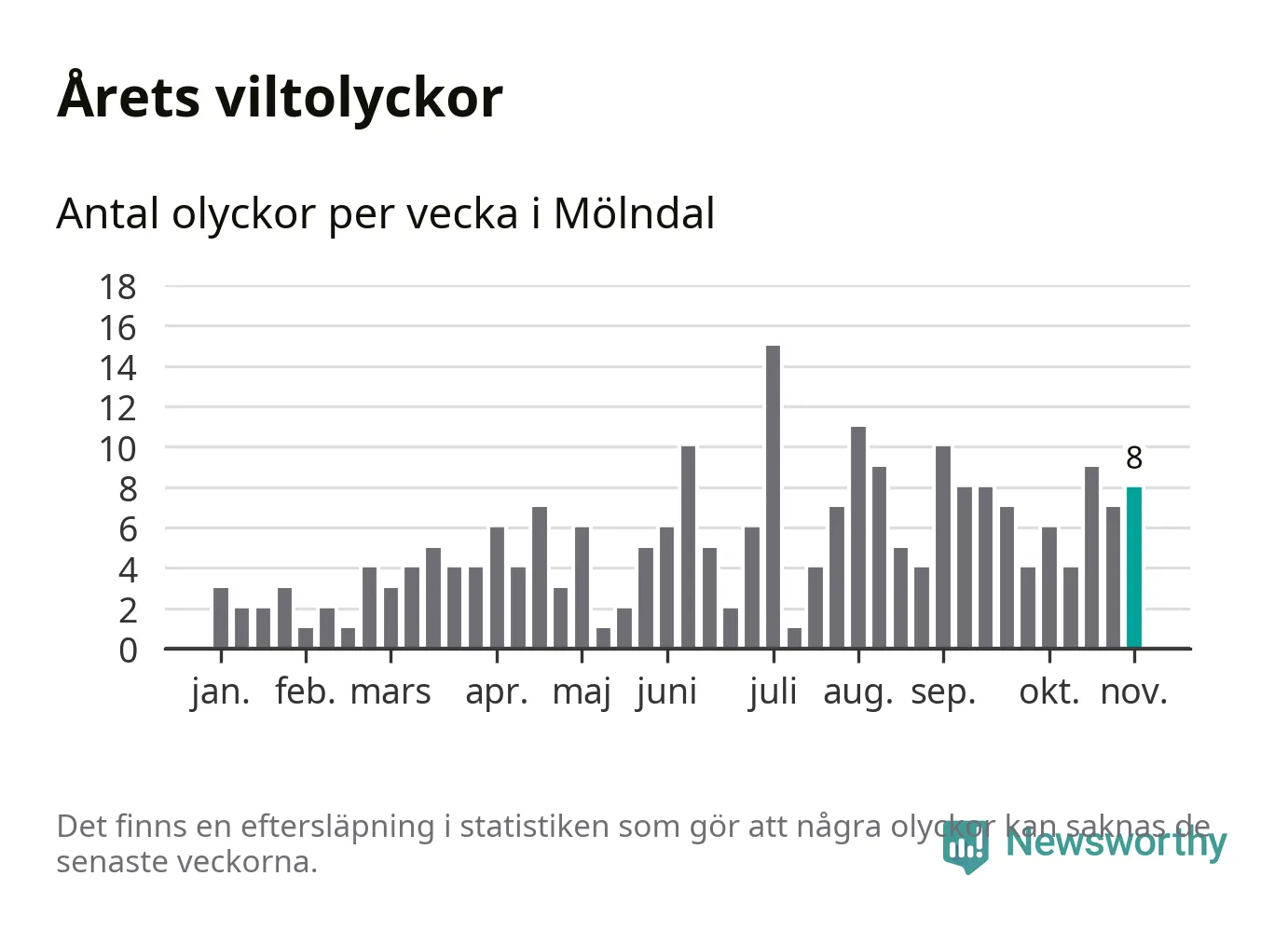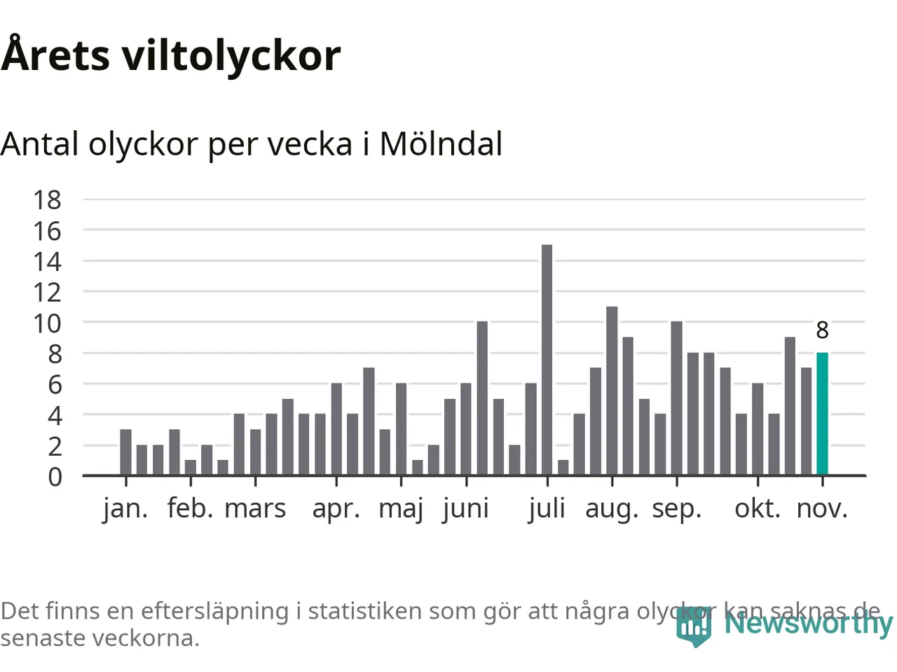 Hittills har åtta viltolyckor rapporterats in i Mölndals kommun från vecka 45. Se listan här.