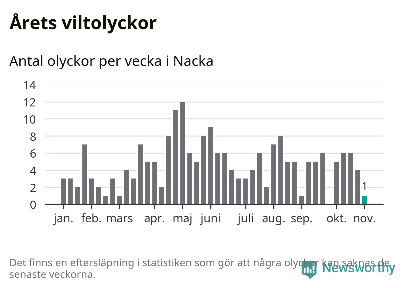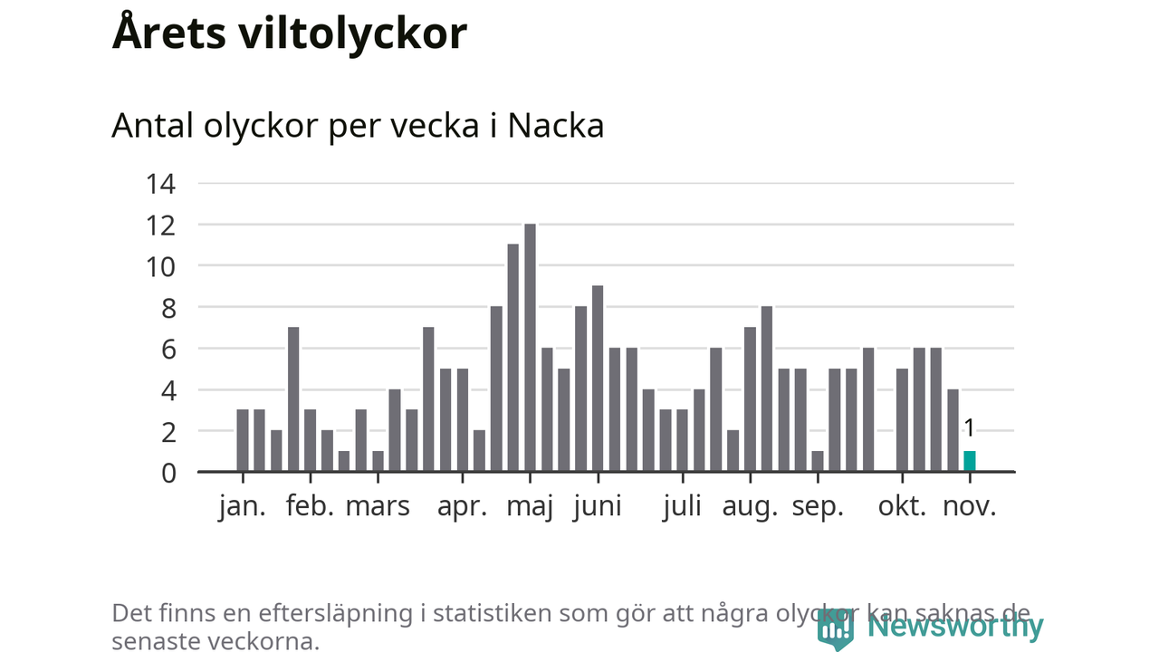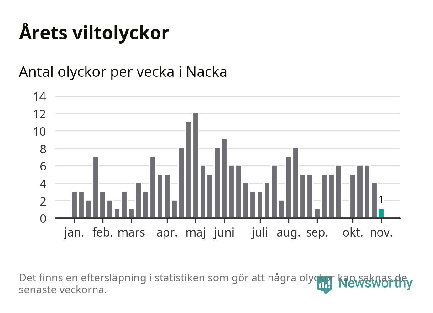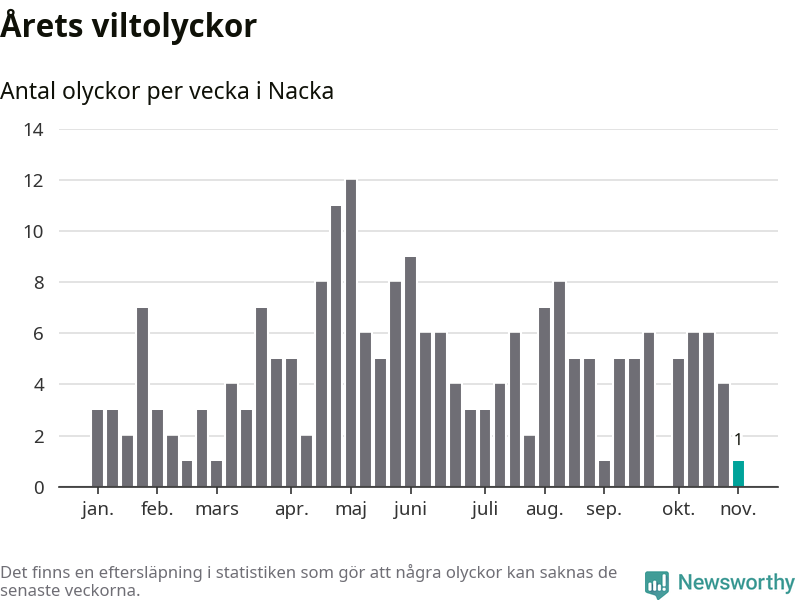 Från förra veckan (vecka 45) har hittills en viltolycka rapporterats in i Nacka kommun.