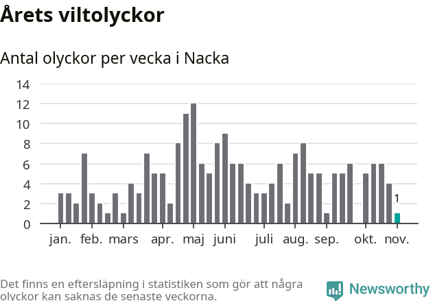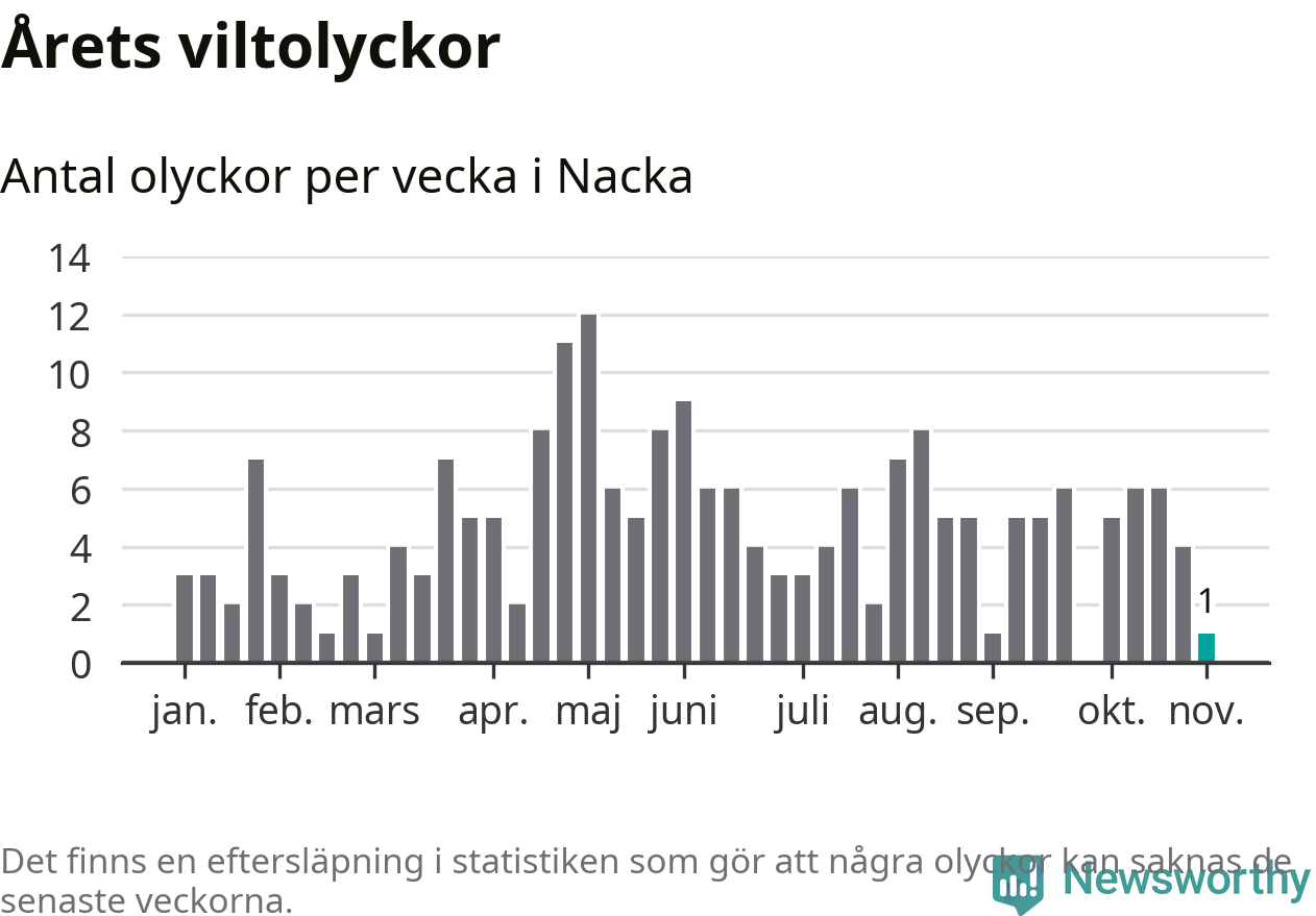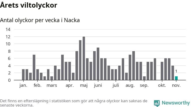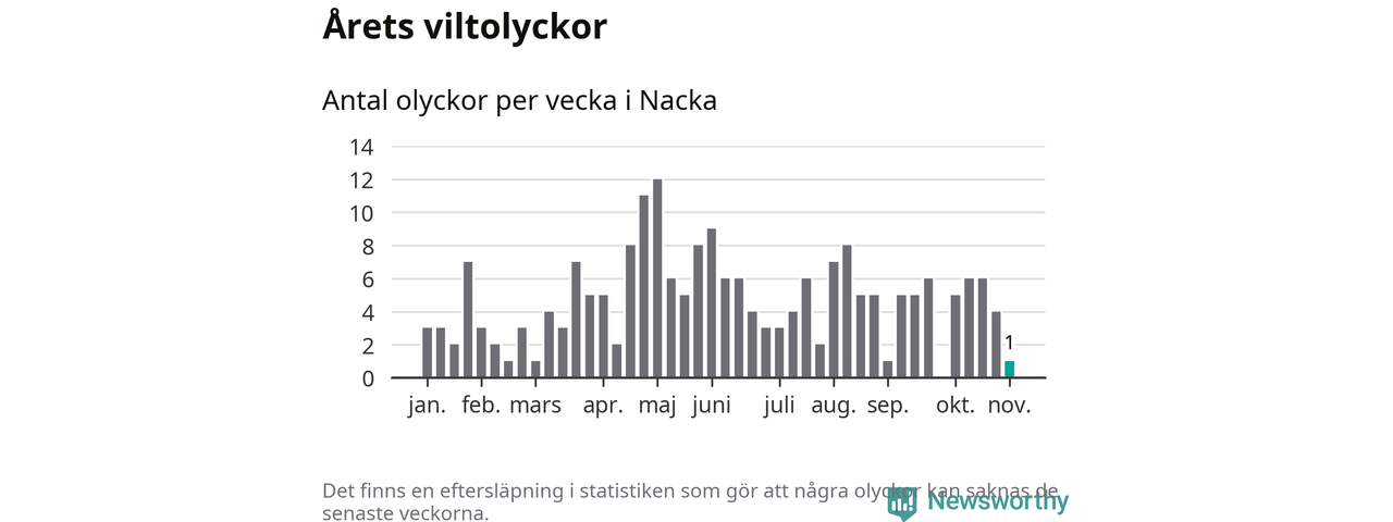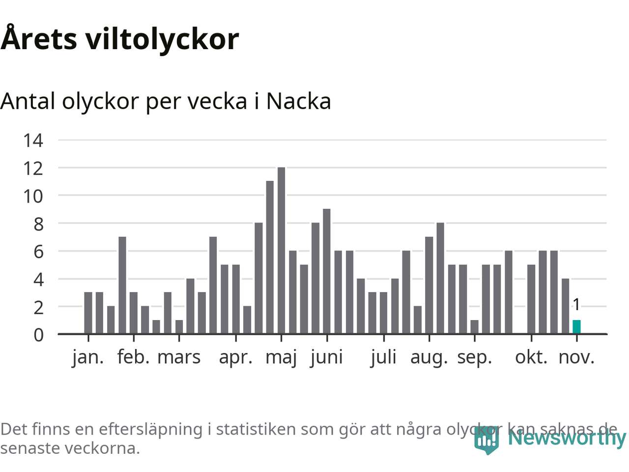 Från förra veckan (vecka 45) har hittills en viltolycka rapporterats in i Nacka kommun.