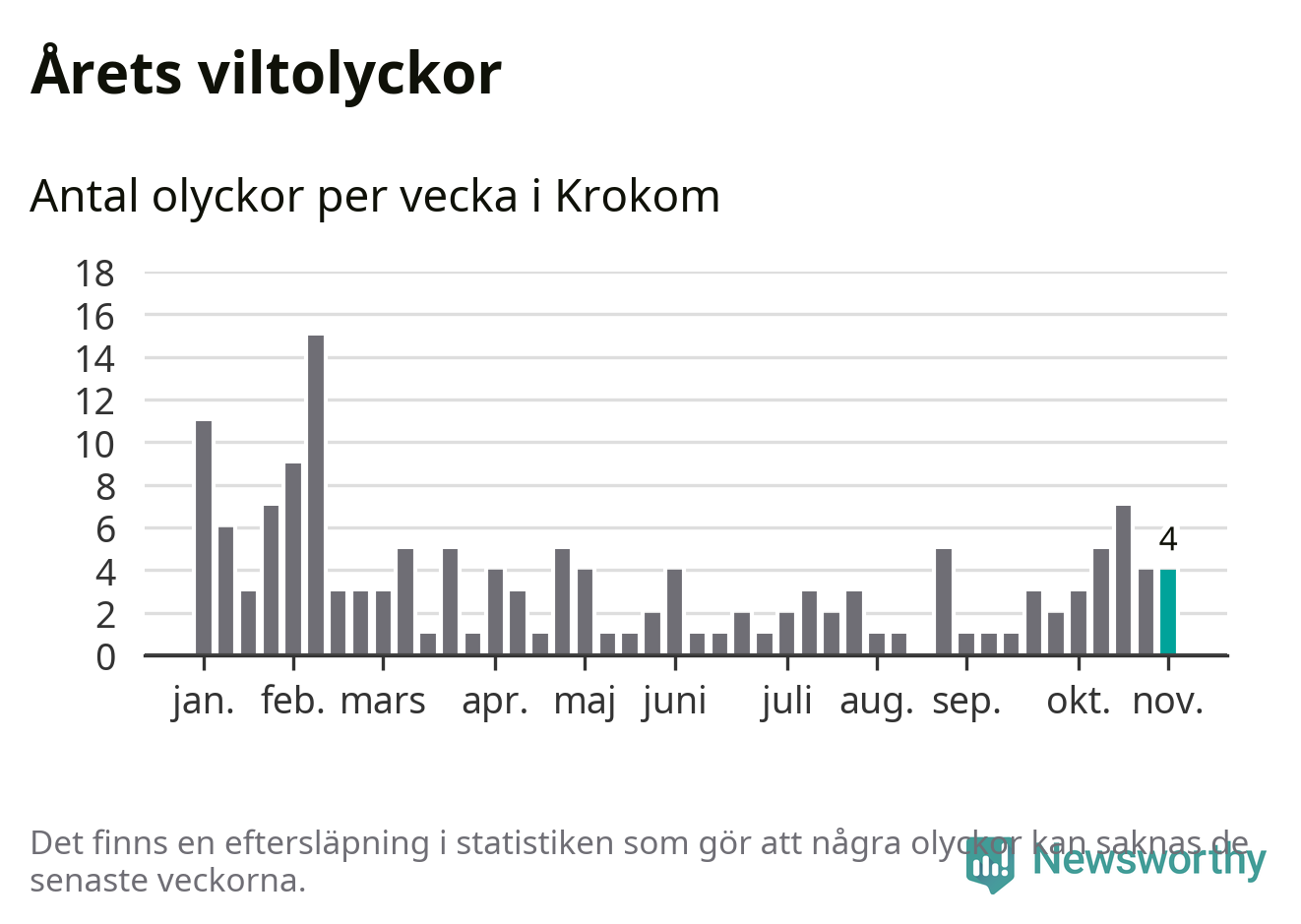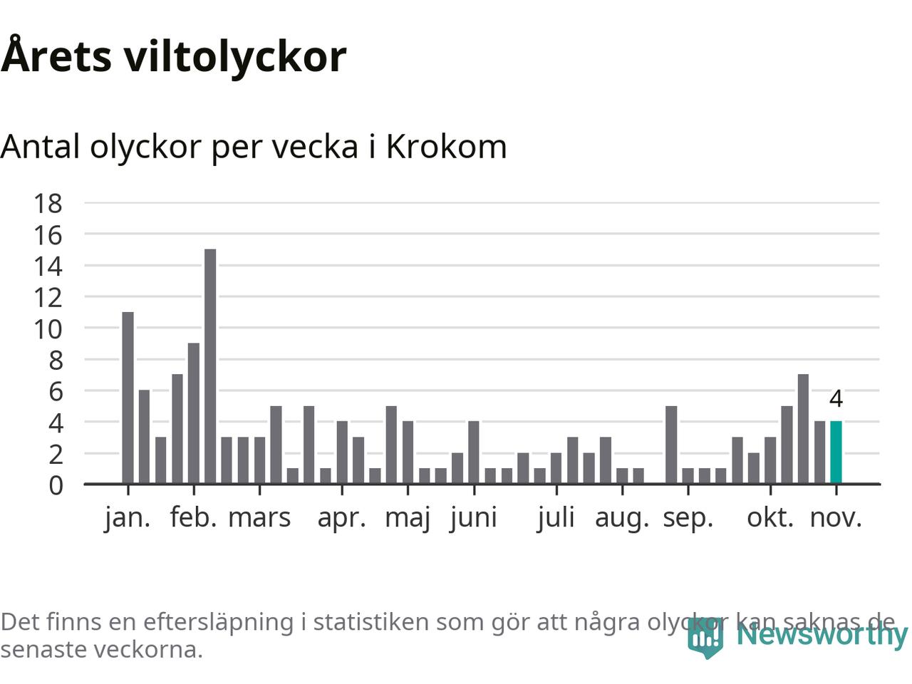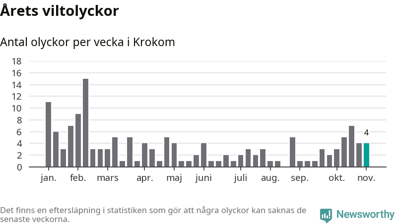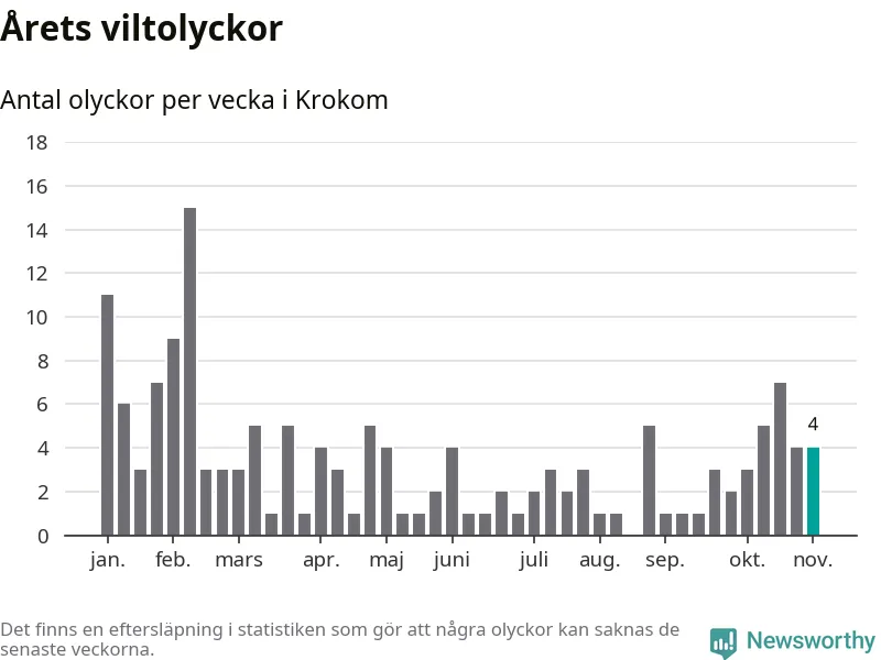 Hittills har fyra viltolyckor rapporterats in i Krokoms kommun från vecka 45. Se listan här.