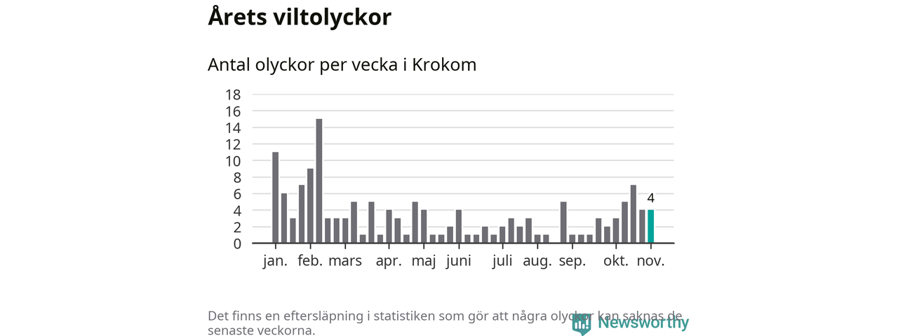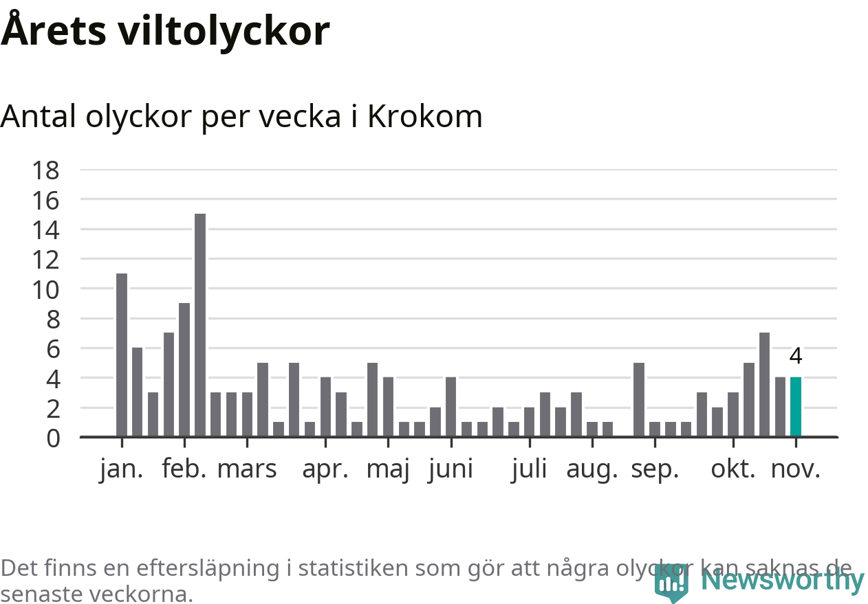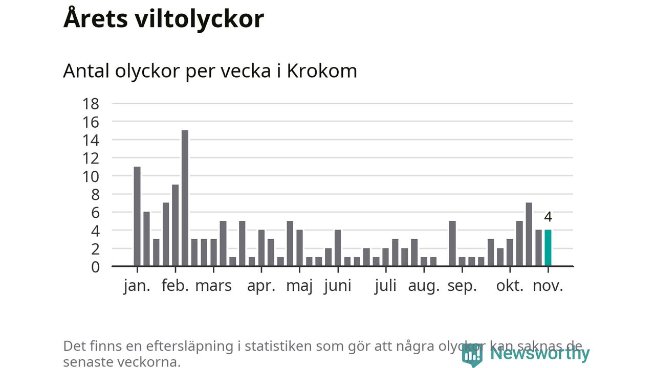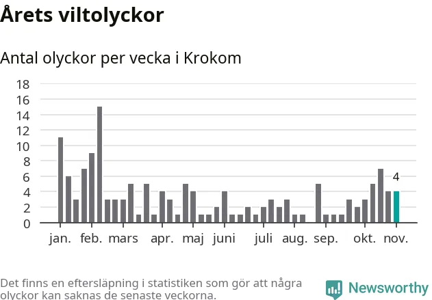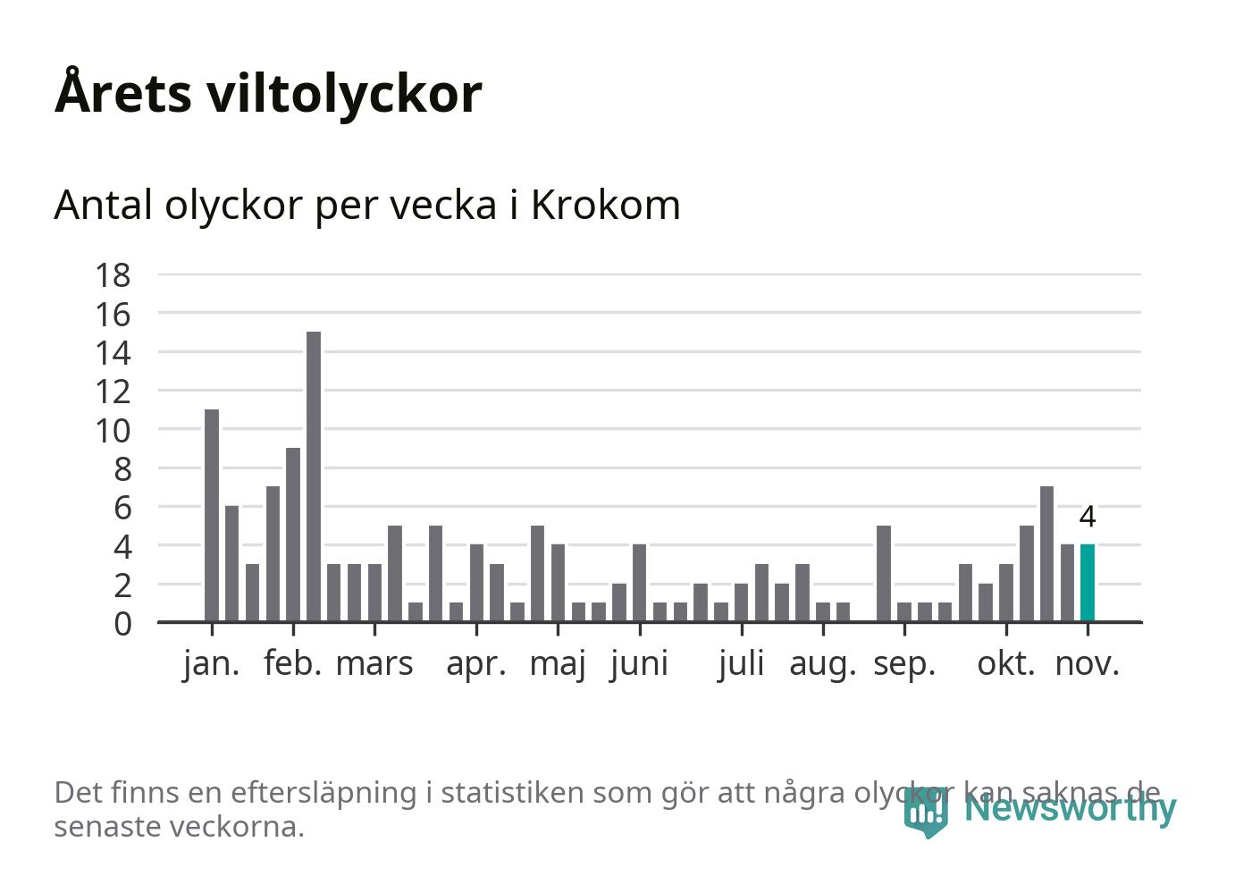Hittills har fyra viltolyckor rapporterats in i Krokoms kommun från vecka 45. Se listan här.