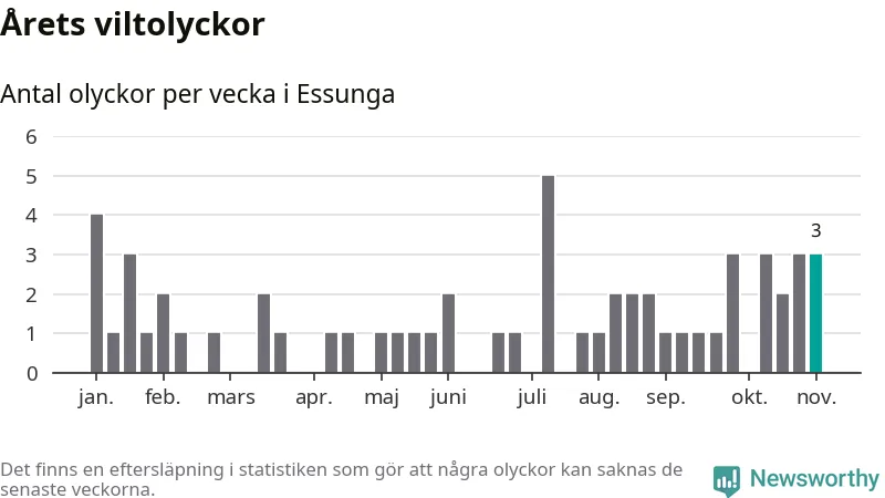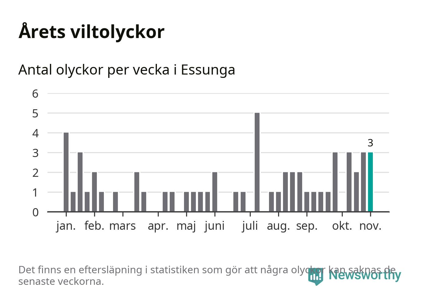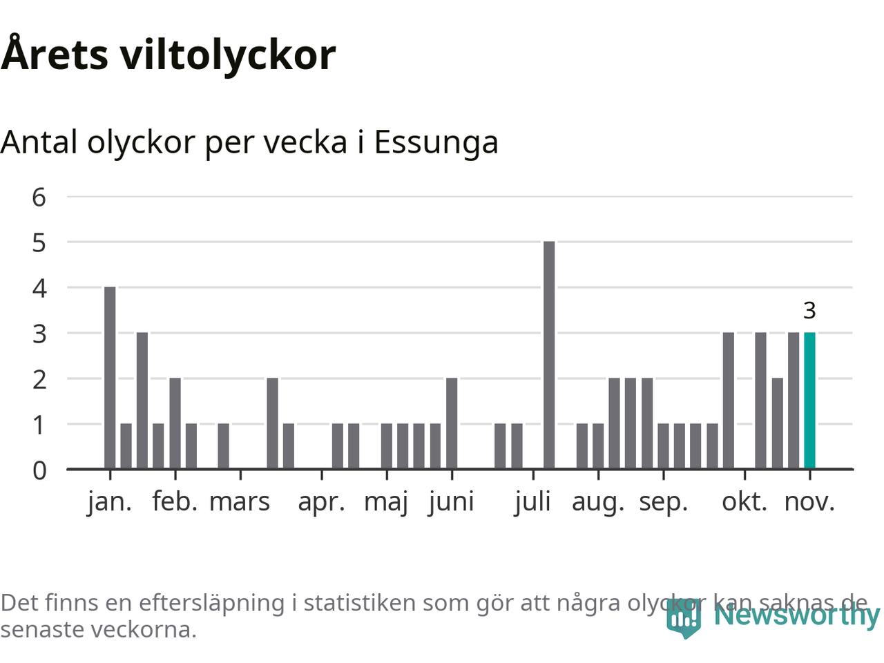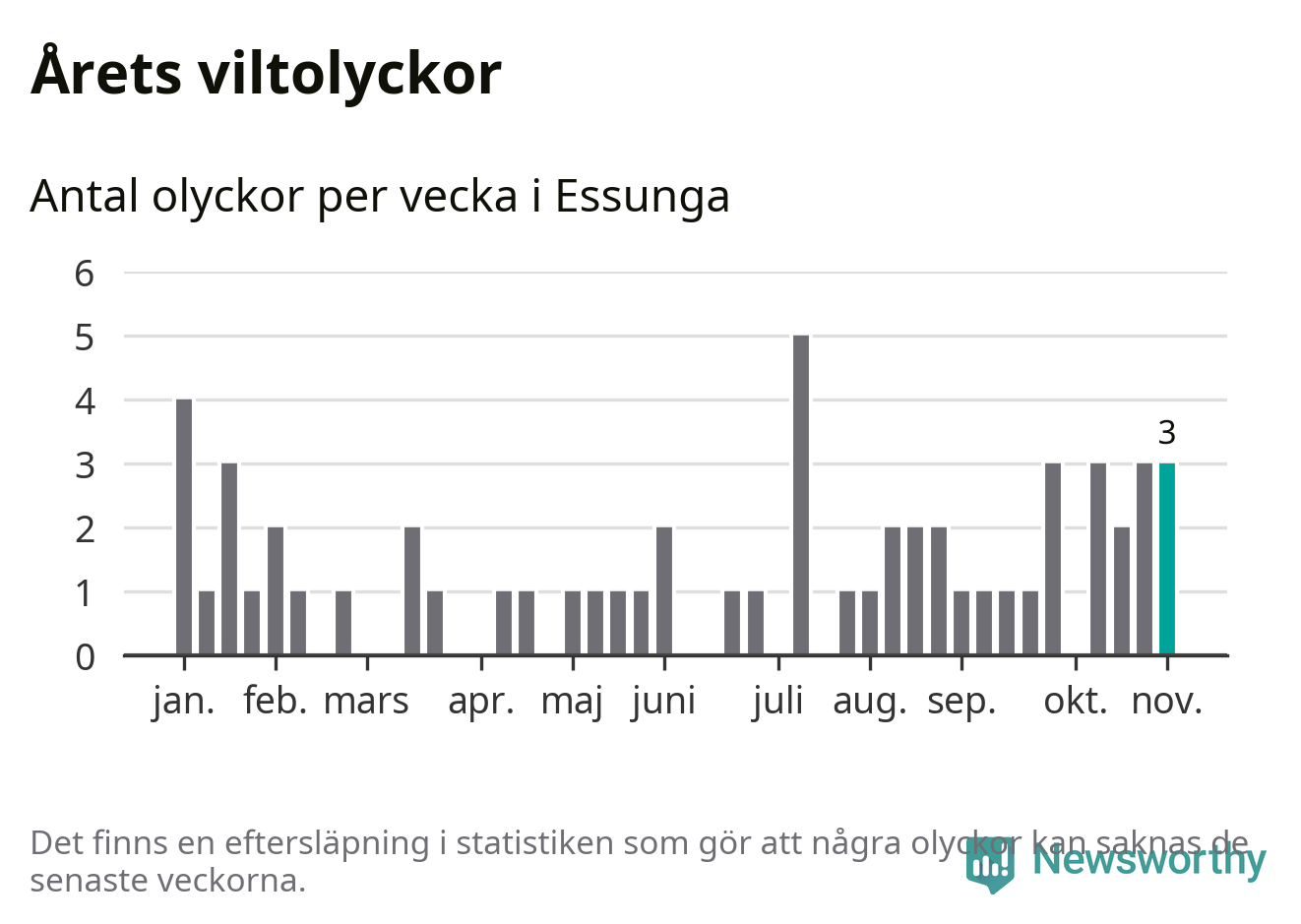 Hittills har tre viltolyckor rapporterats in i Essunga kommun från vecka 45. Se listan här.