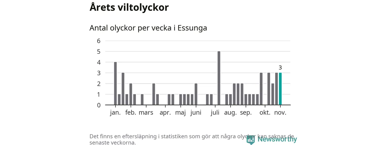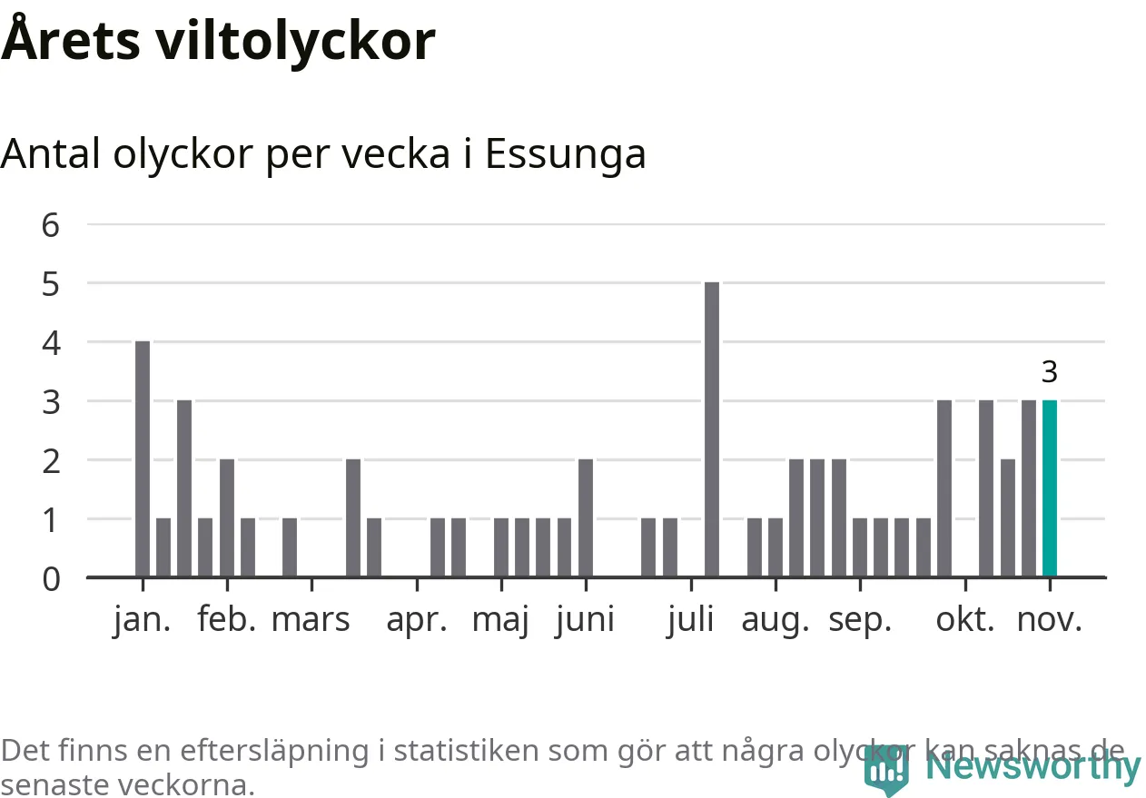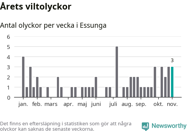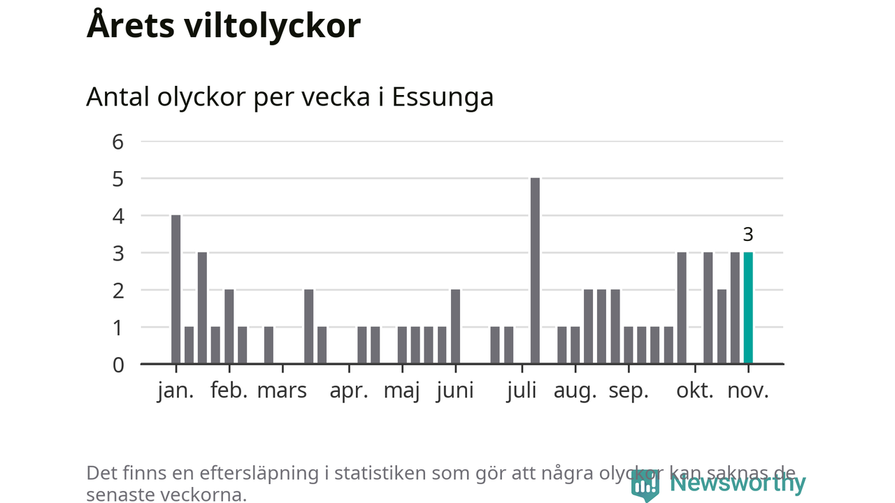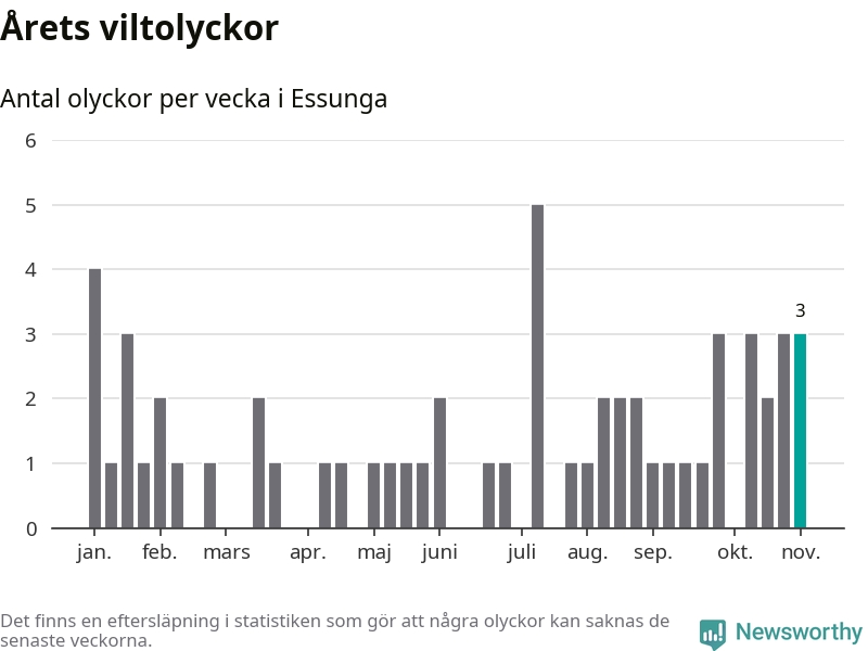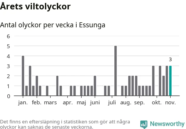 Hittills har tre viltolyckor rapporterats in i Essunga kommun från vecka 45. Se listan här.