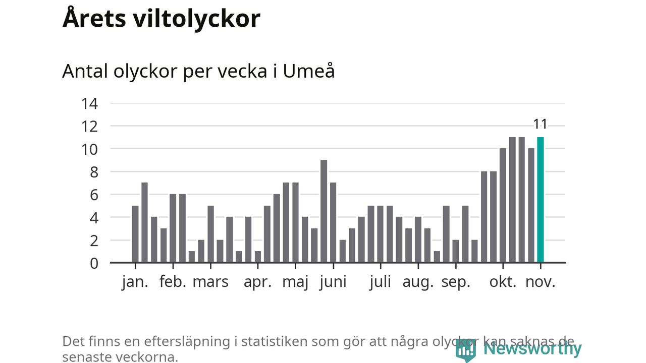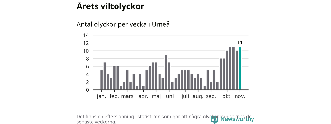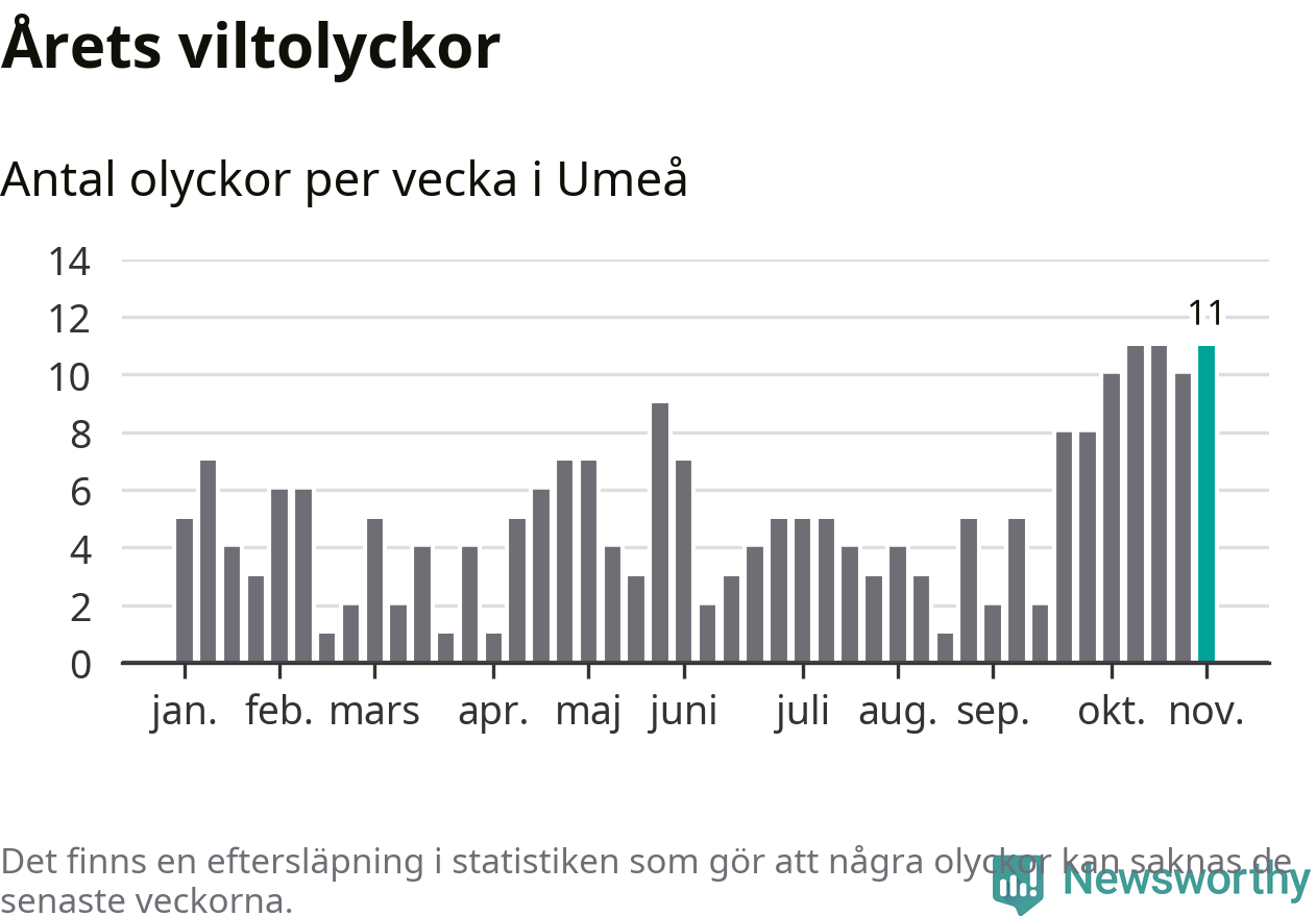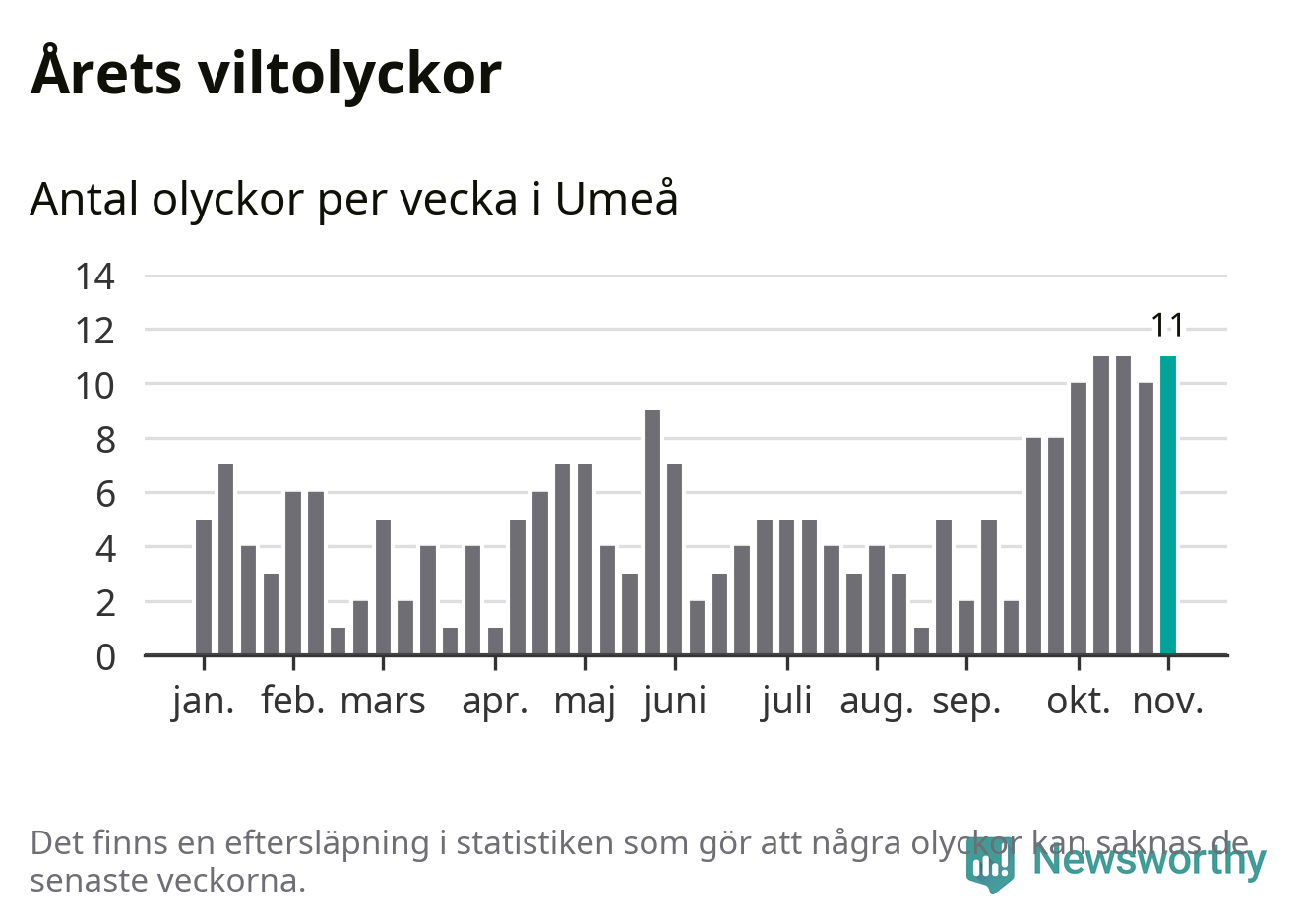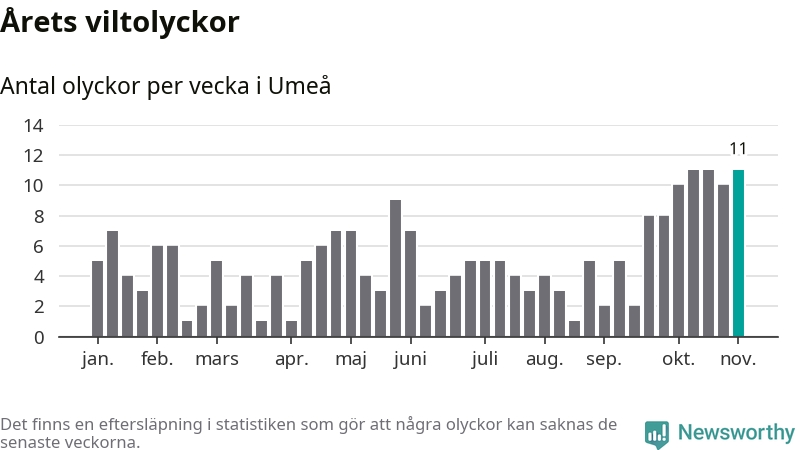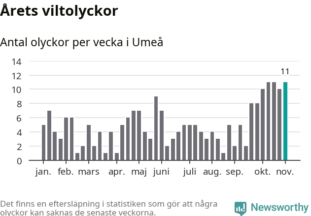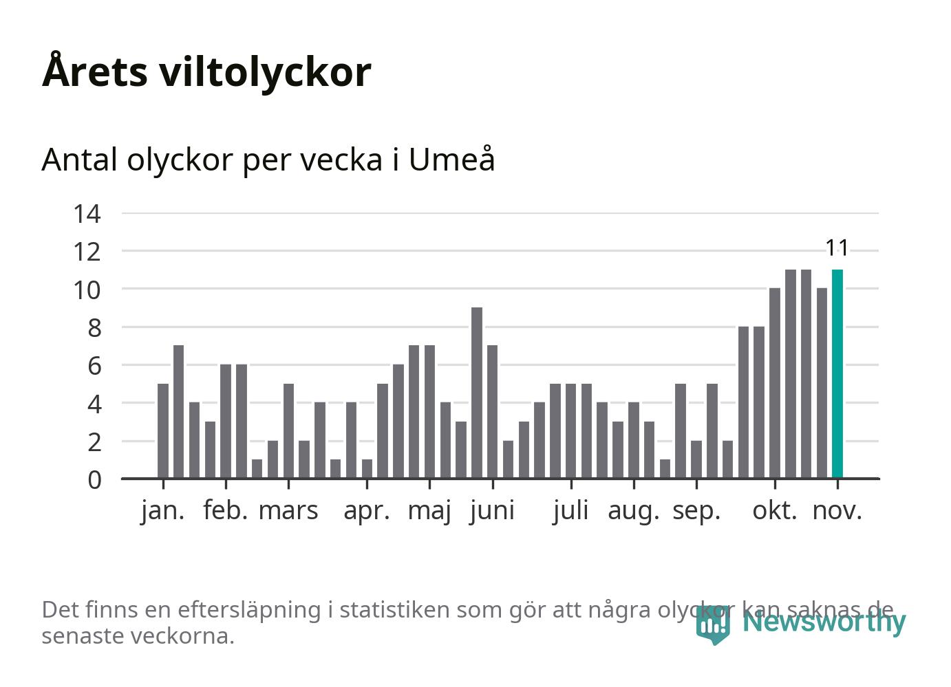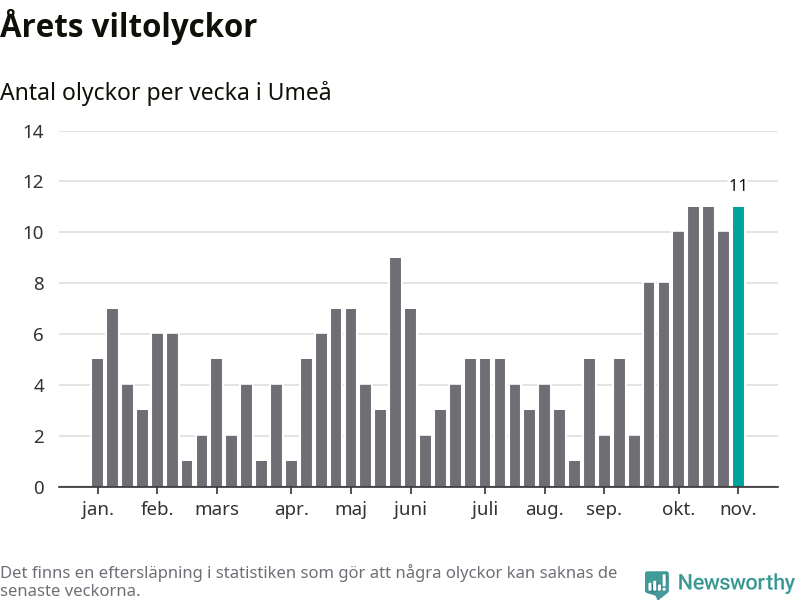 sett till de senaste tio årens statistik. I statistiken ingår inte olyckor med ren, som här räknas som tamdjur.