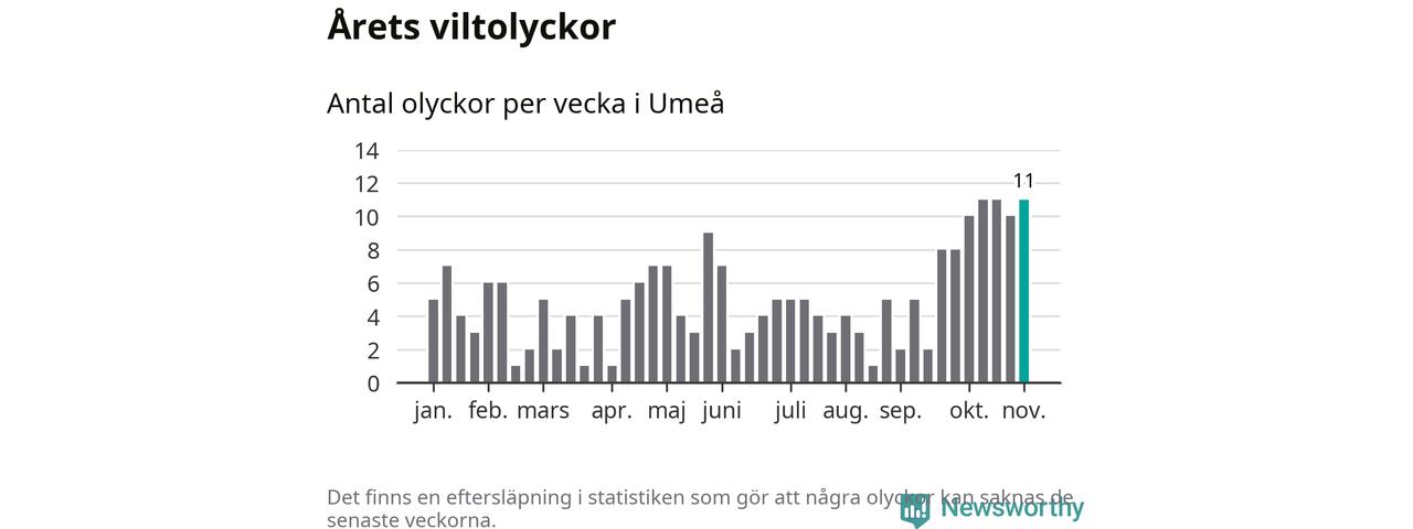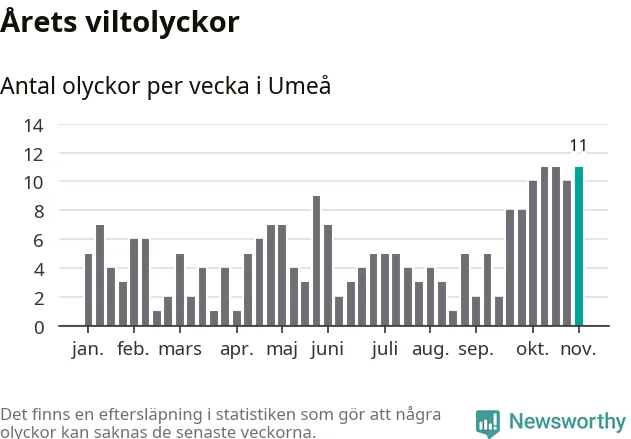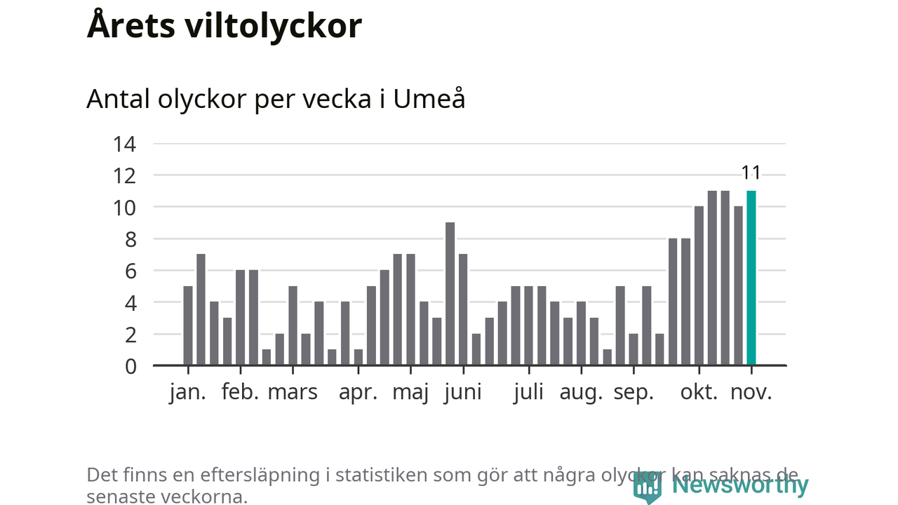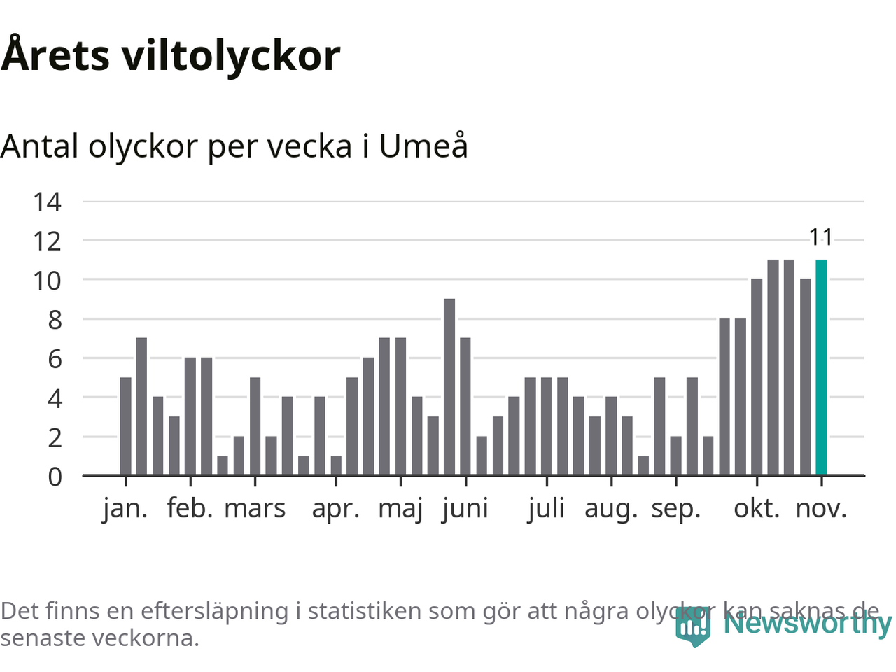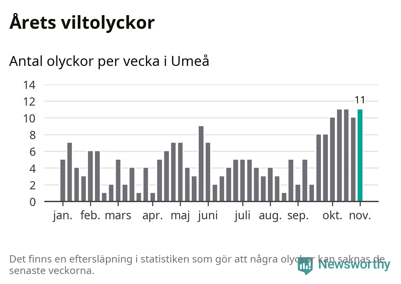 227 viltolyckor i kommunen. Det är en normal nivå i förhållande till hur det har sett ut under de senaste tio åren – genomsnittet för motsvarande period är 210.