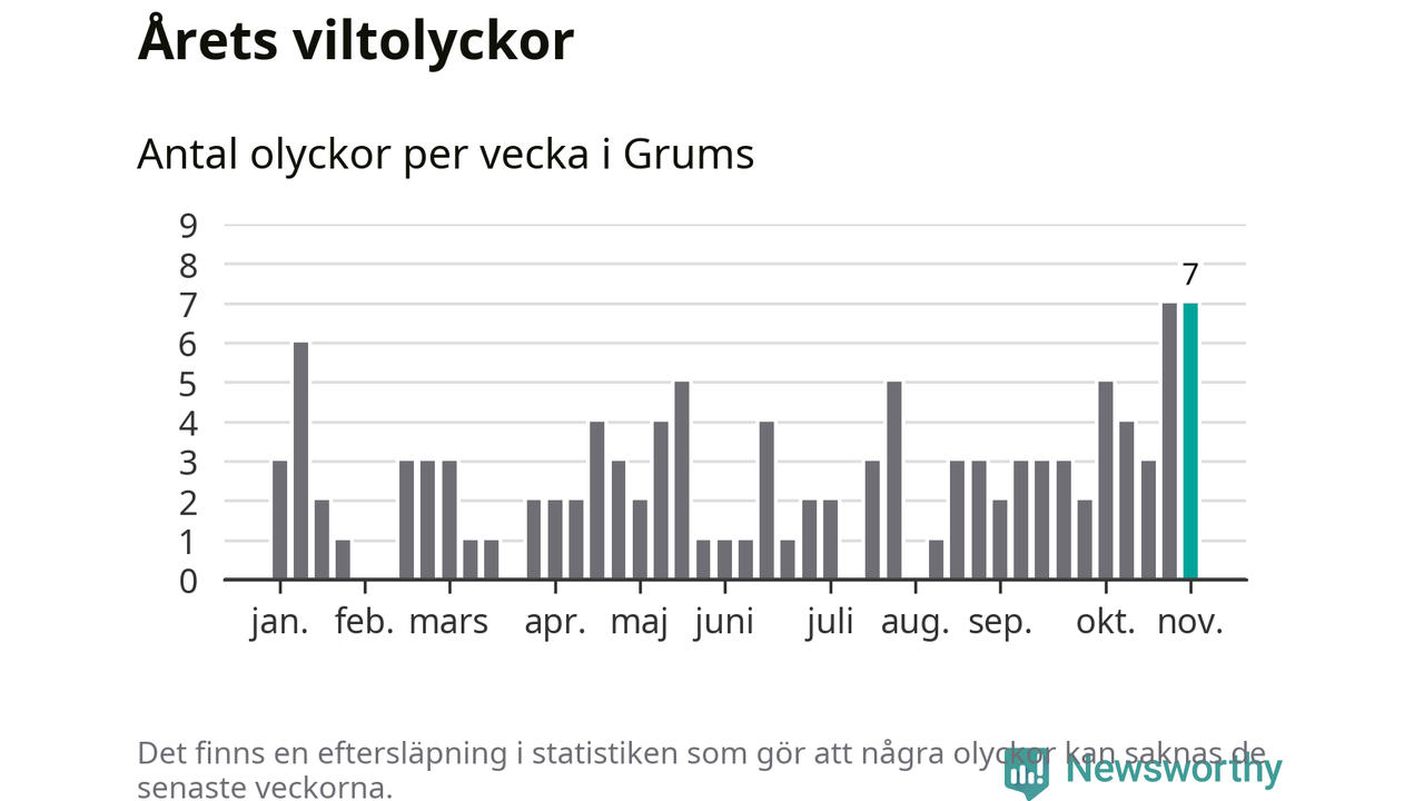 113 viltolyckor i kommunen. Det är en normal nivå i förhållande till hur det har sett ut under de senaste tio åren – genomsnittet för motsvarande period är 116.