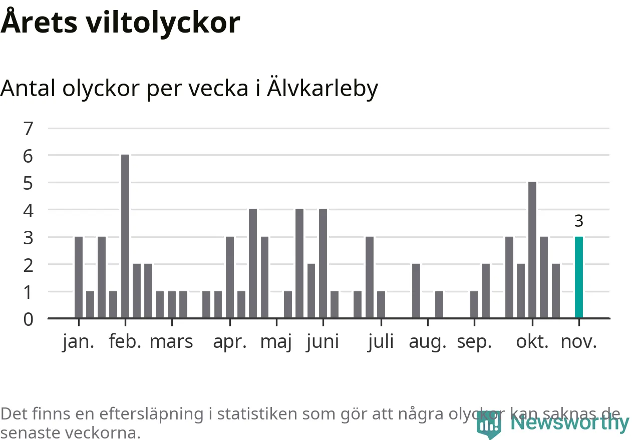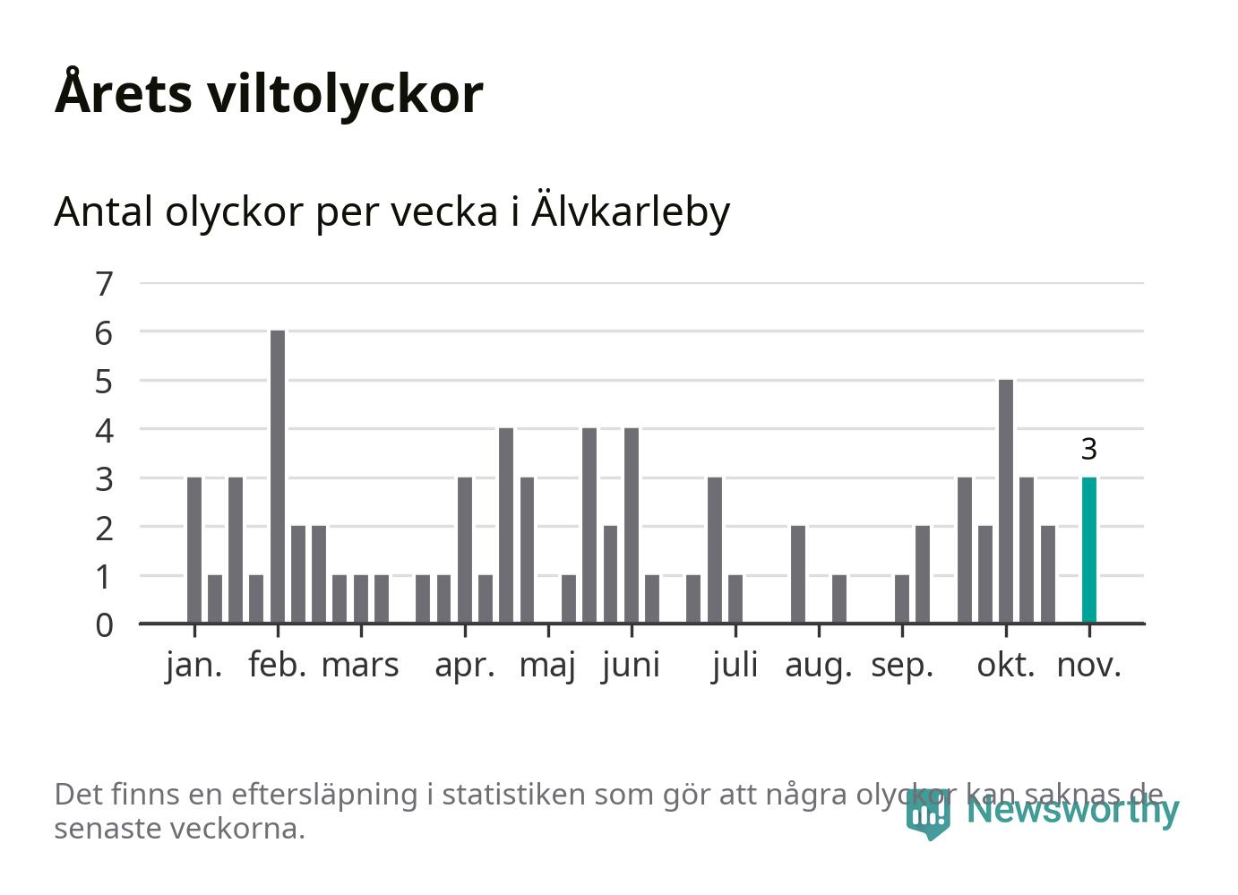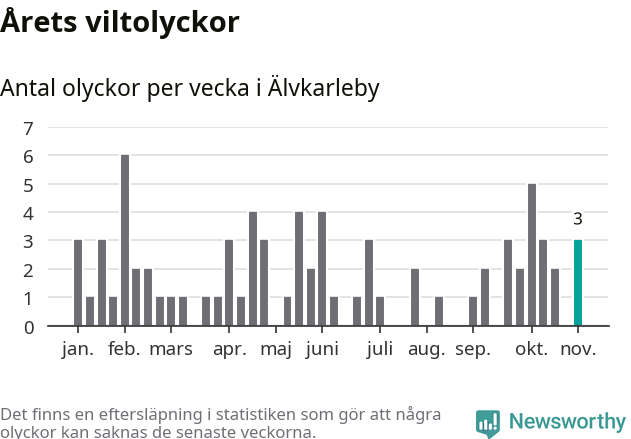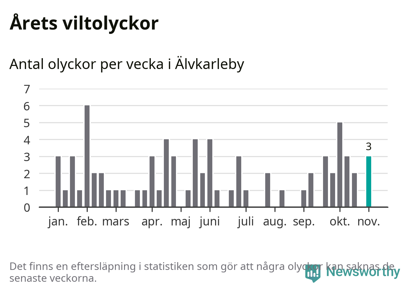 Hittills har tre viltolyckor rapporterats in i Älvkarleby kommun från vecka 45. Se listan här.