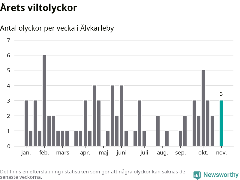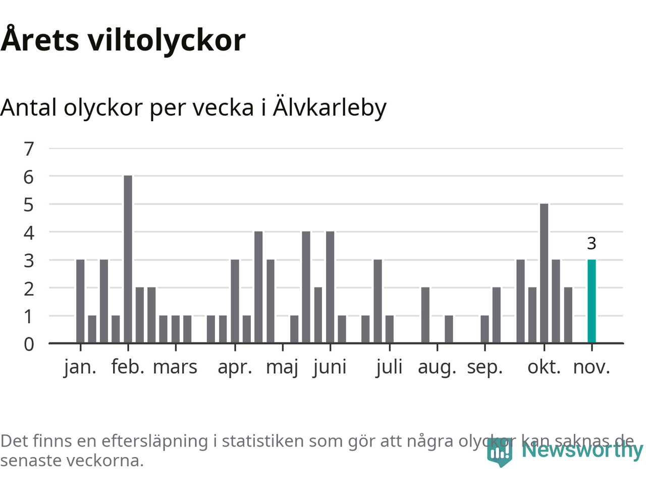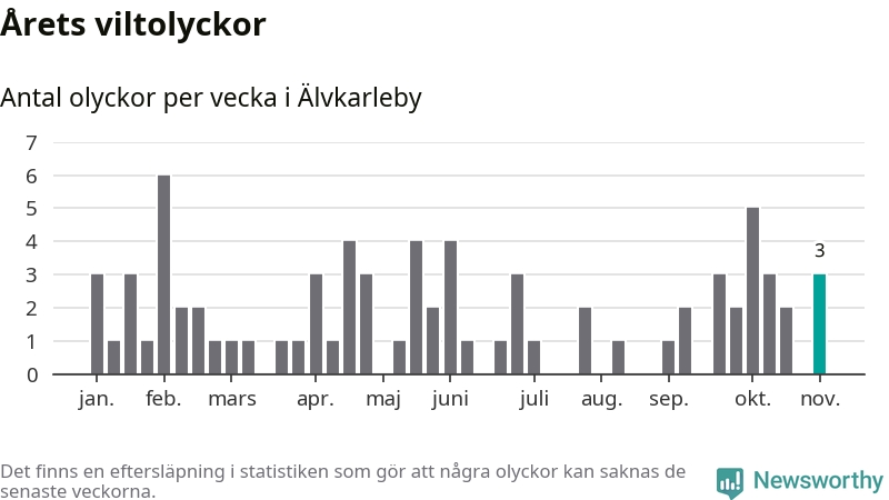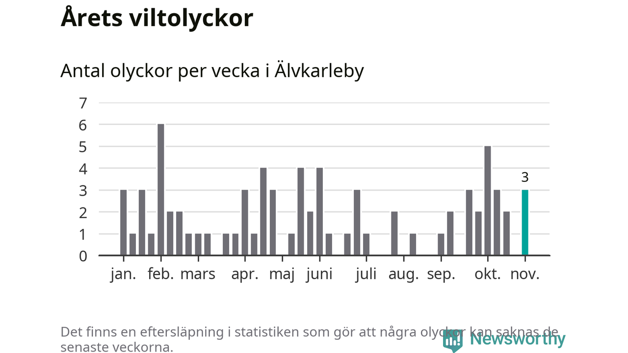 Hittills har tre viltolyckor rapporterats in i Älvkarleby kommun från vecka 45. Se listan här.