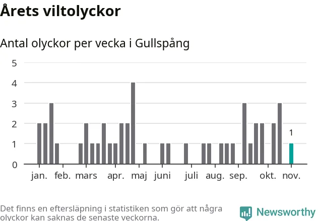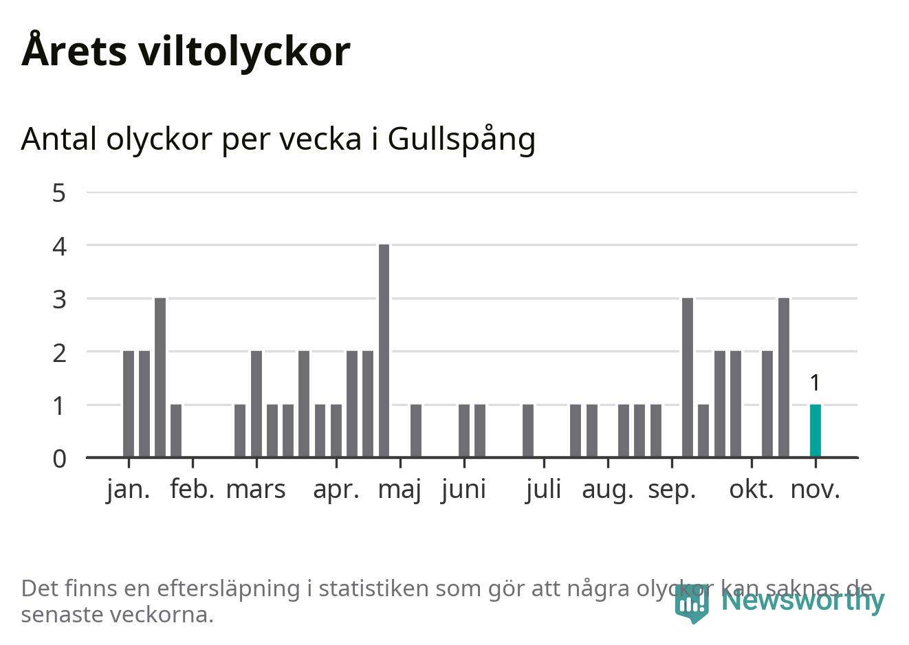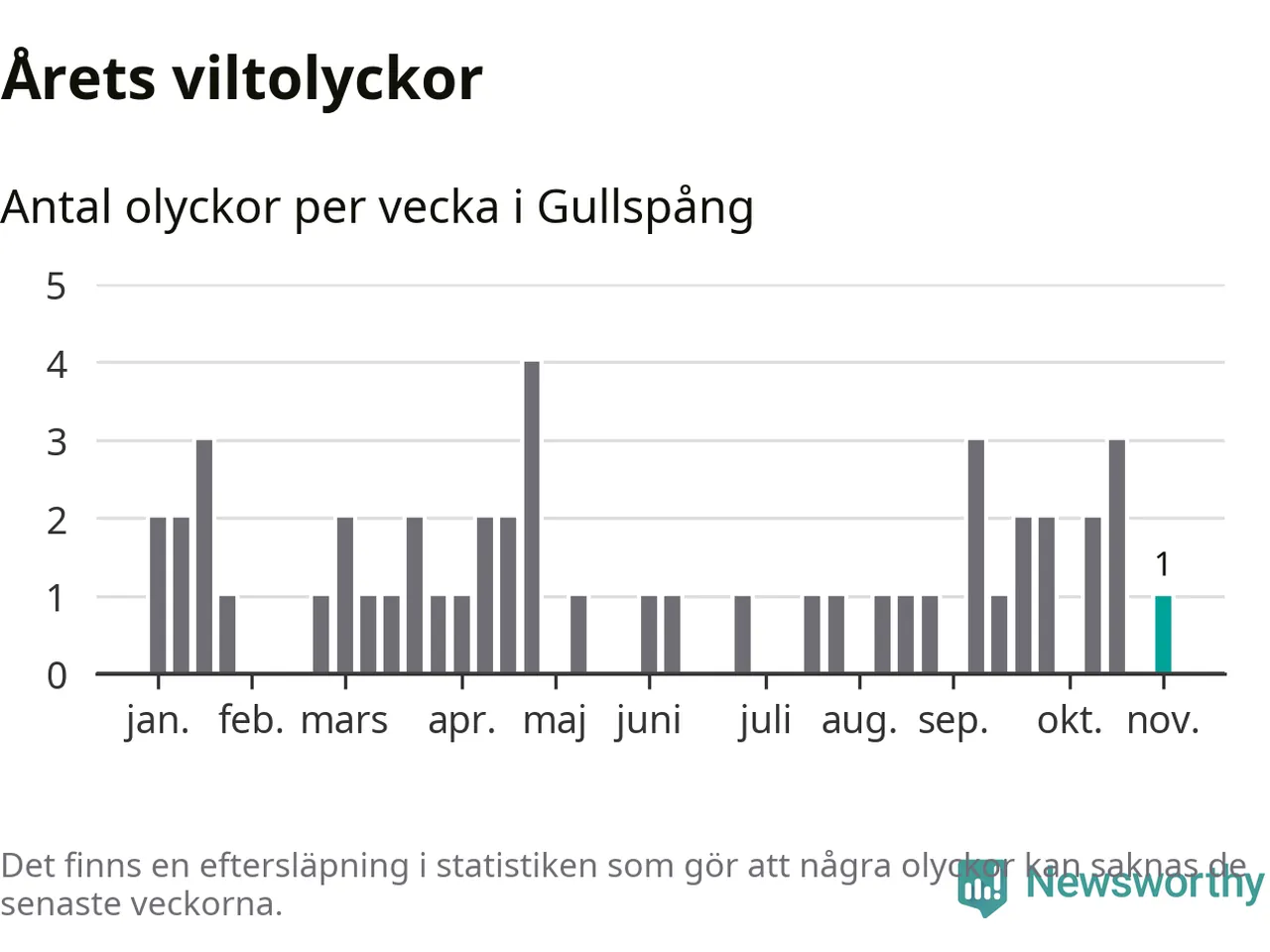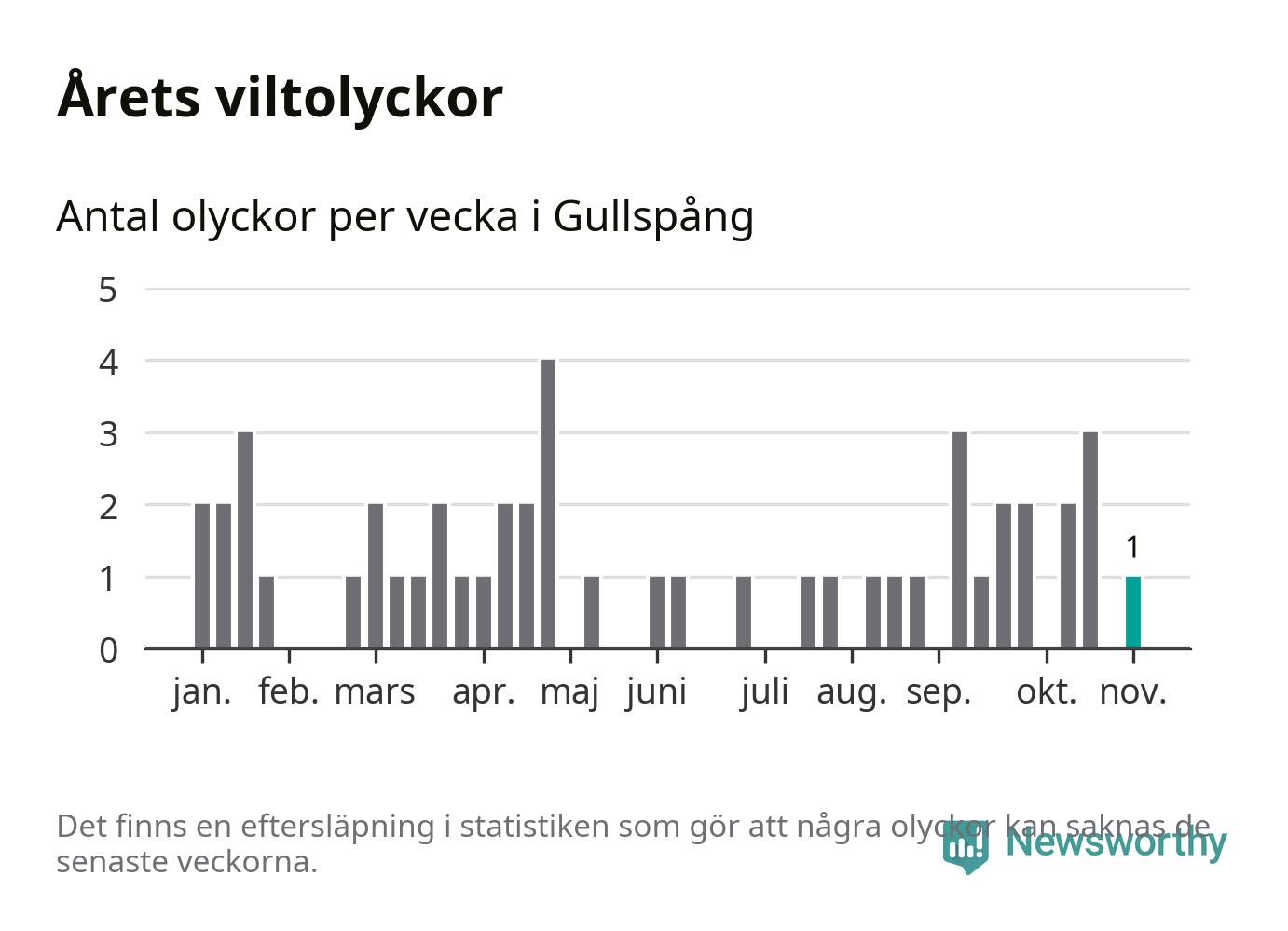 Från förra veckan (vecka 45) har hittills en viltolycka rapporterats in i Gullspångs kommun.