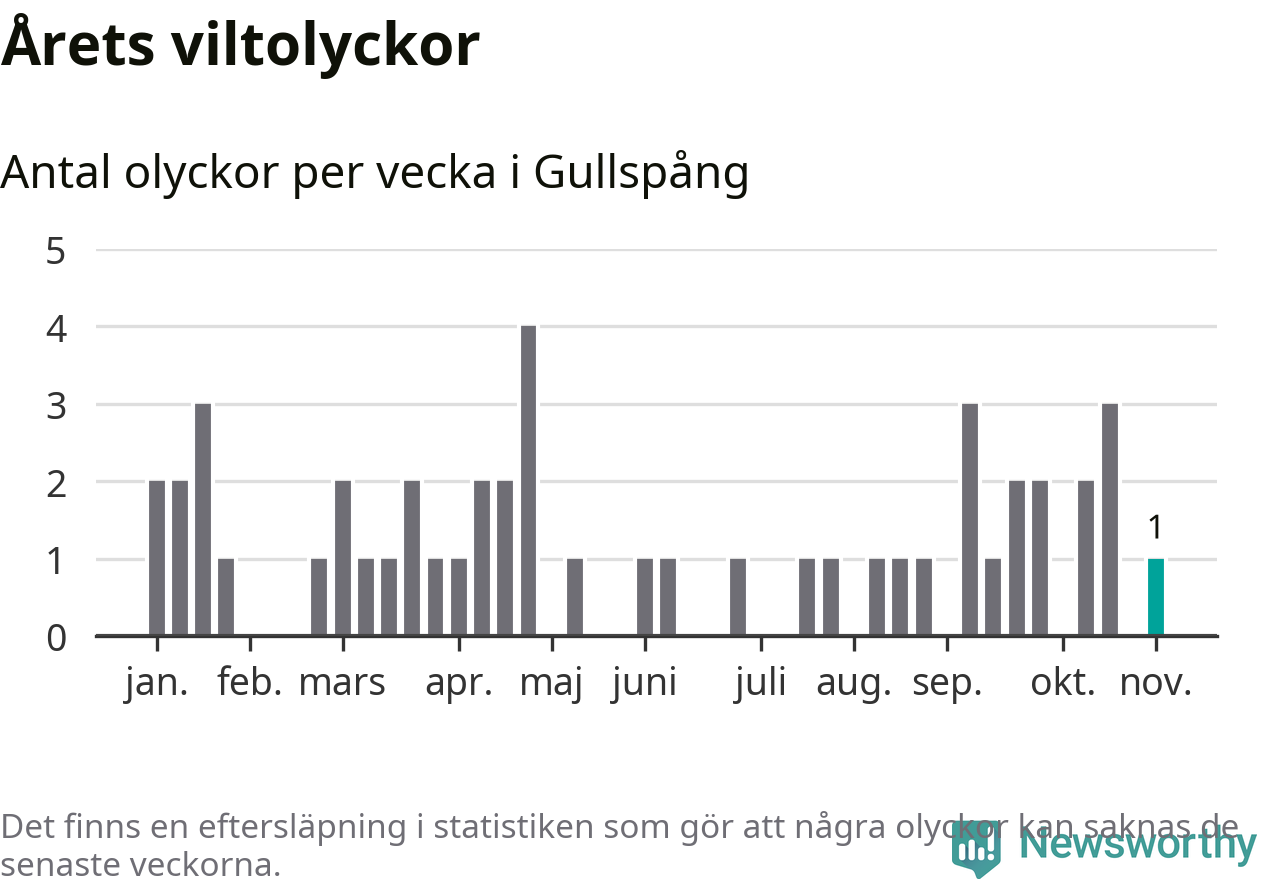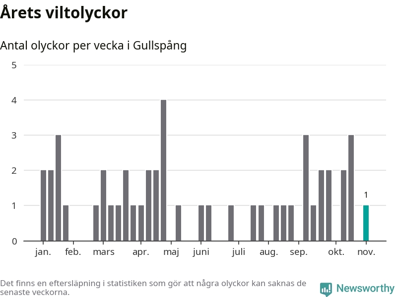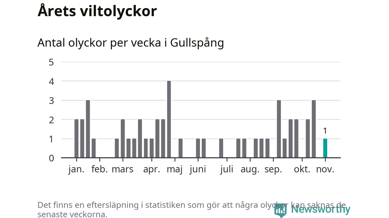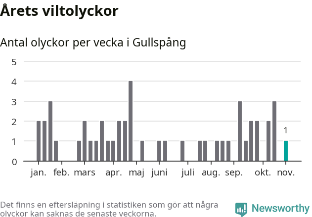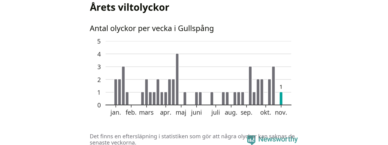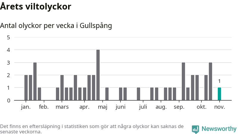 Från förra veckan (vecka 45) har hittills en viltolycka rapporterats in i Gullspångs kommun.