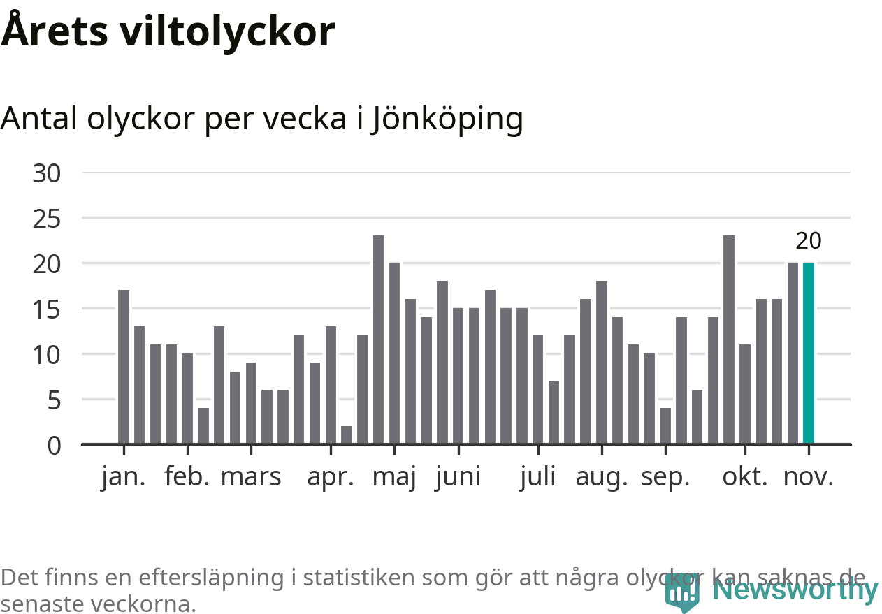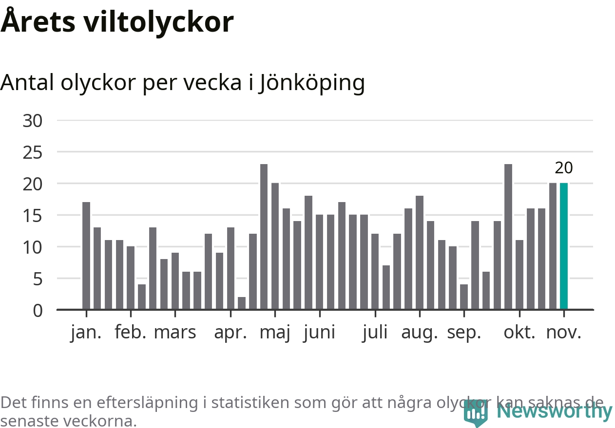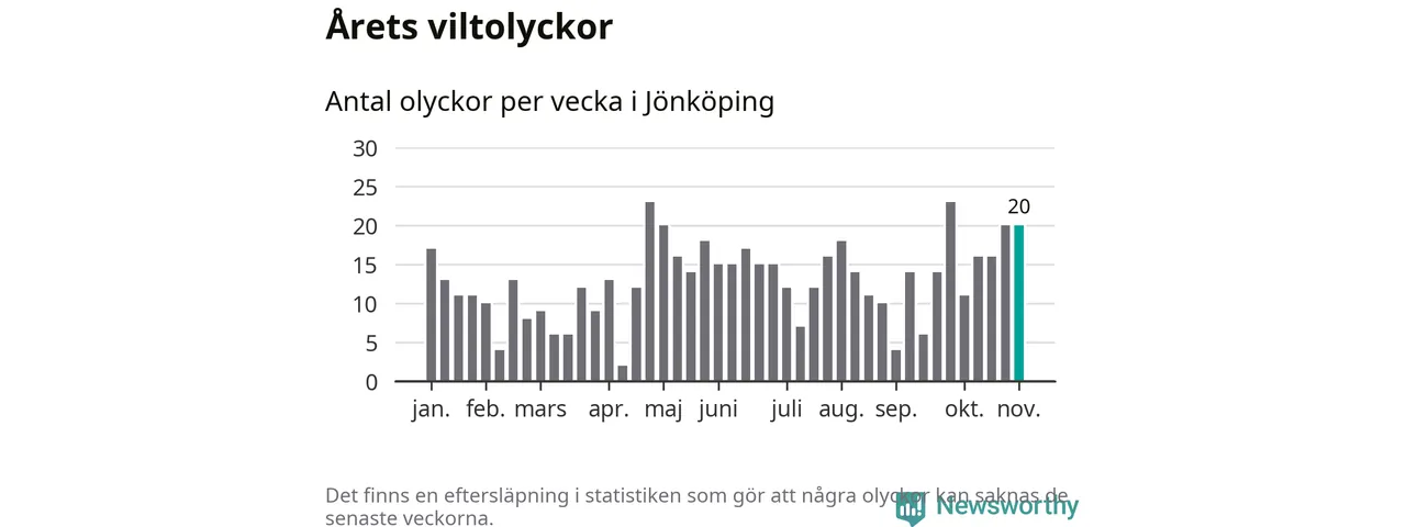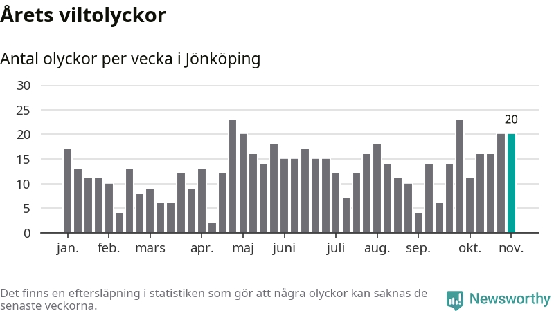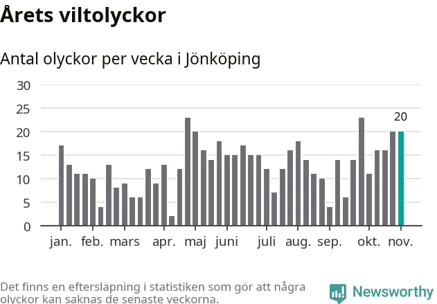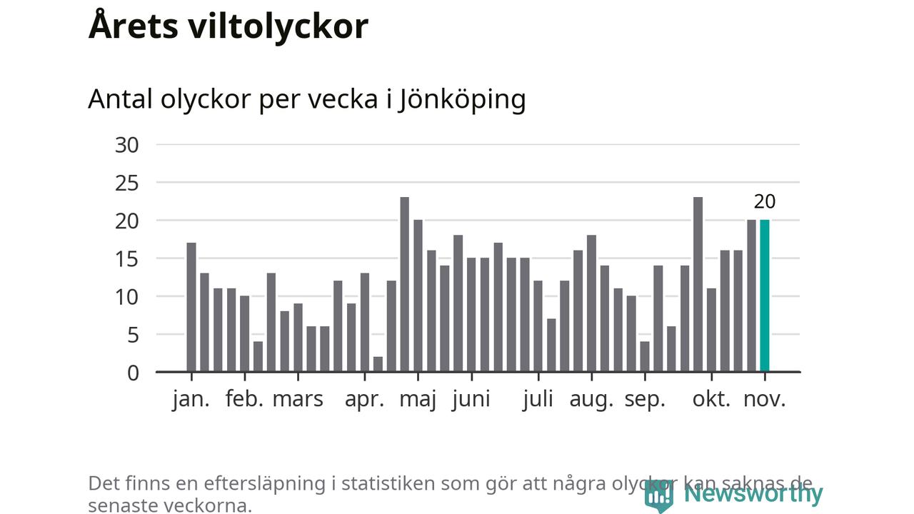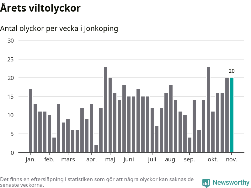 Hittills har 20 viltolyckor rapporterats in i Jönköpings kommun från vecka 45. Se listan här.