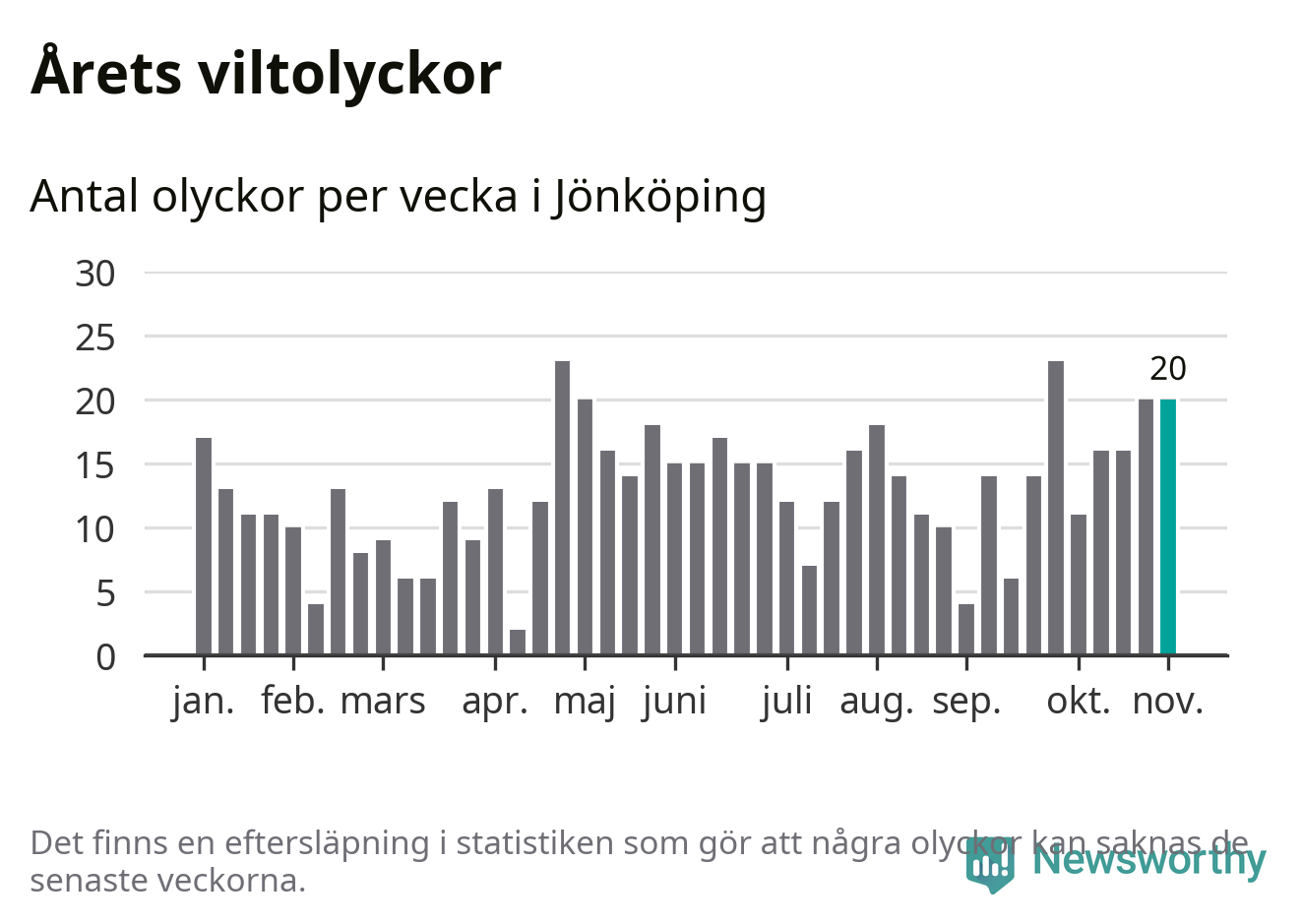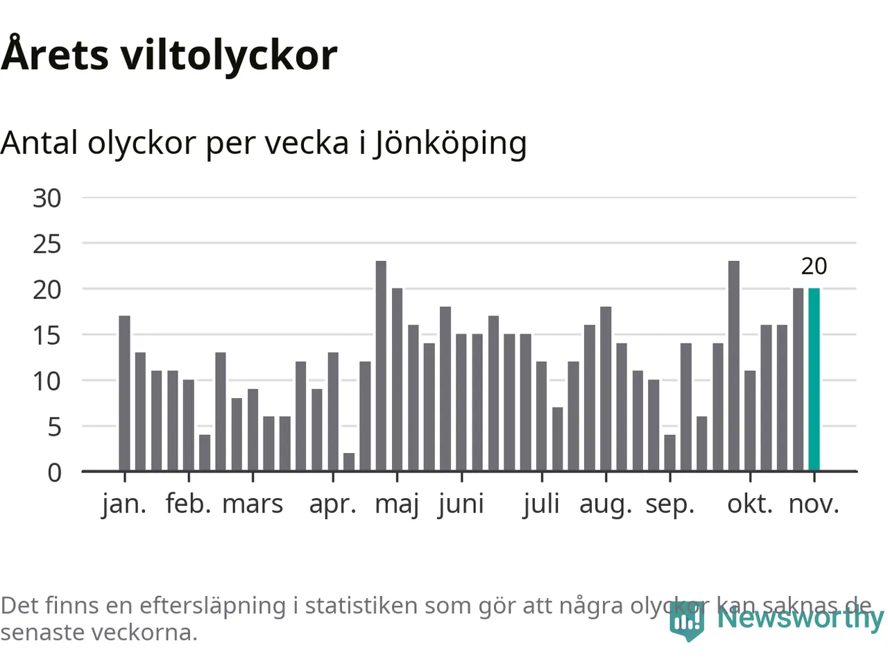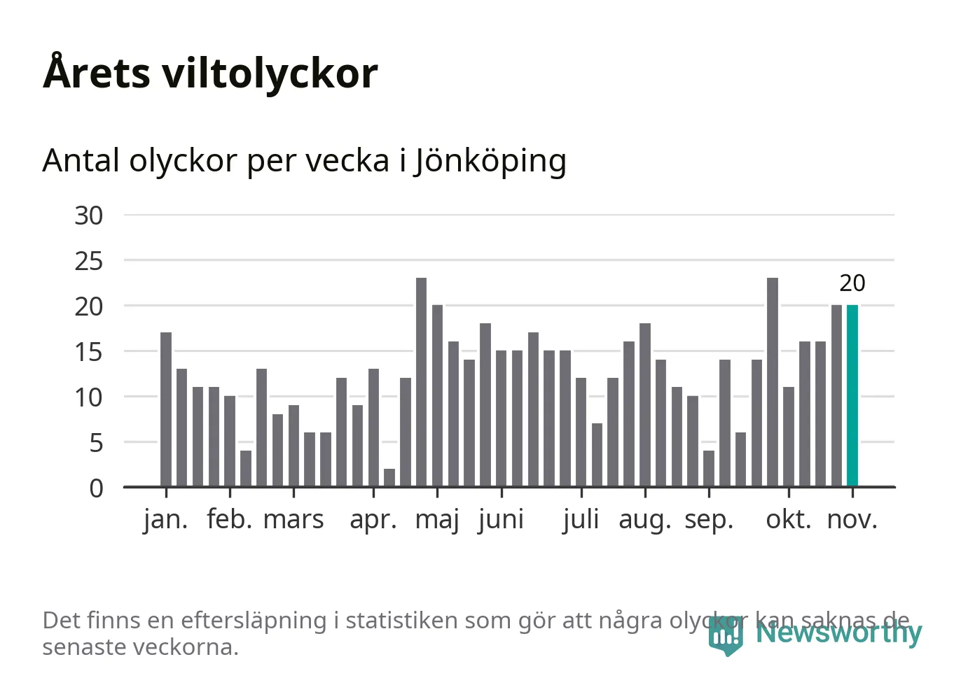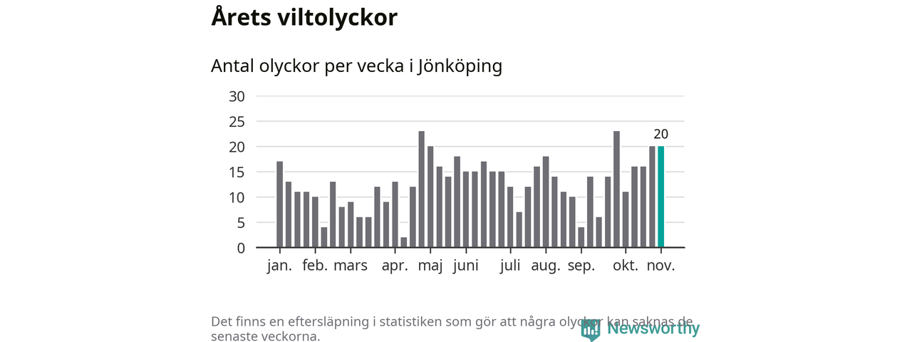 Hittills har 20 viltolyckor rapporterats in i Jönköpings kommun från vecka 45. Se listan här.