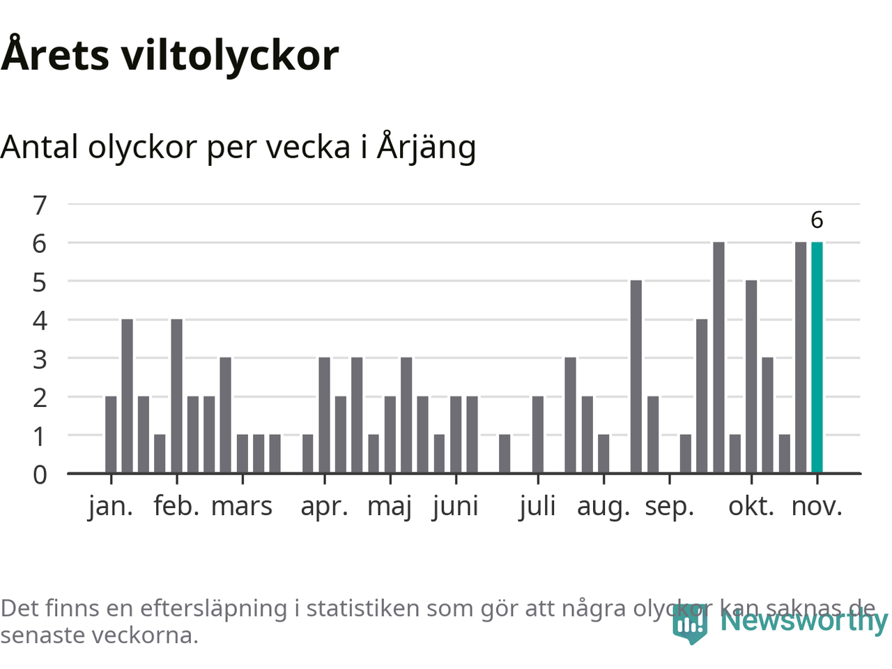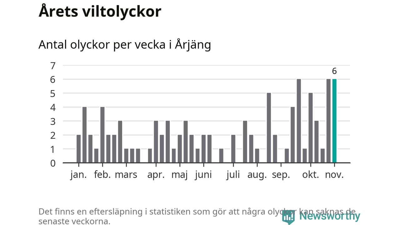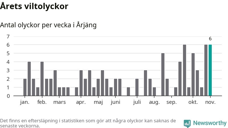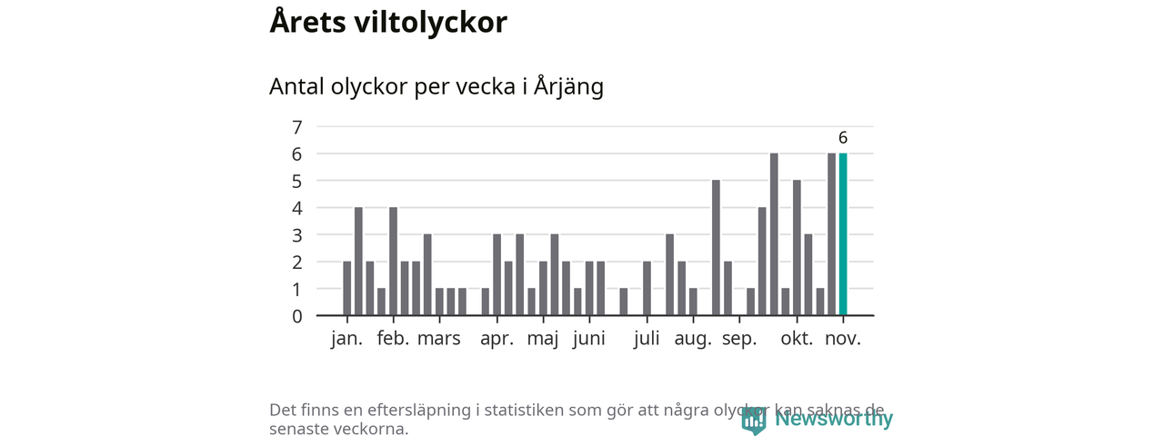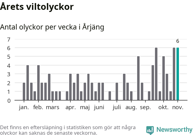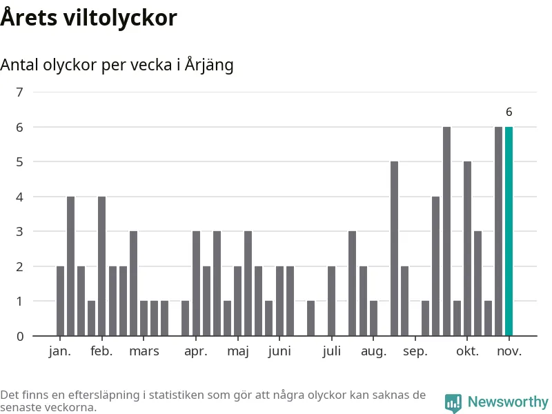Hittills har sex viltolyckor rapporterats in i Årjängs kommun från vecka 45. Se listan här.