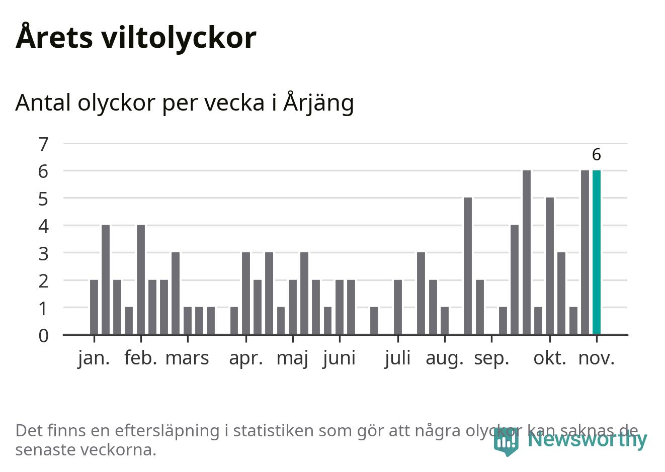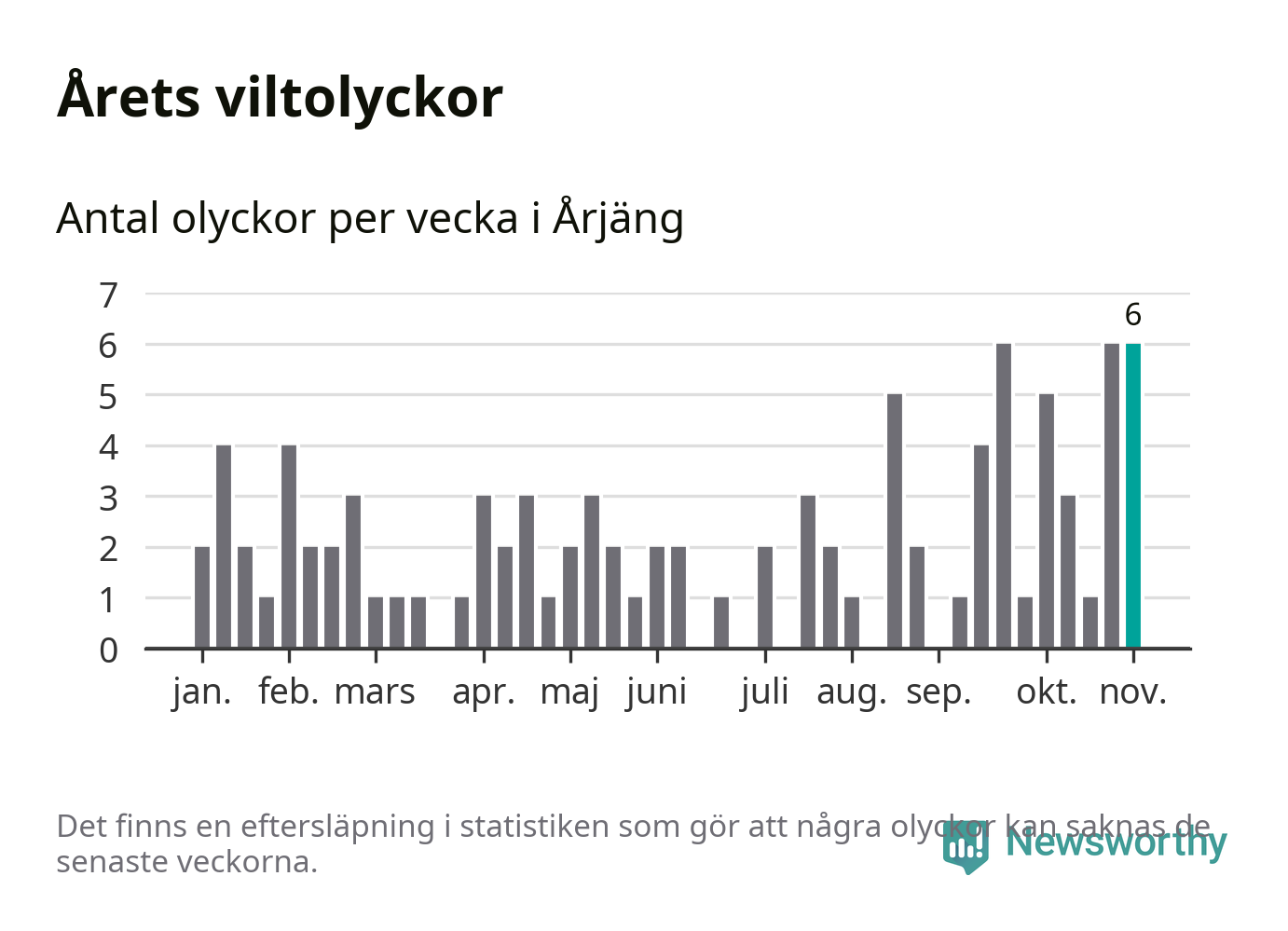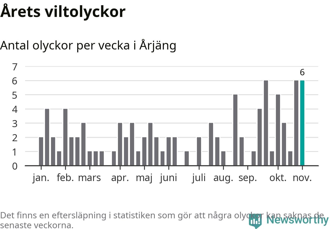 Hittills har sex viltolyckor rapporterats in i Årjängs kommun från vecka 45. Se listan här.