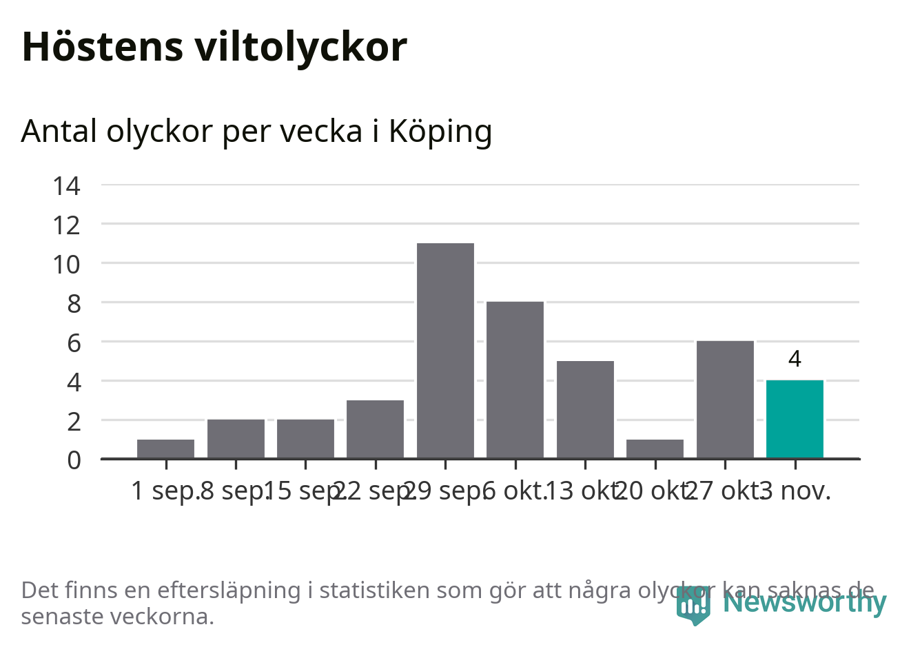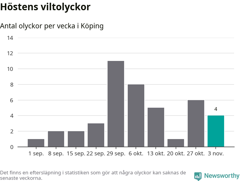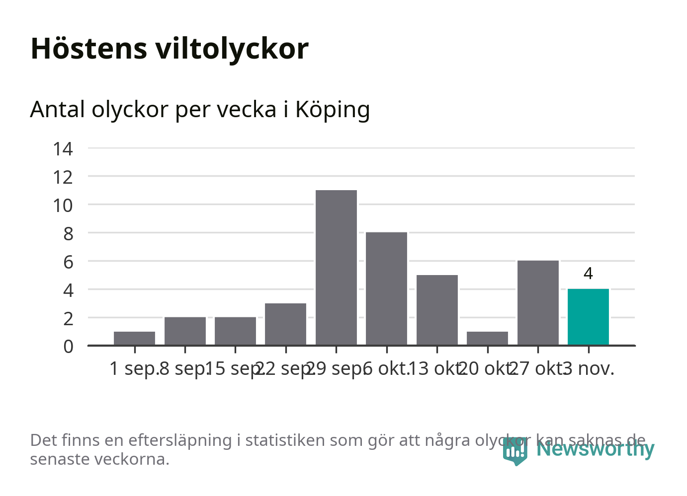 Totalt den här hösten har det inträffat 43 viltolyckor i kommunen. Genomsnittet för en hel höst (september–november) de senaste tio åren är 31,2.