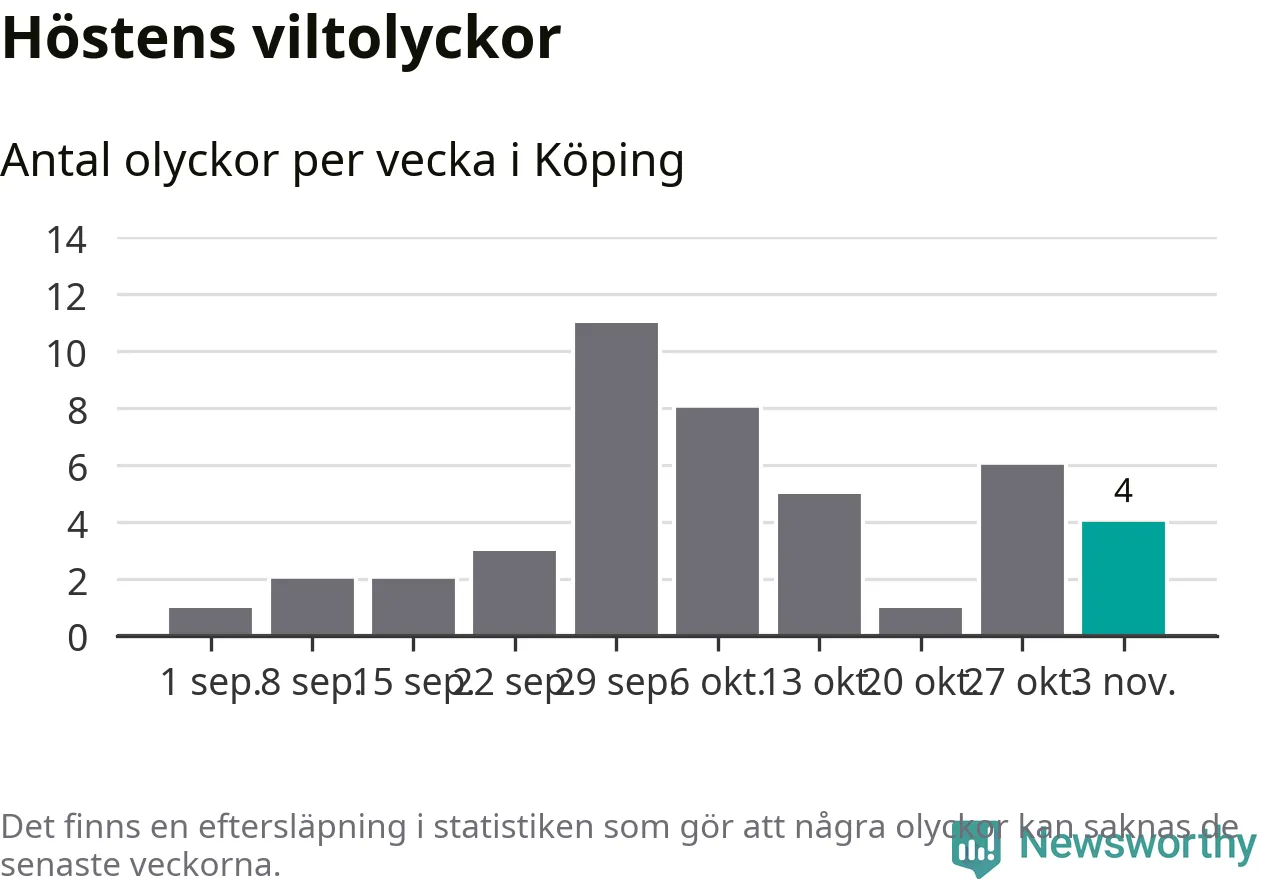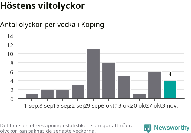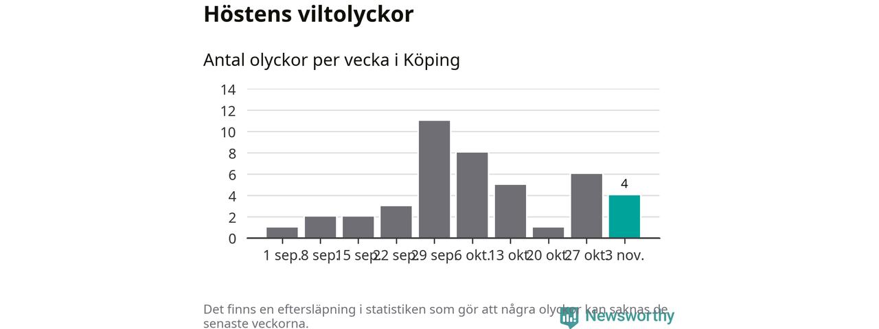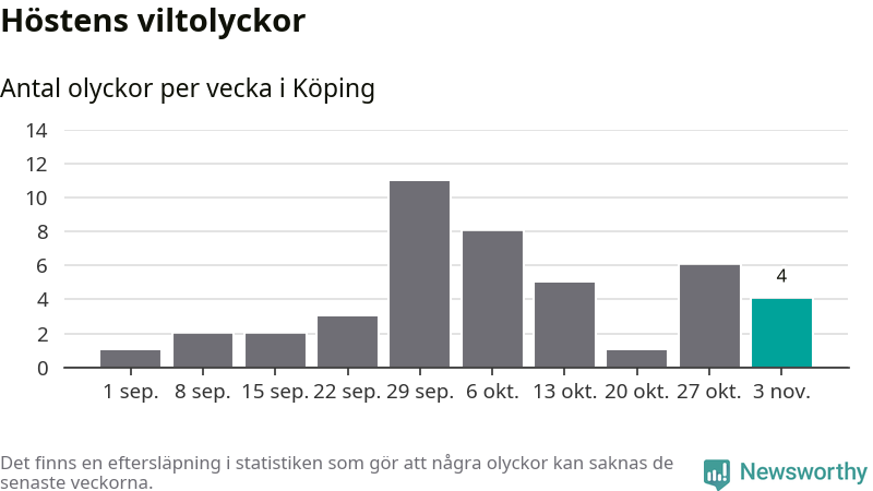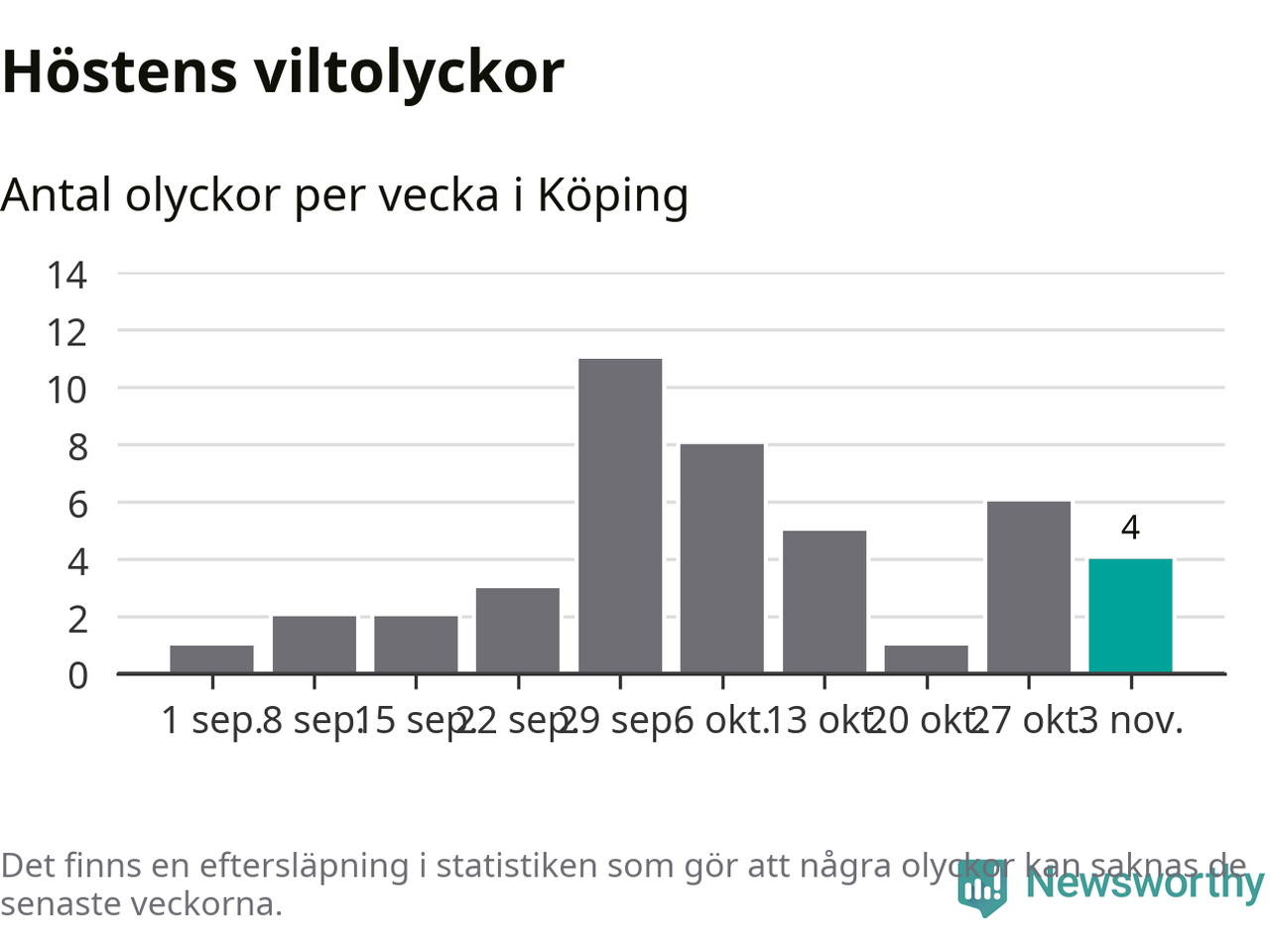 Totalt den här hösten har det inträffat 43 viltolyckor i kommunen. Genomsnittet för en hel höst (september–november) de senaste tio åren är 31,2.