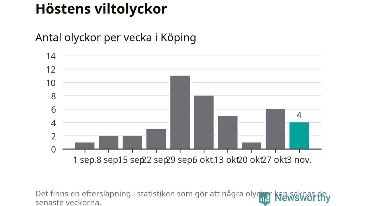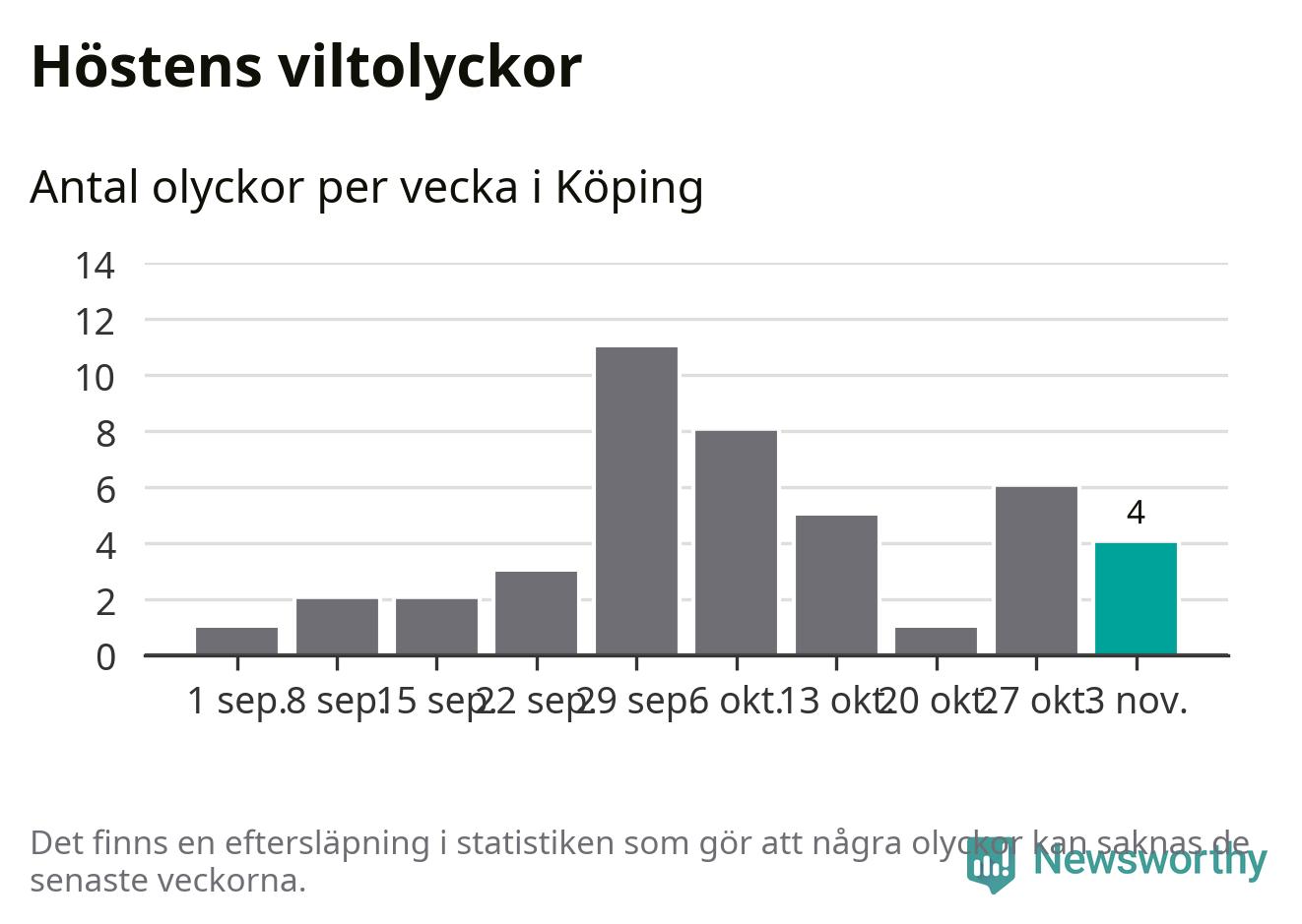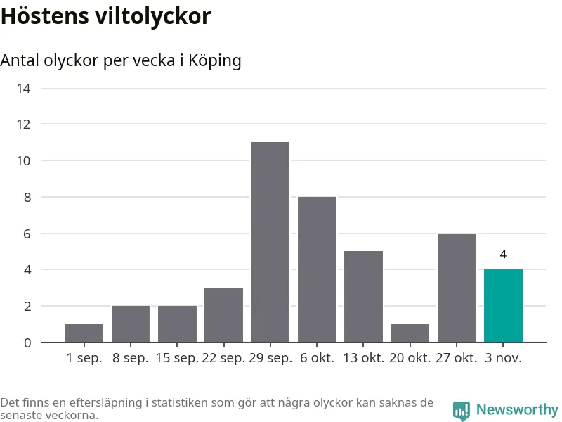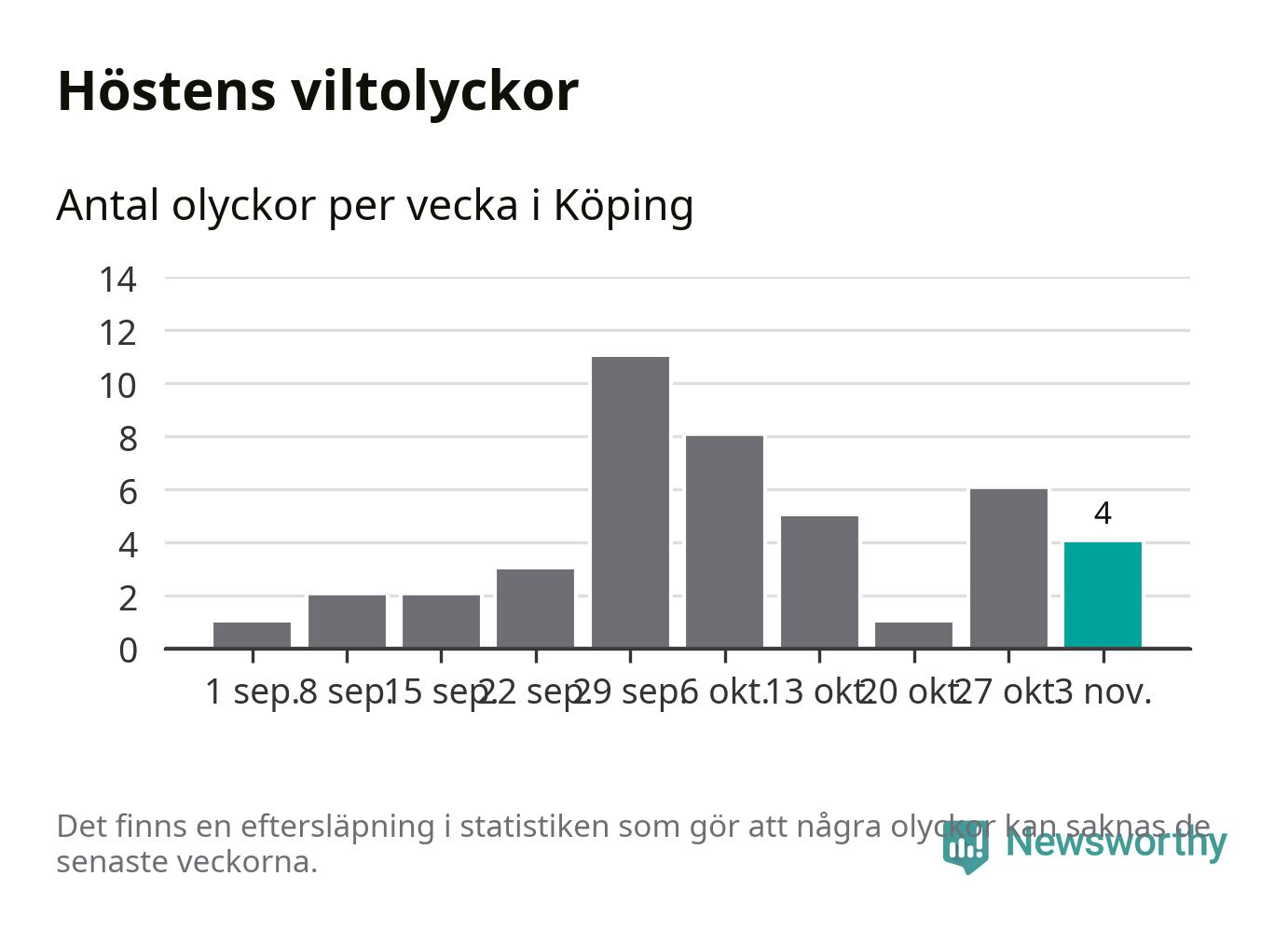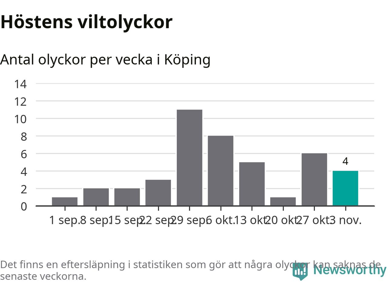 Under vecka 45 rapporterades fyra viltolyckor in i Köpings kommun. Därmed har det inträffat fler viltolyckor hittills den här hösten, än det brukar göra en hel genomsnittlig höst.