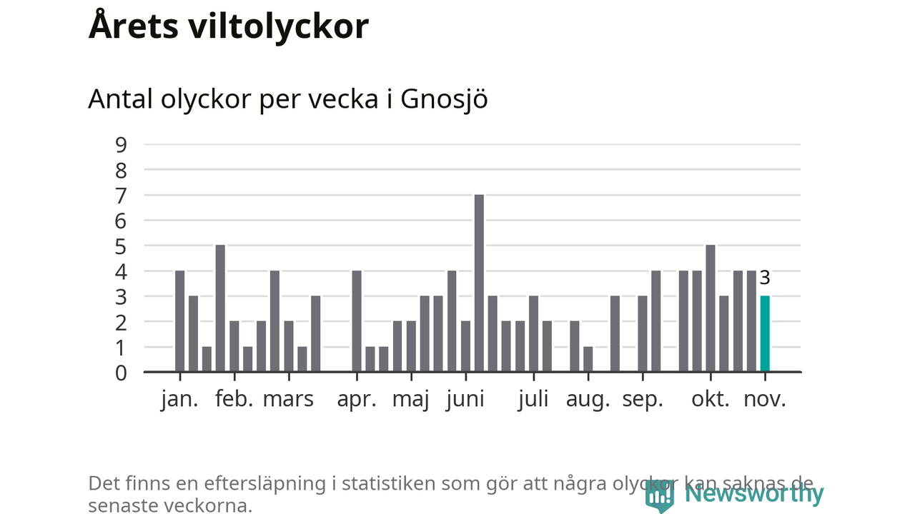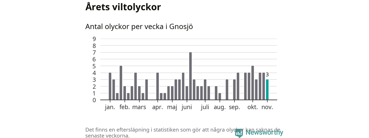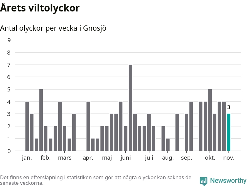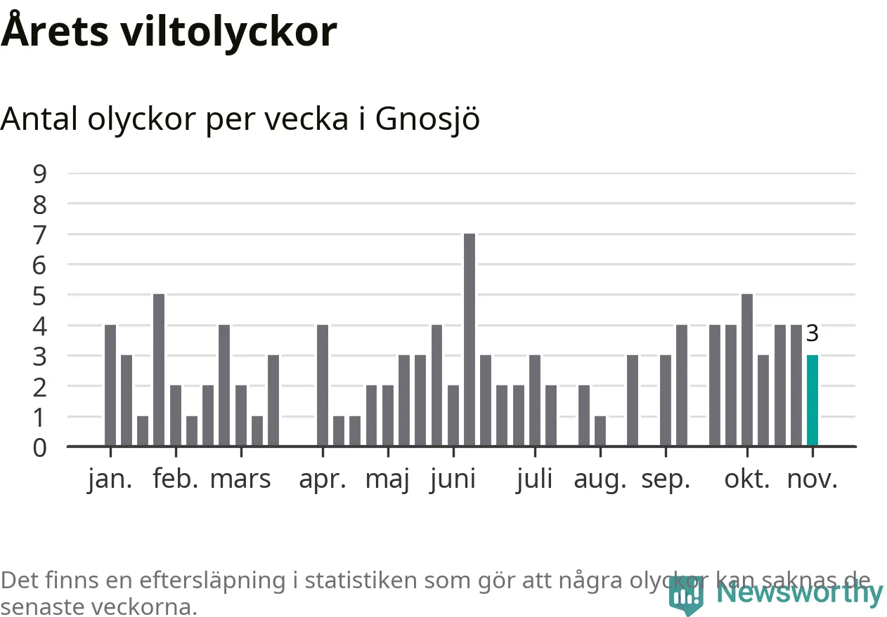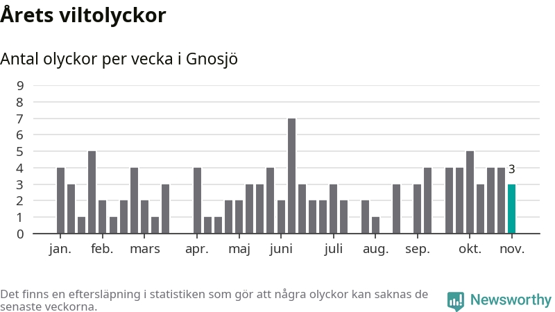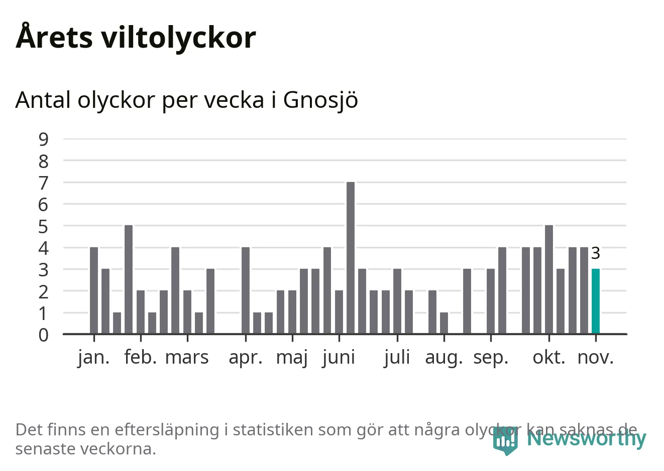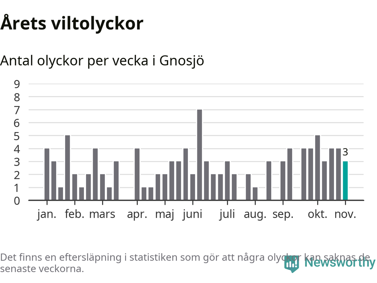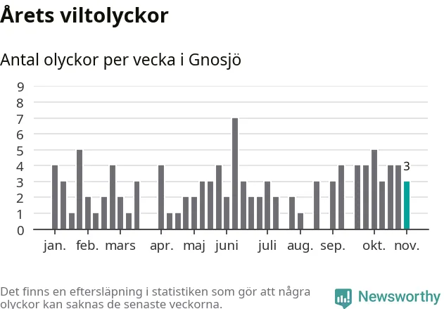 Hittills har tre viltolyckor rapporterats in i Gnosjö kommun från vecka 45. Se listan här.