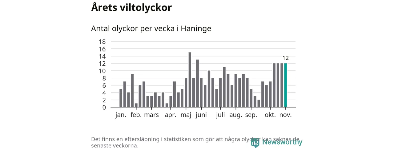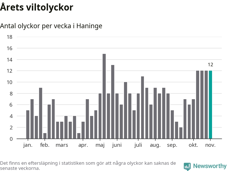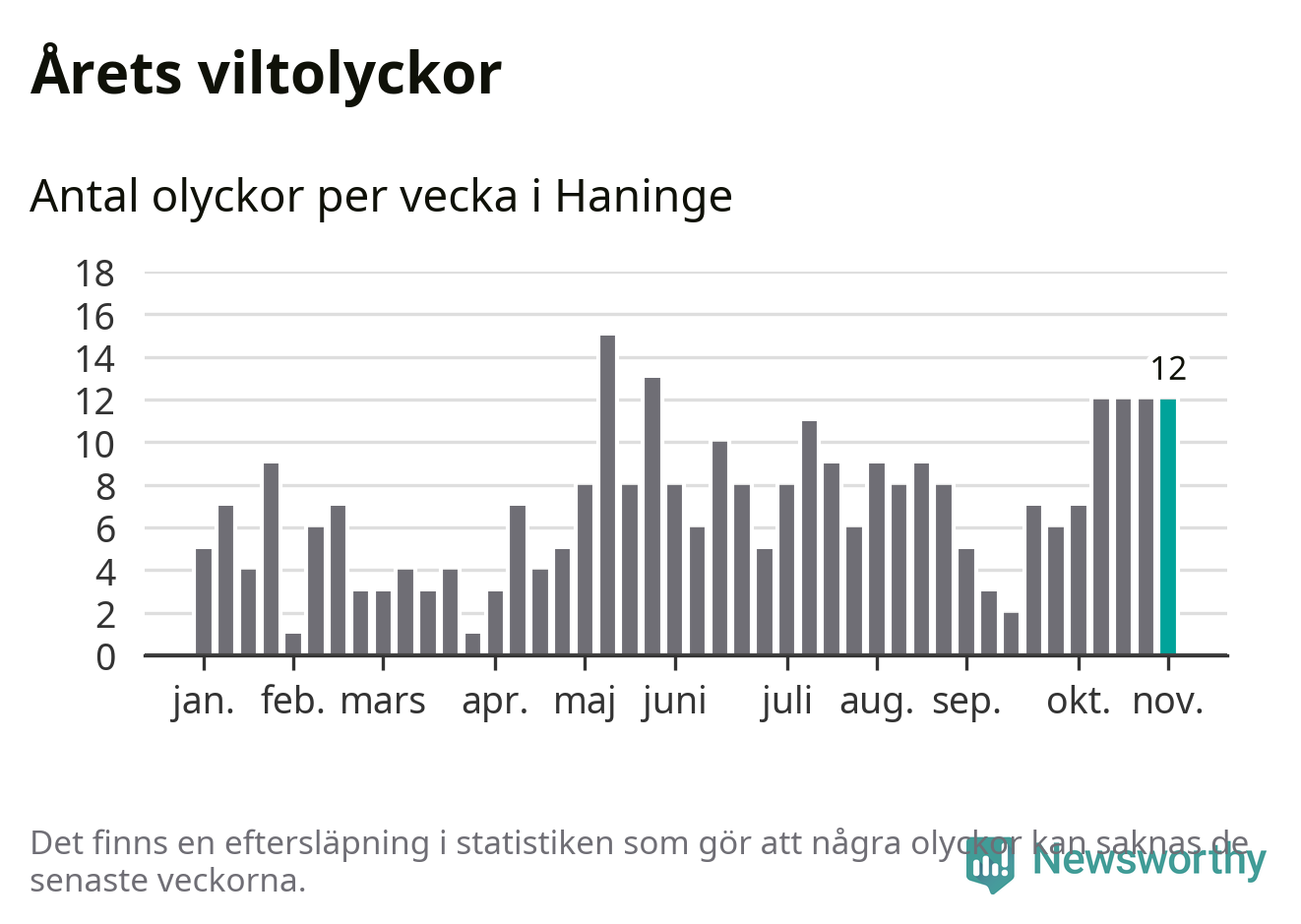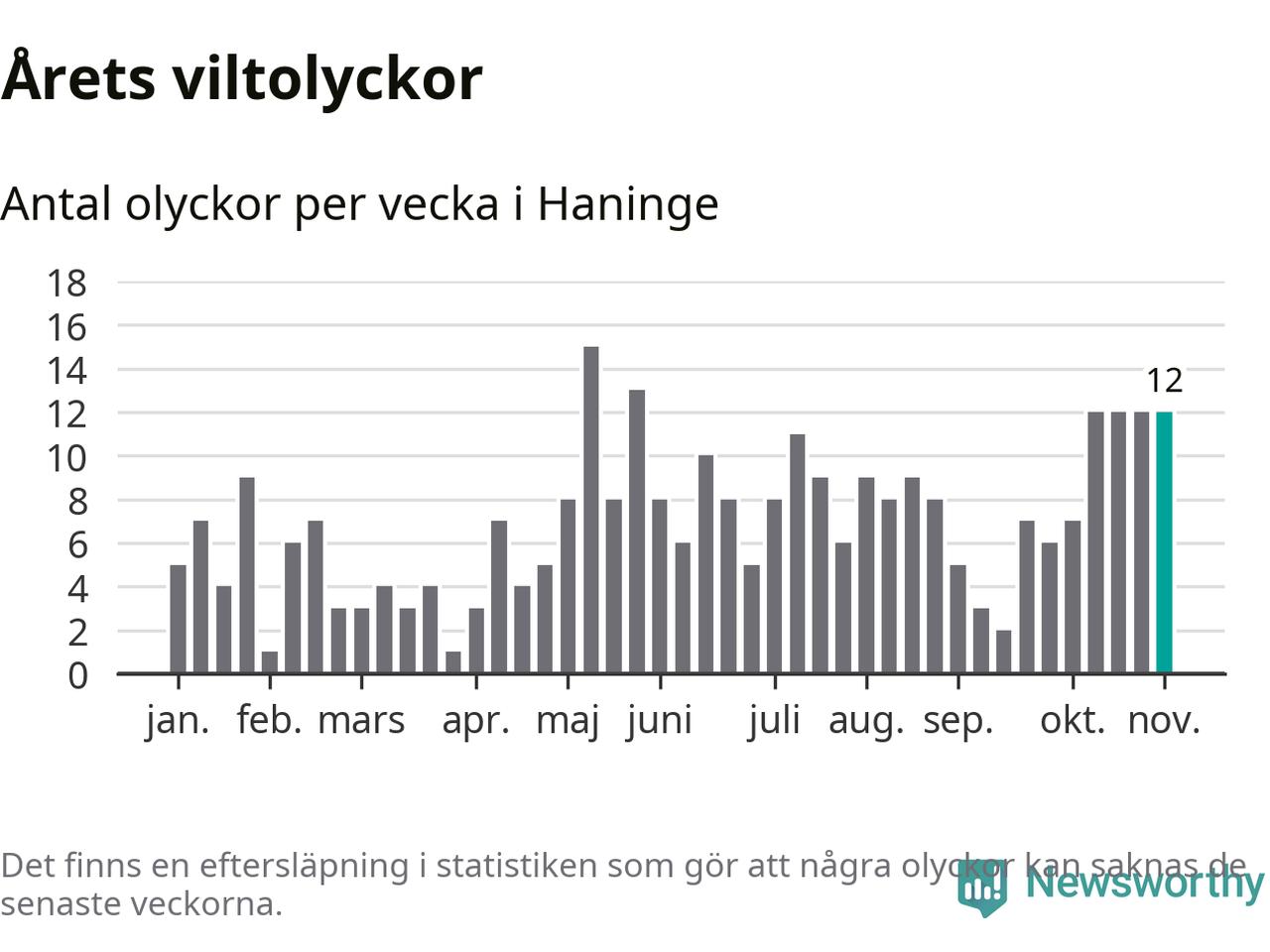 Hittills har tolv viltolyckor rapporterats in i Haninge kommun från vecka 45. Se listan här.