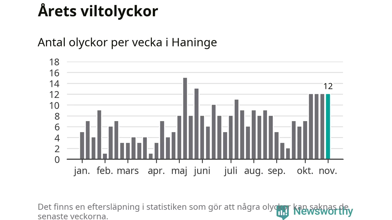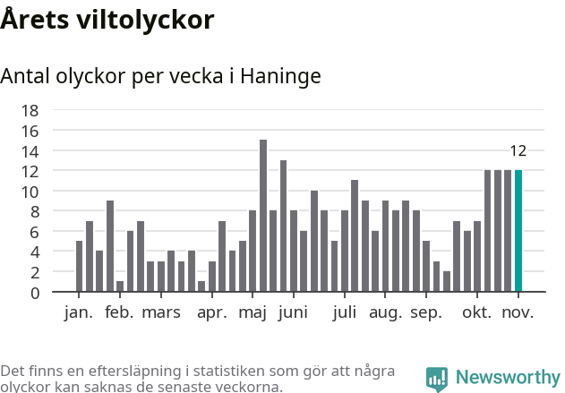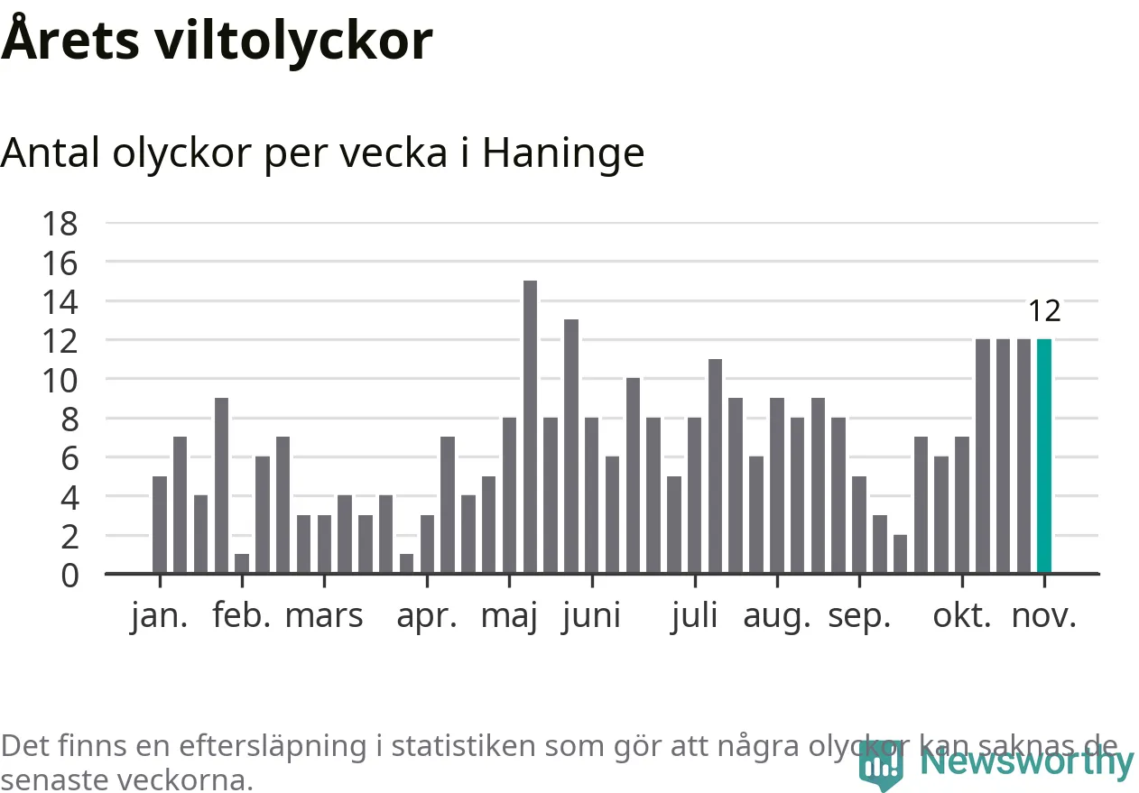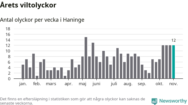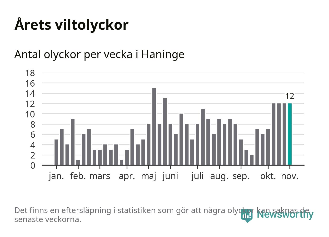 Hittills har tolv viltolyckor rapporterats in i Haninge kommun från vecka 45. Se listan här.