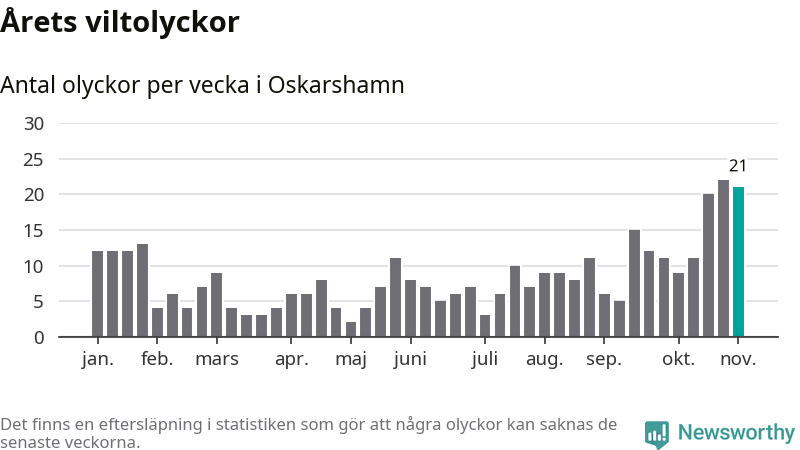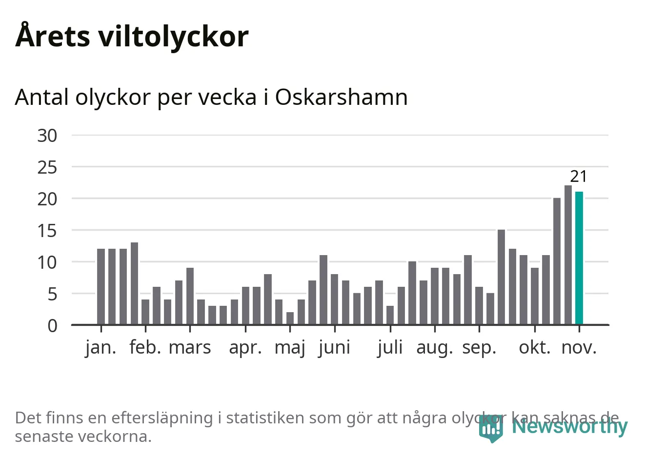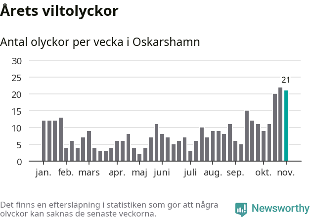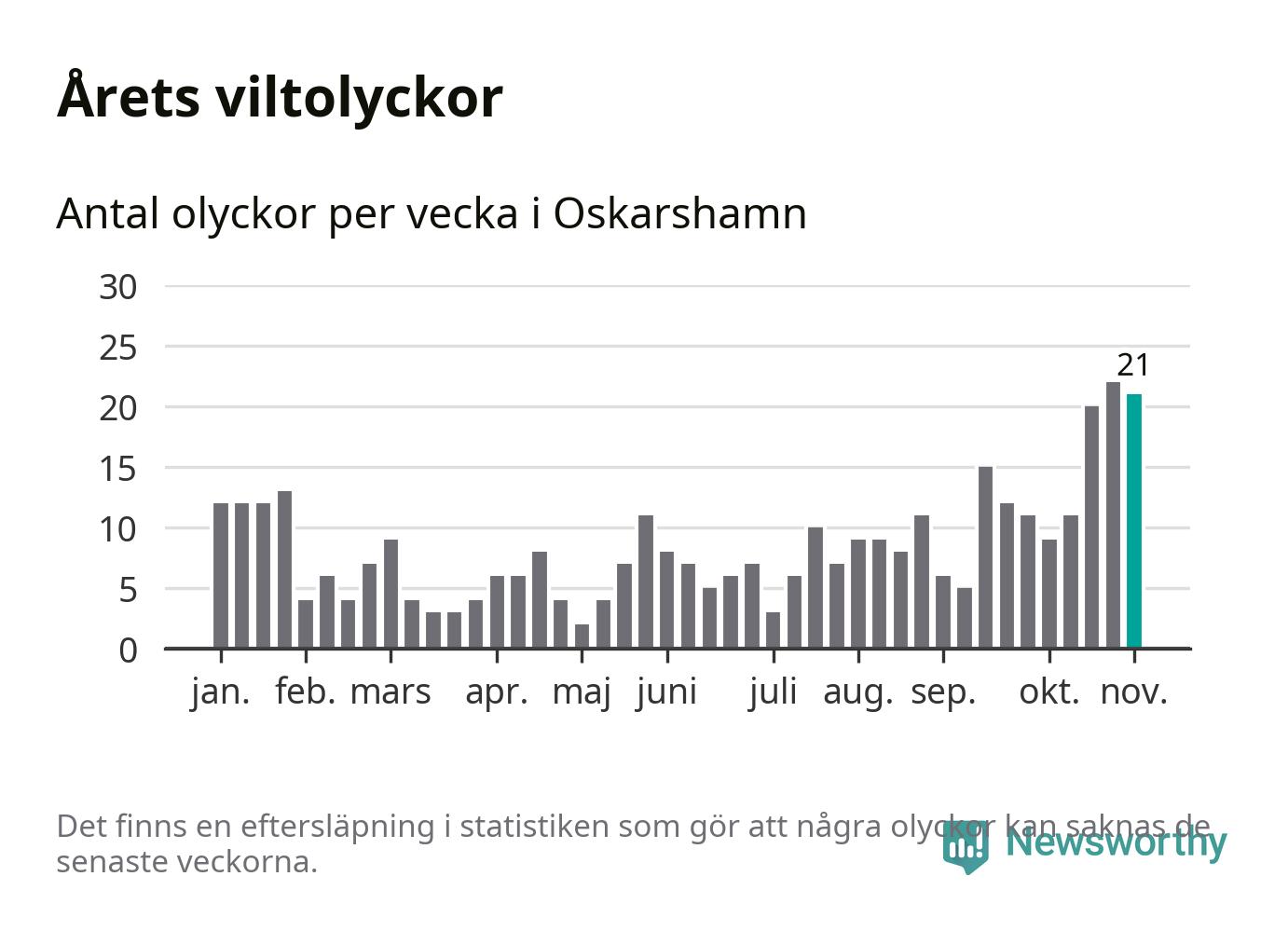 21 olyckor på en enda vecka är också ovanligt många. Bara fyra gånger tidigare sedan 2015 har det skett