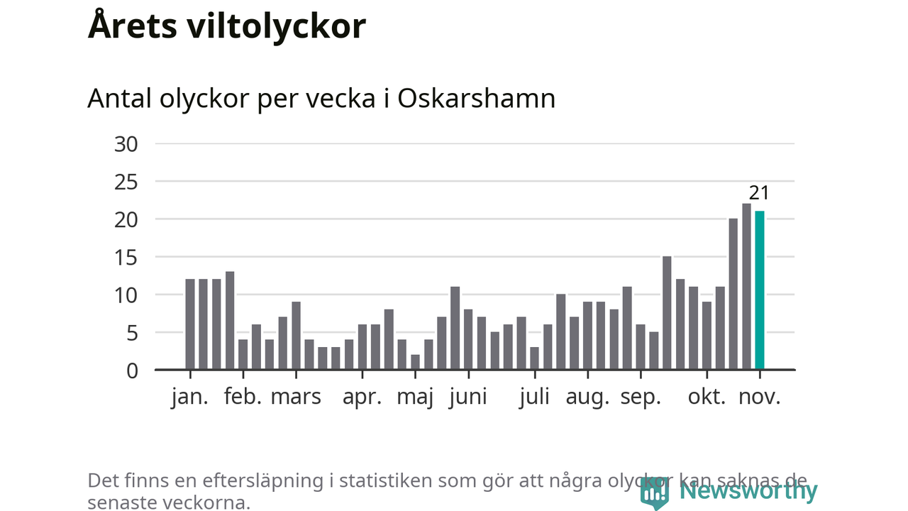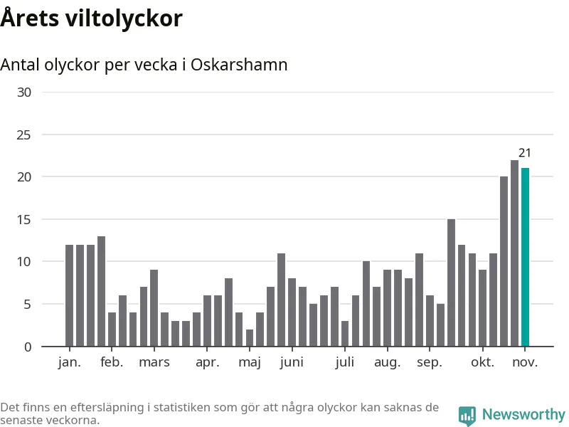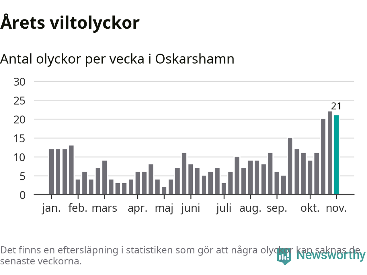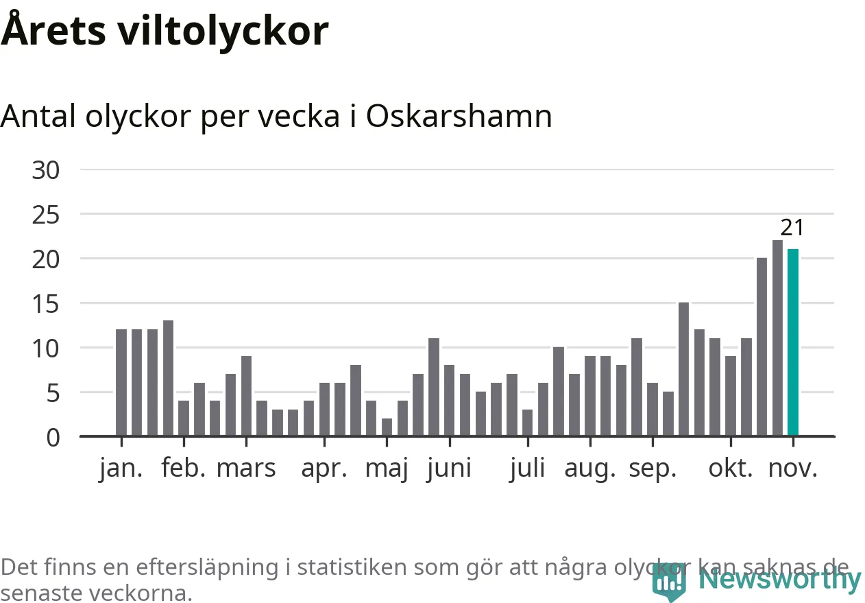21 olyckor på en enda vecka är också ovanligt många. Bara fyra gånger tidigare sedan 2015 har det skett