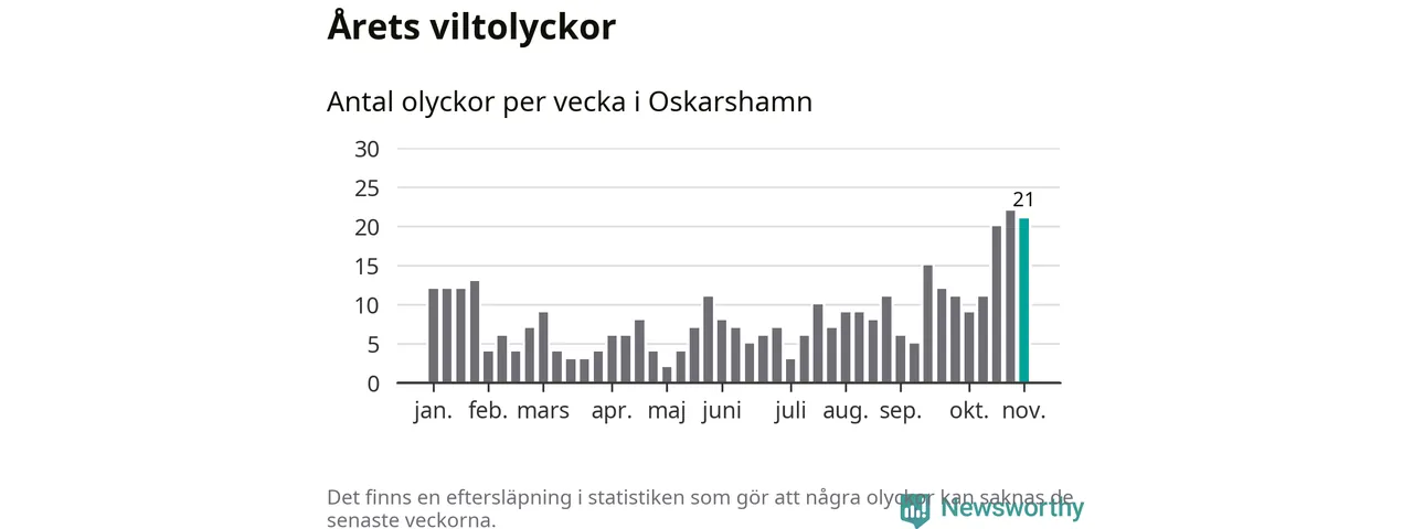 374 viltolyckor i kommunen. Det är mer än genomsnittet för motsvarande period (omkring 332) de senaste tio åren.