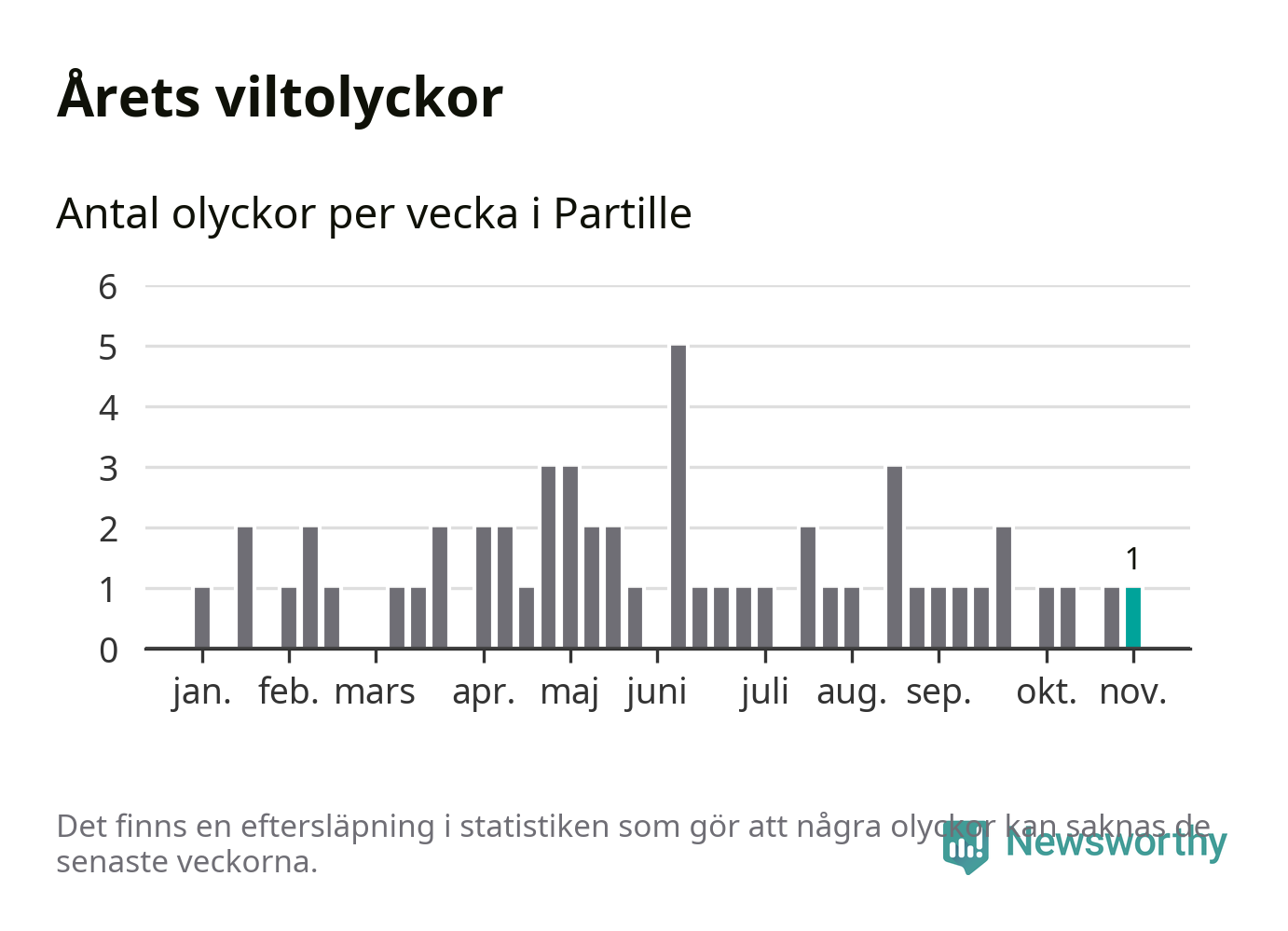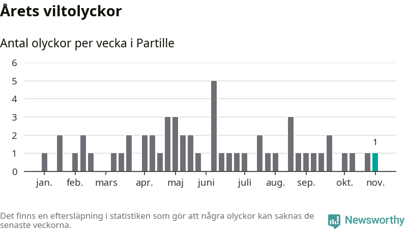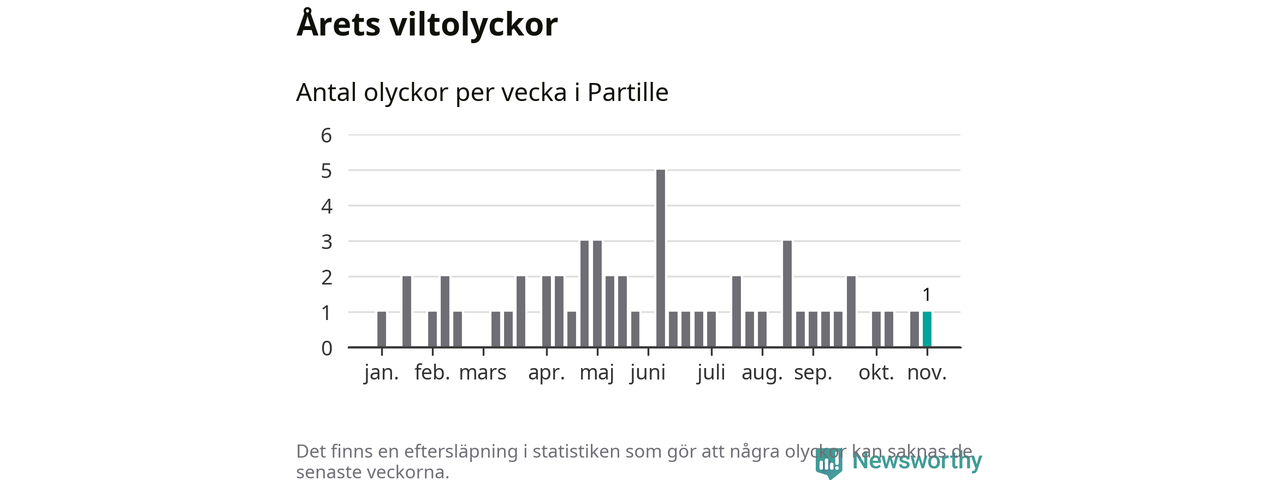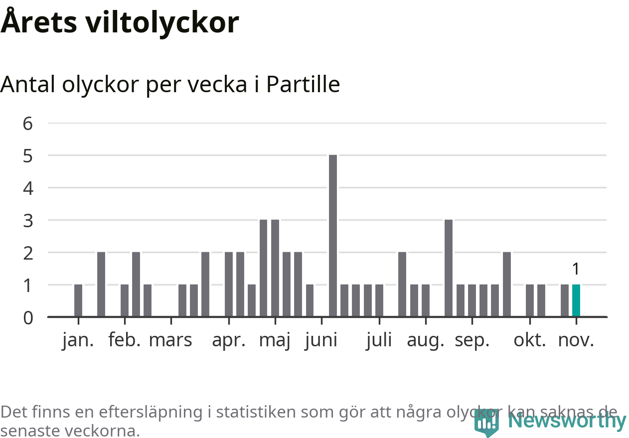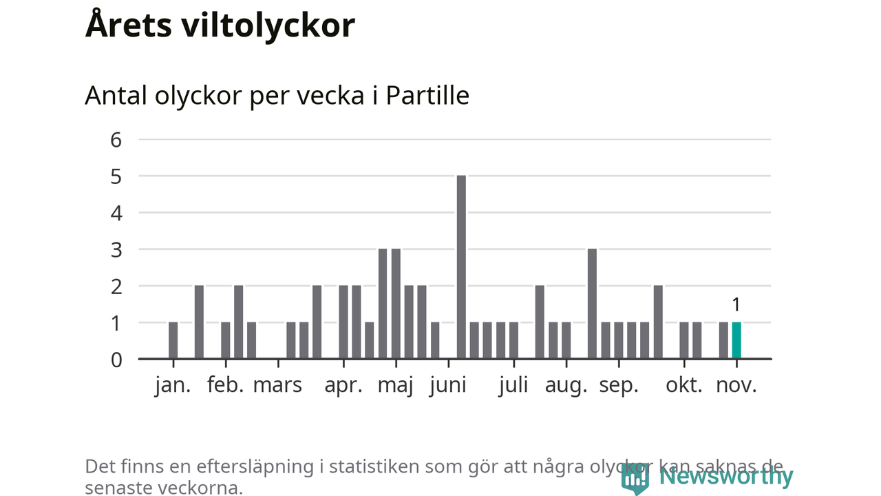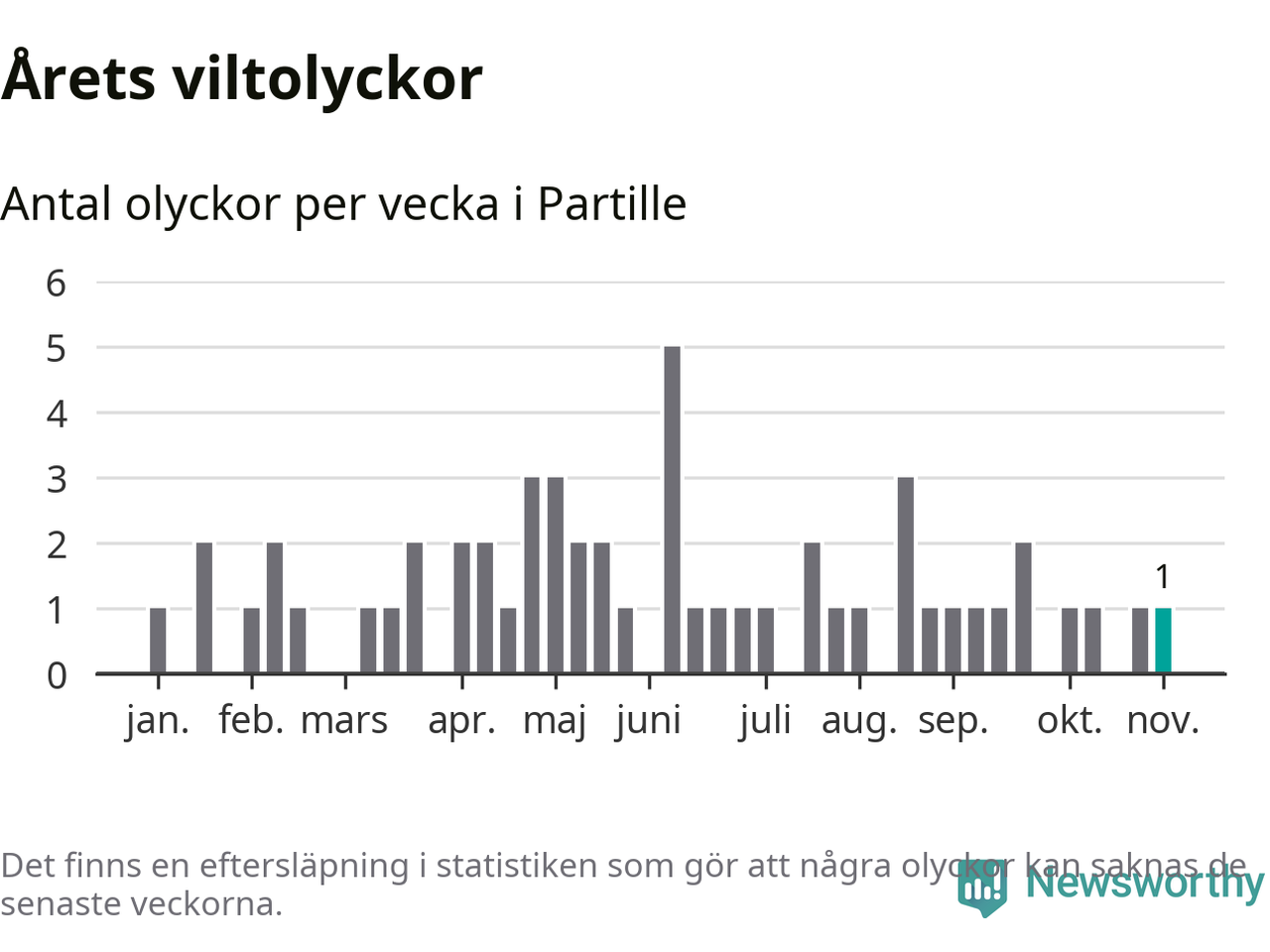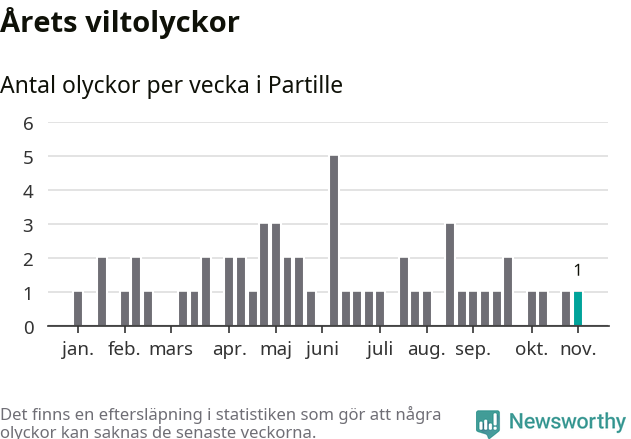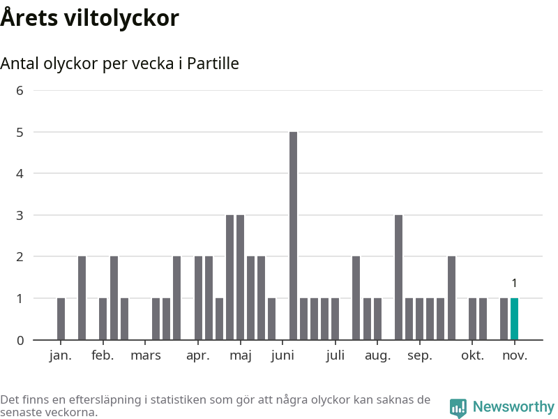 Från förra veckan (vecka 45) har hittills en viltolycka rapporterats in i Partille kommun.