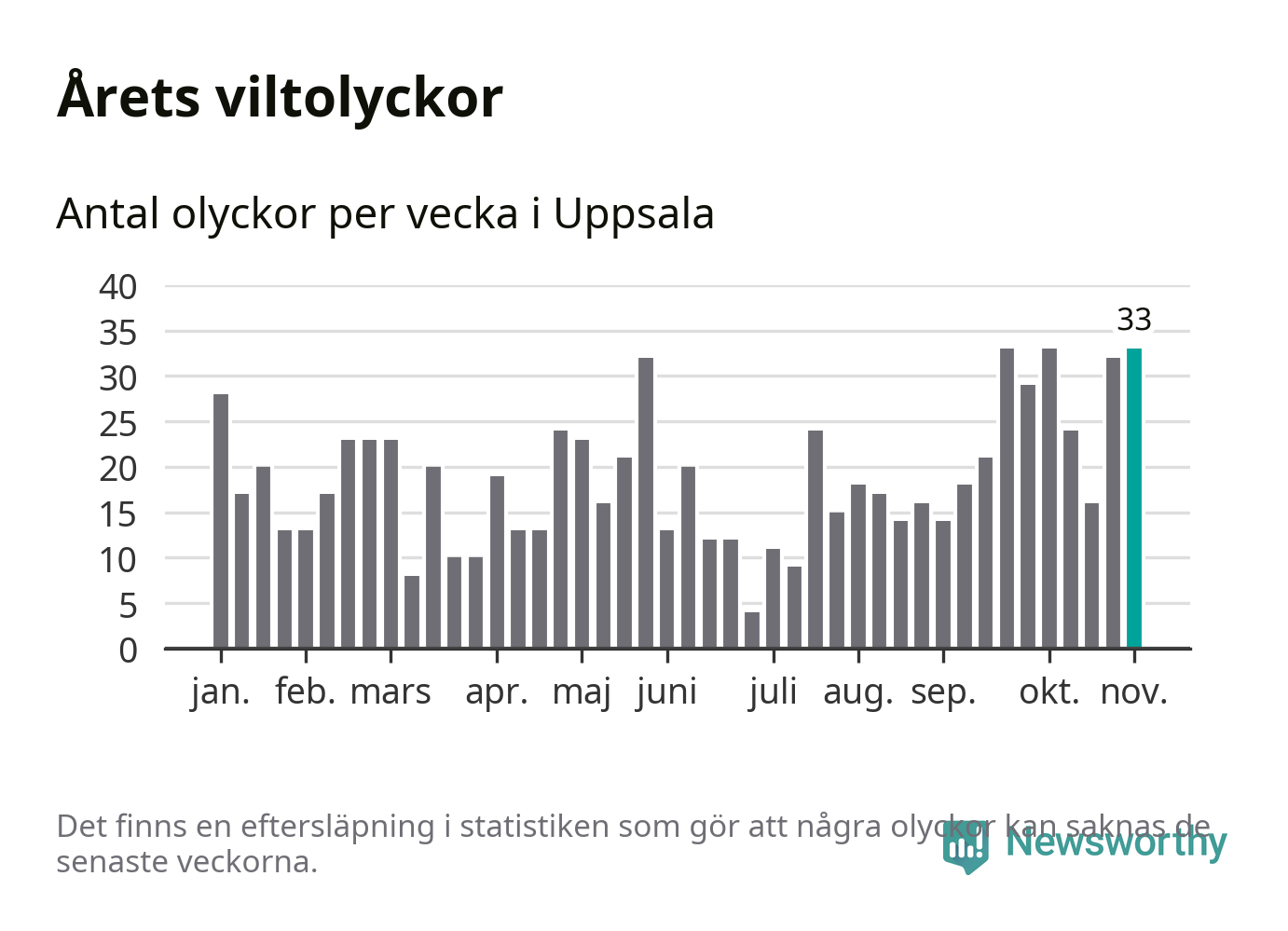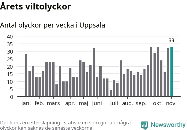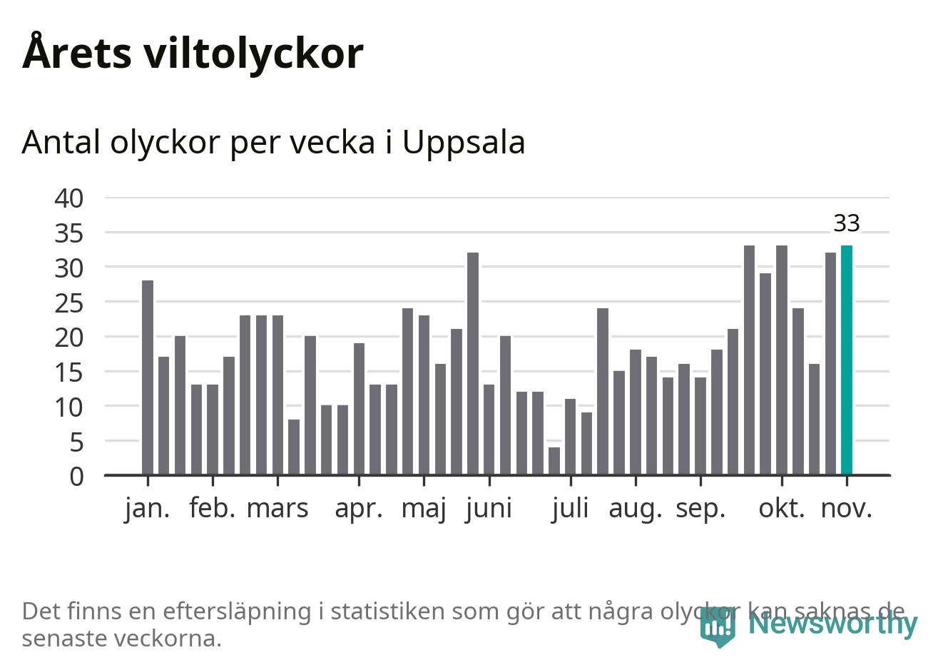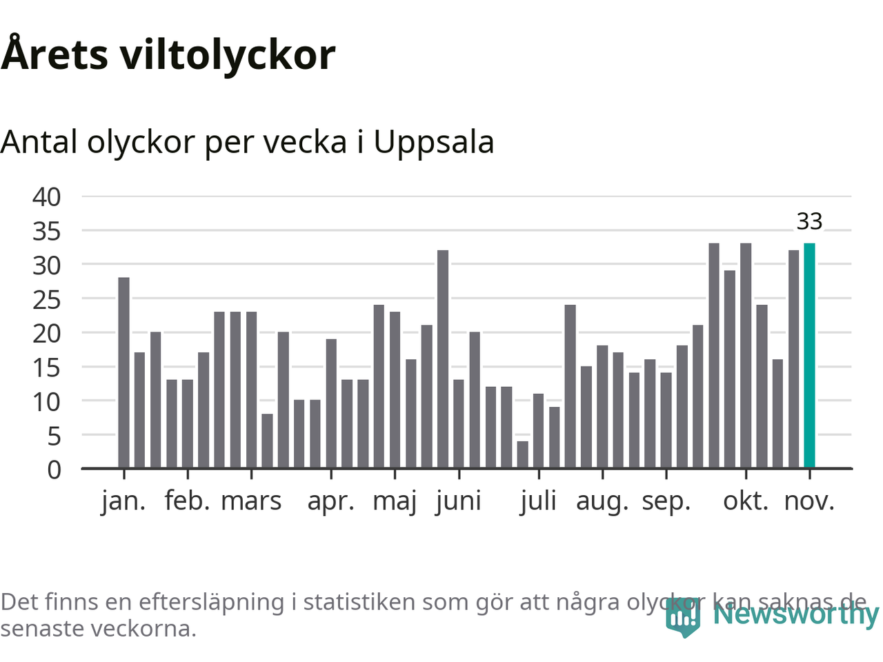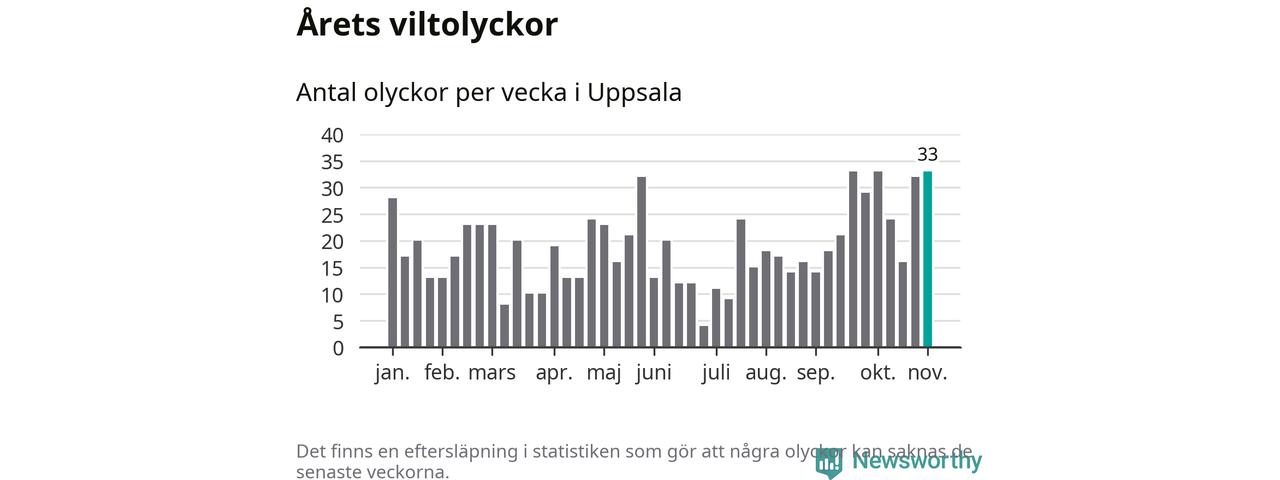 Hittills har 33 viltolyckor rapporterats in i Uppsala kommun från vecka 45. Se listan här.