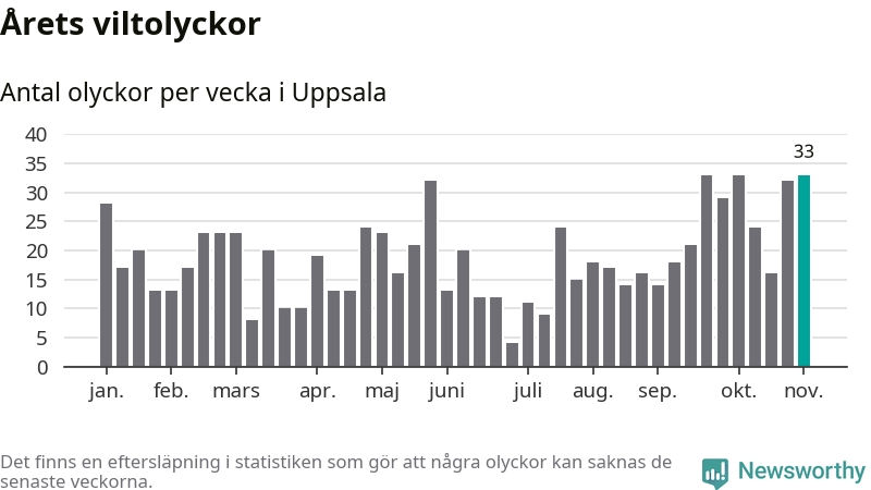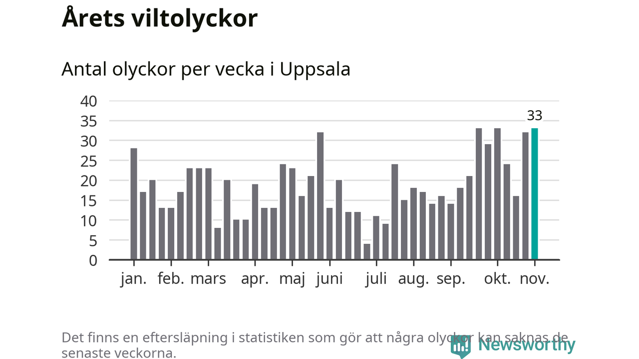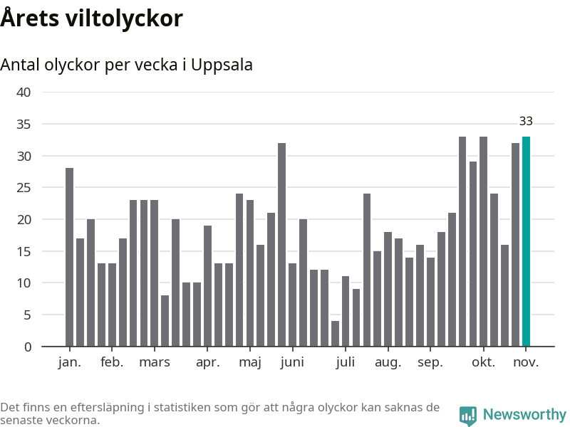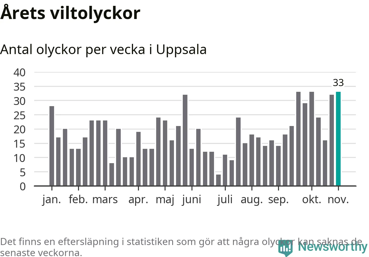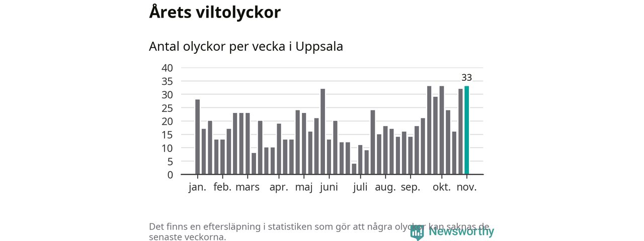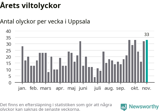 Hittills har 33 viltolyckor rapporterats in i Uppsala kommun från vecka 45. Se listan här.
