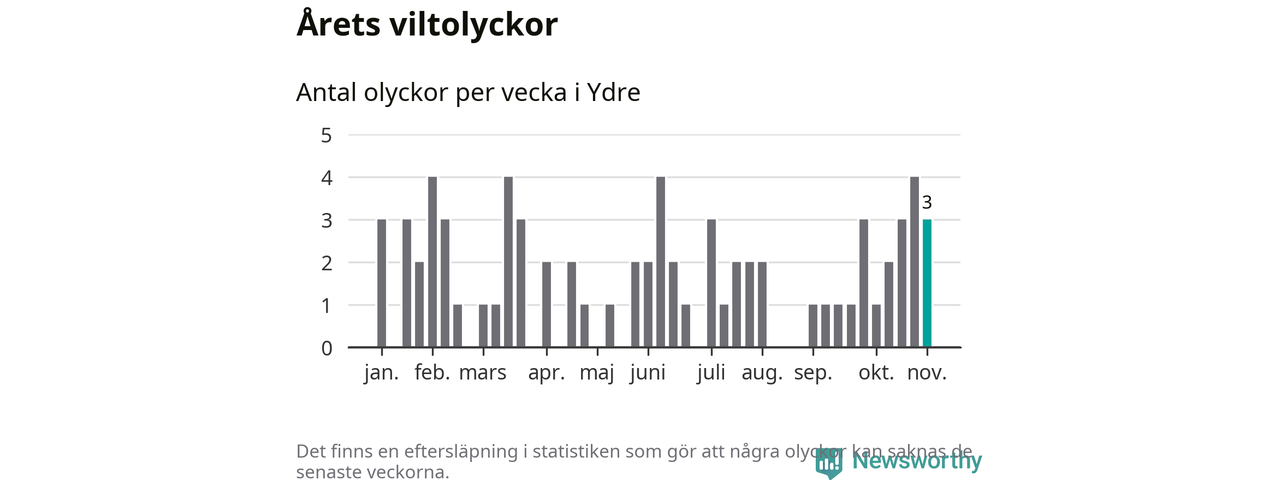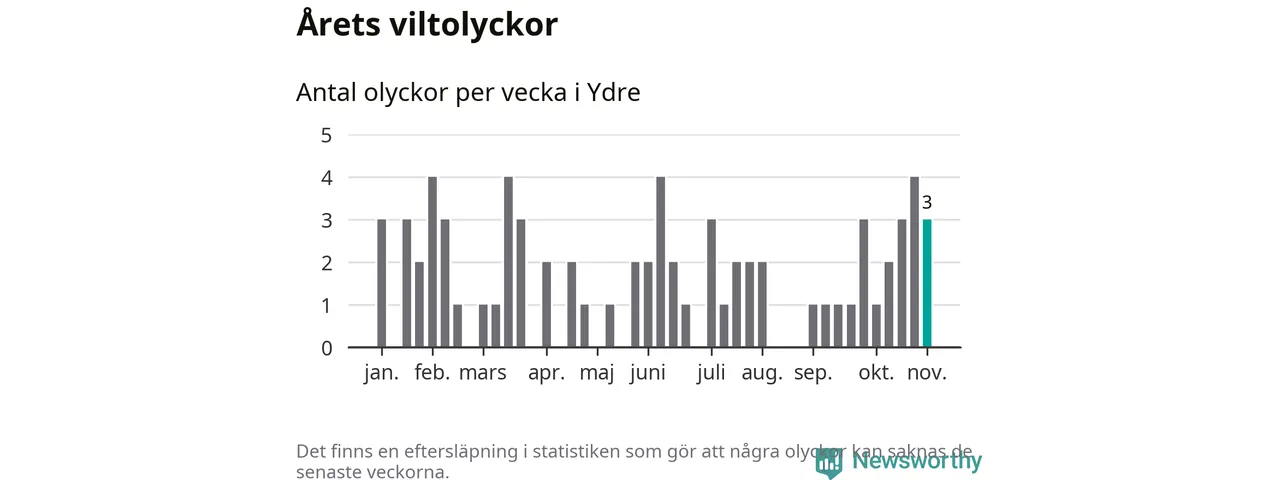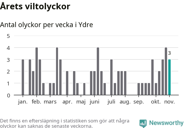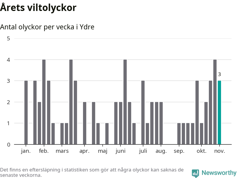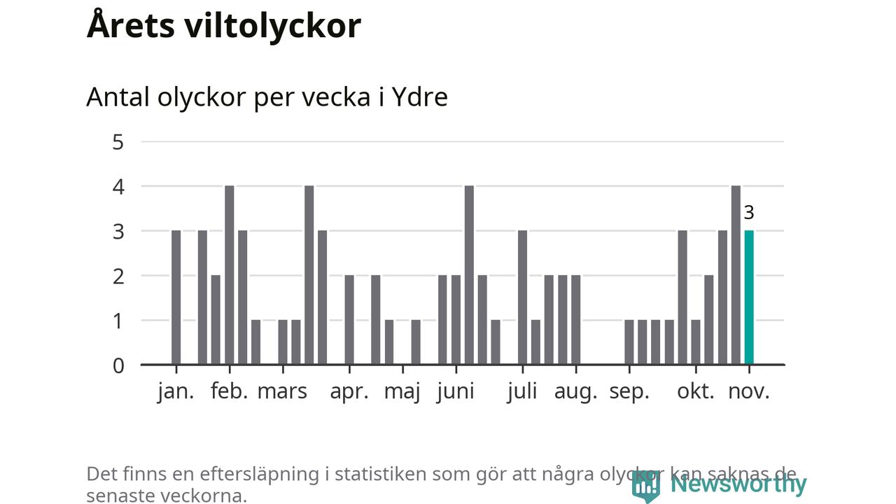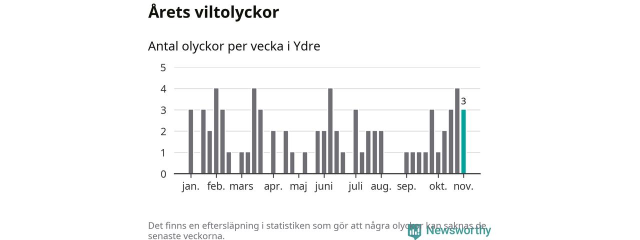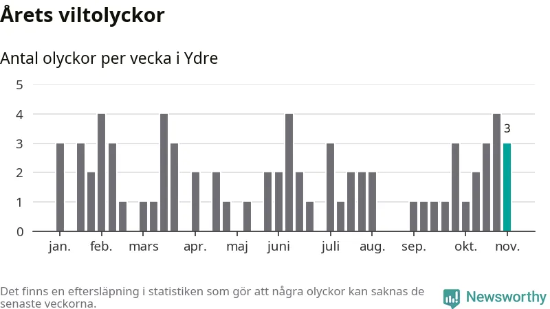 Hittills har tre viltolyckor rapporterats in i Ydre kommun från vecka 45. Se listan här.