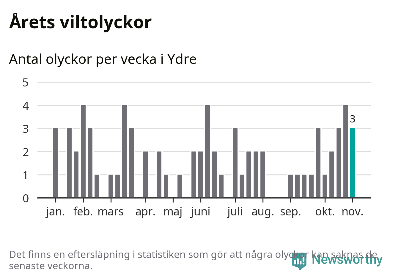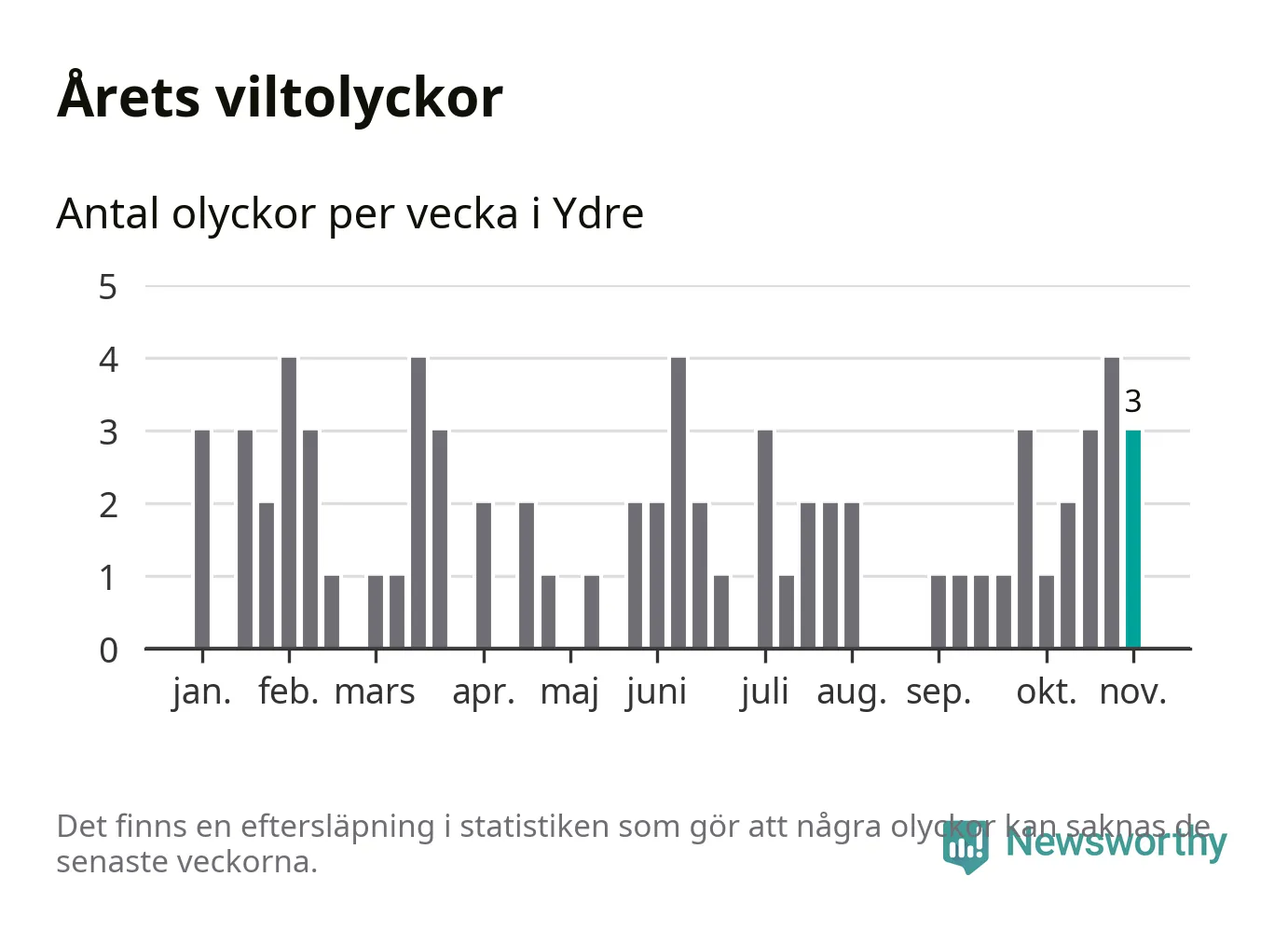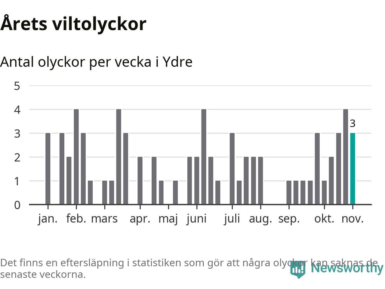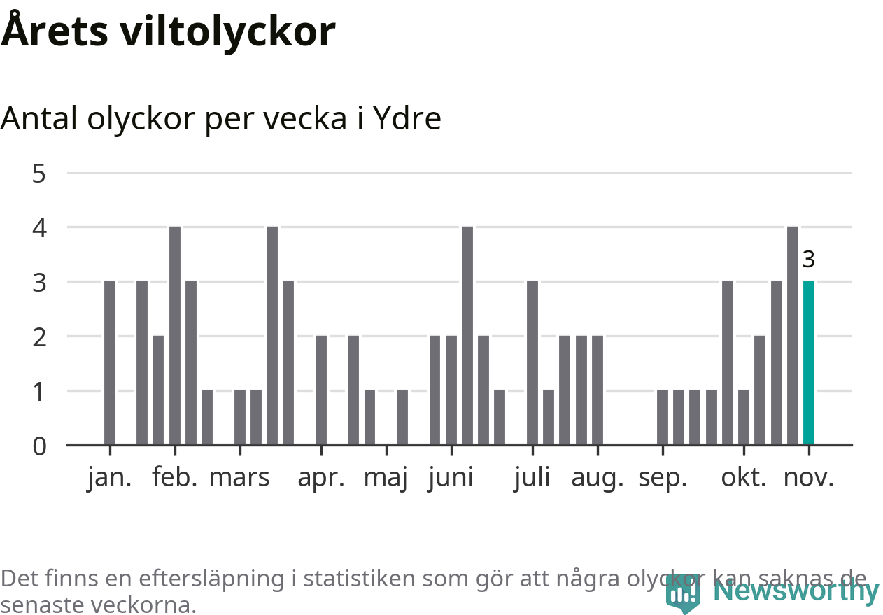 Hittills har tre viltolyckor rapporterats in i Ydre kommun från vecka 45. Se listan här.