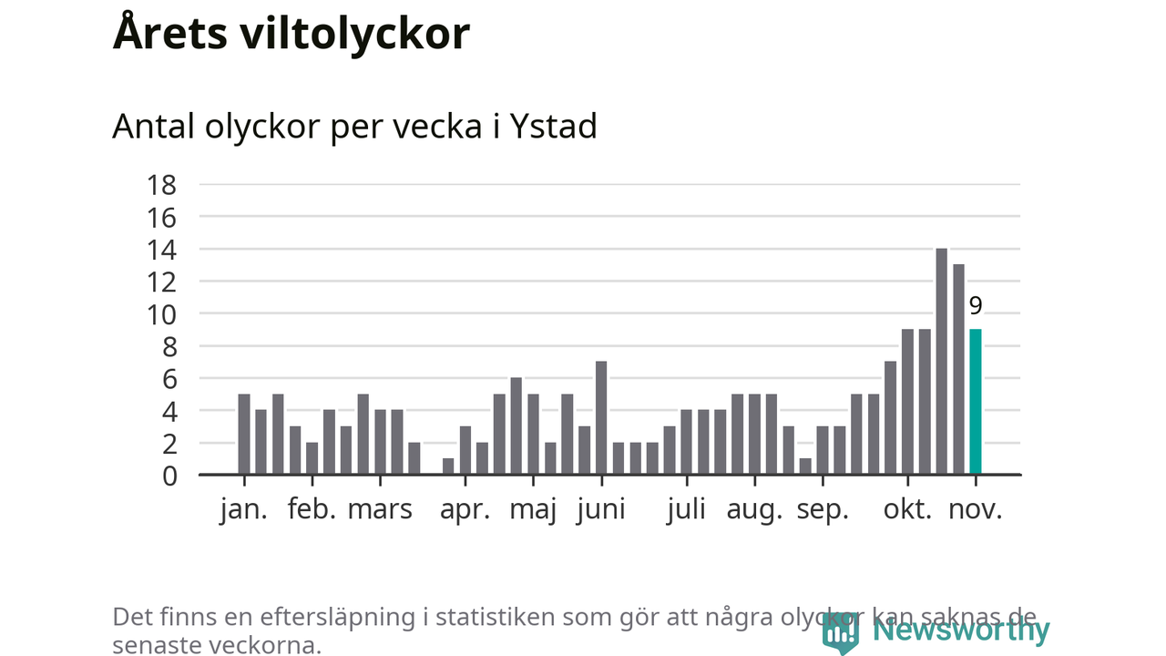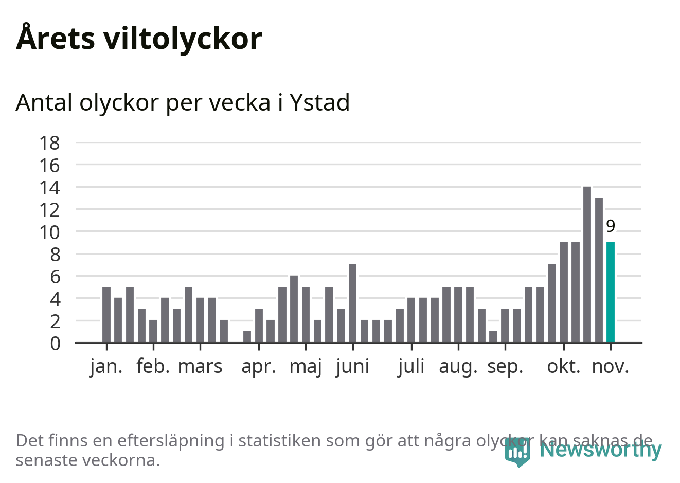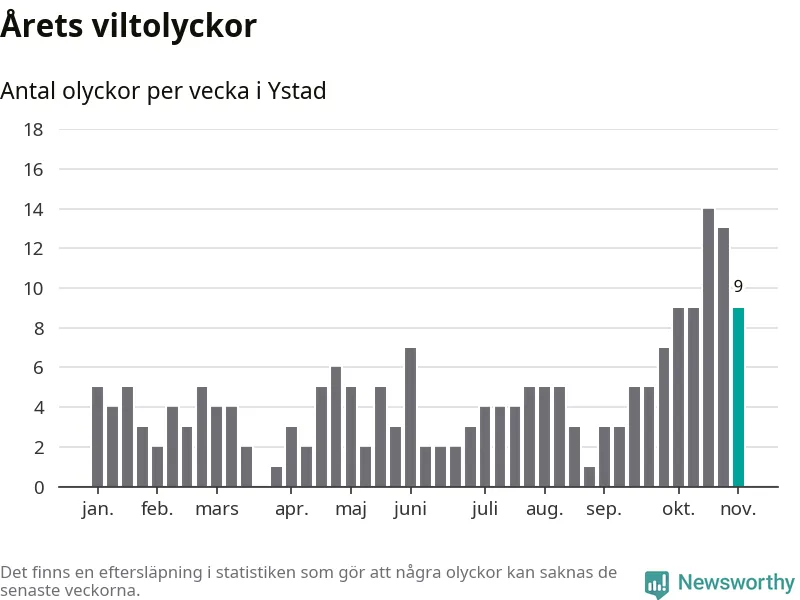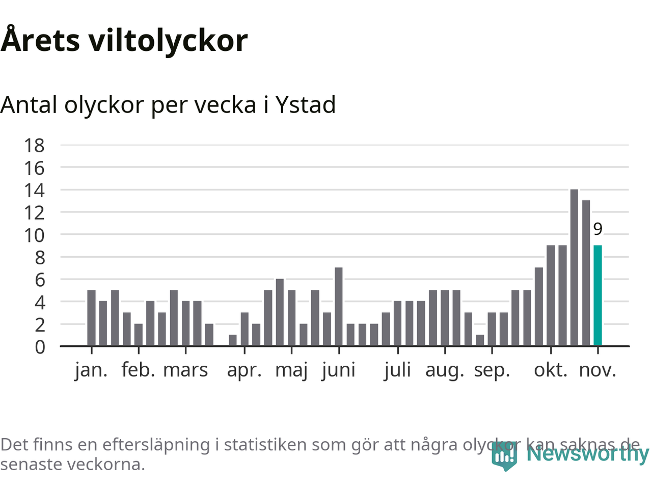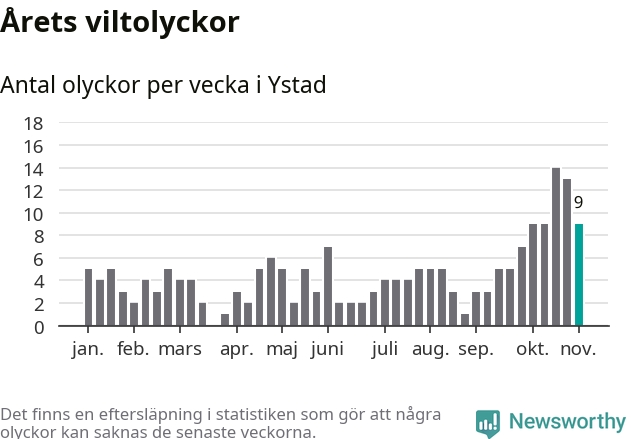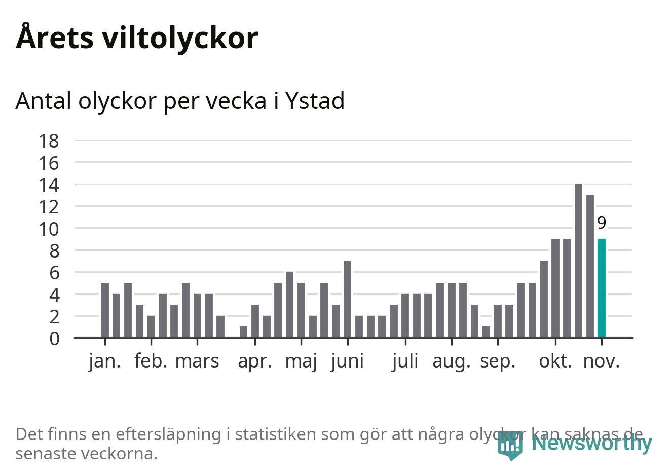 Hittills har nio viltolyckor rapporterats in i Ystads kommun från vecka 45. Se listan här.