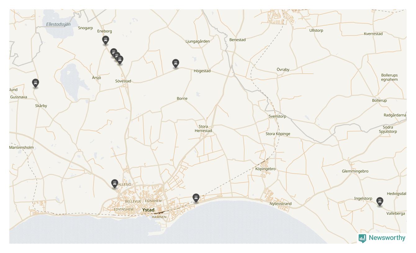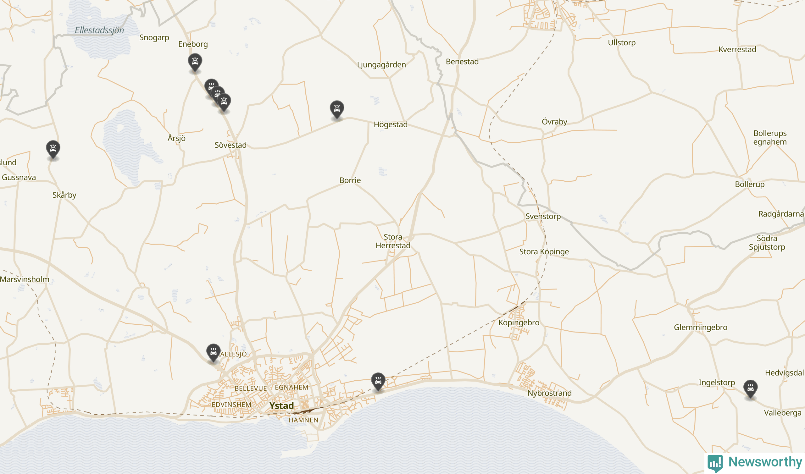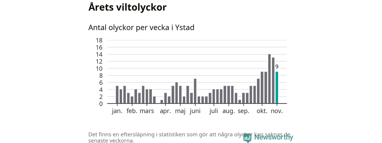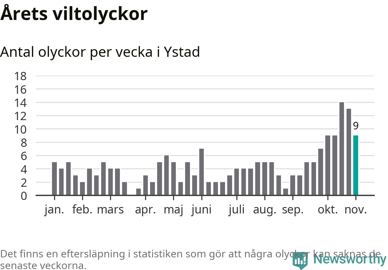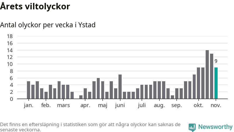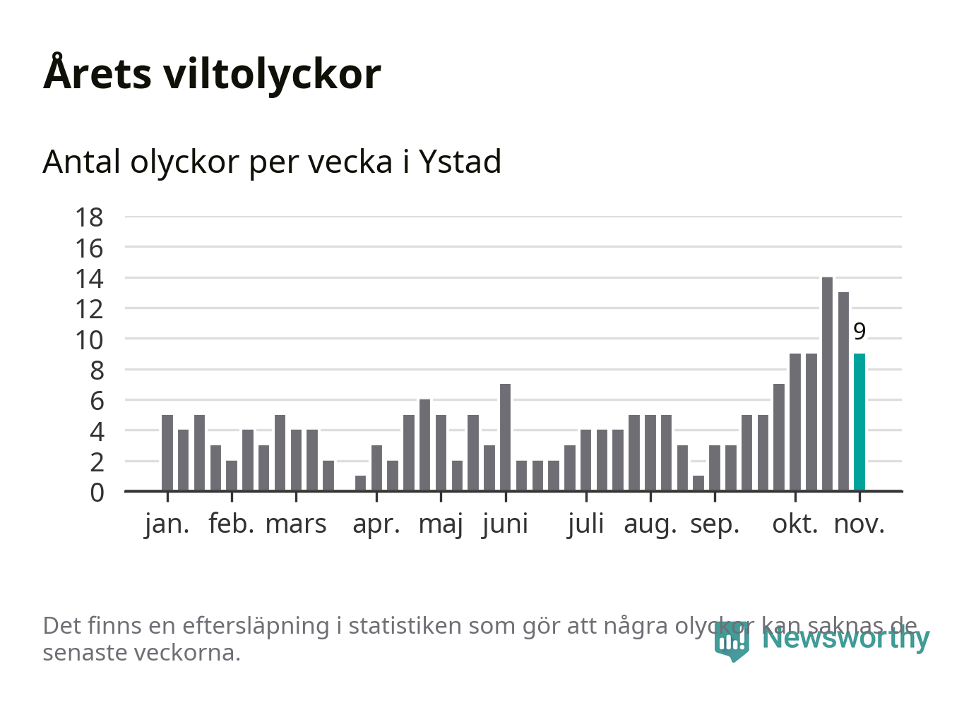 Hittills har nio viltolyckor rapporterats in i Ystads kommun från vecka 45. Se listan här.