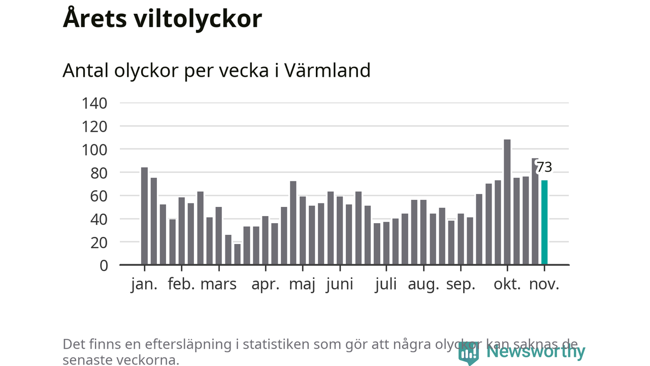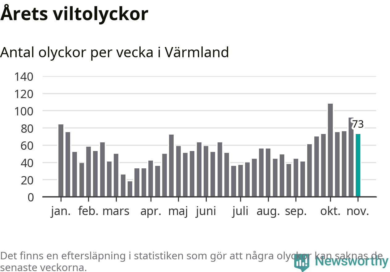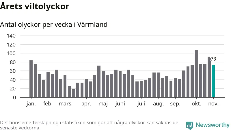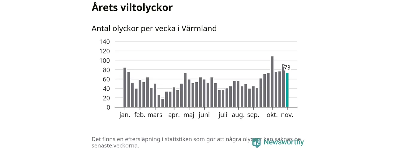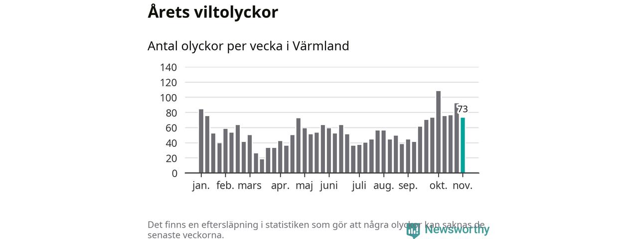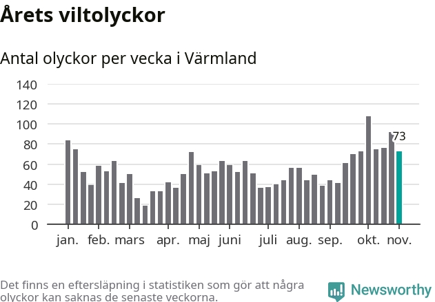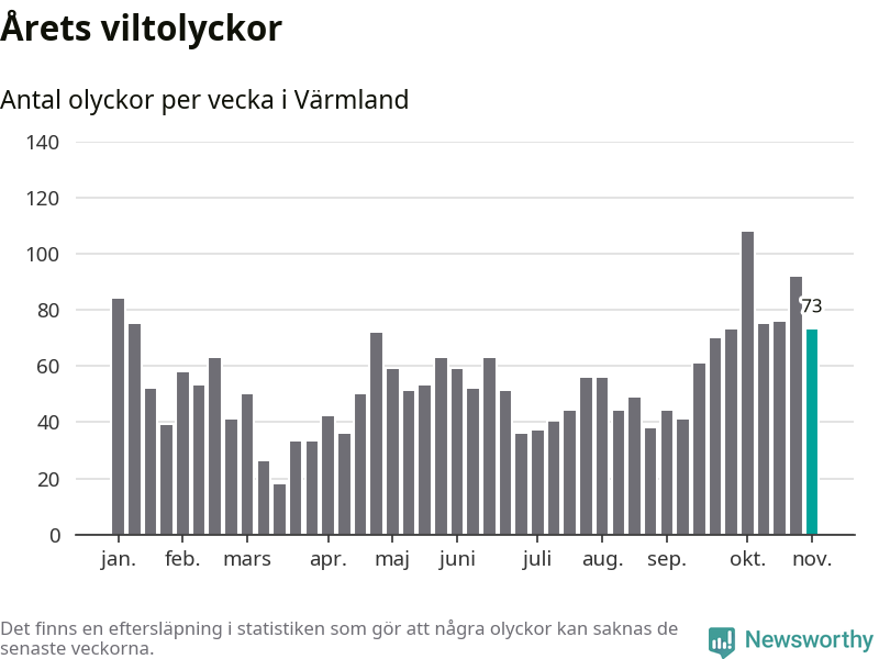 Hittills har 73 viltolyckor rapporterats in i Värmlands län från vecka 45. Se listan här.