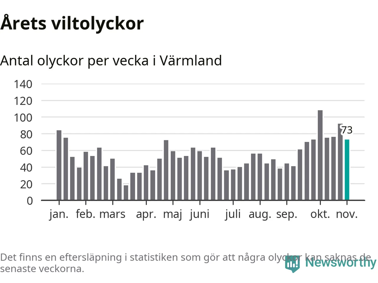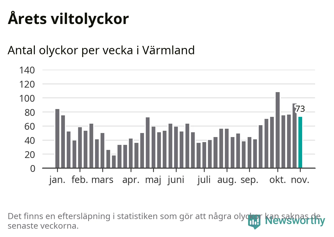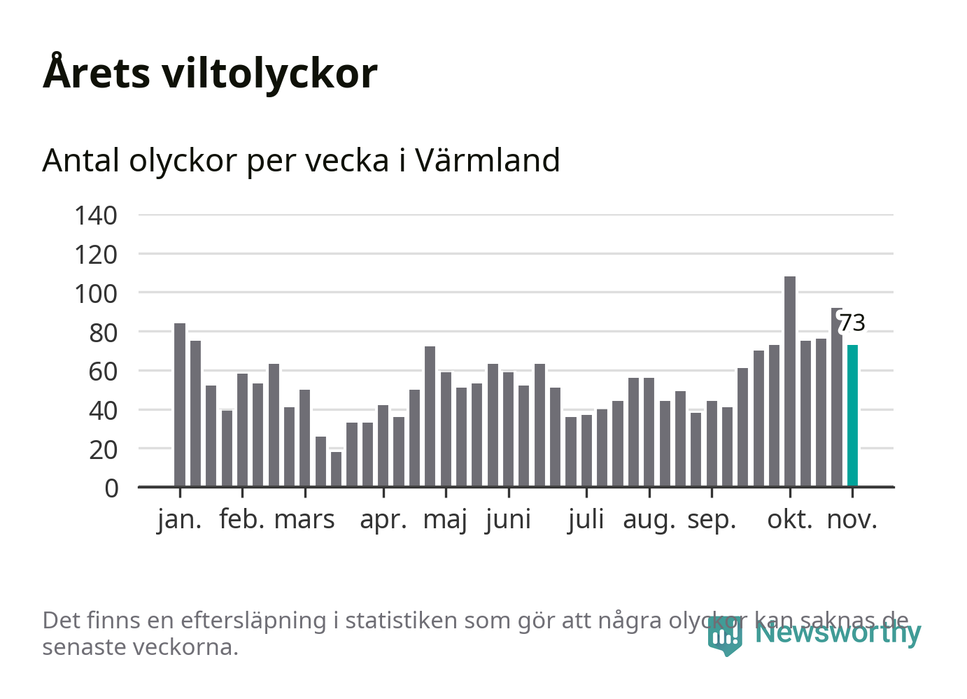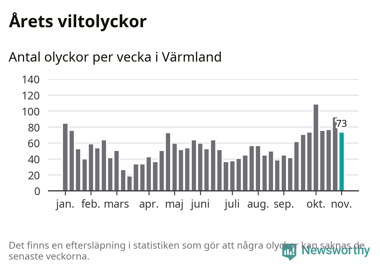 Hittills har 73 viltolyckor rapporterats in i Värmlands län från vecka 45. Se listan här.