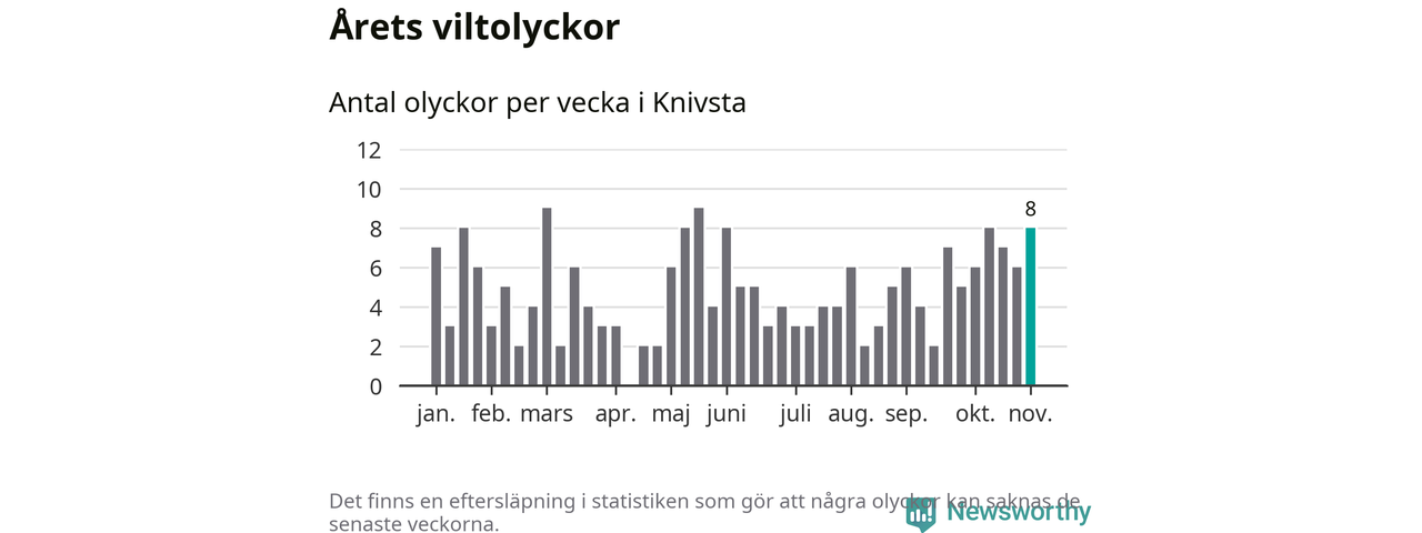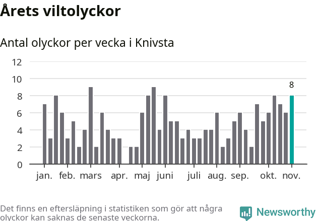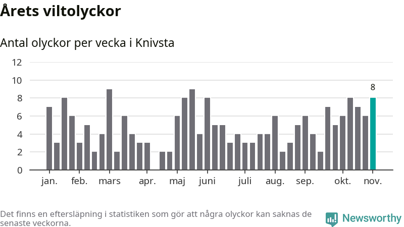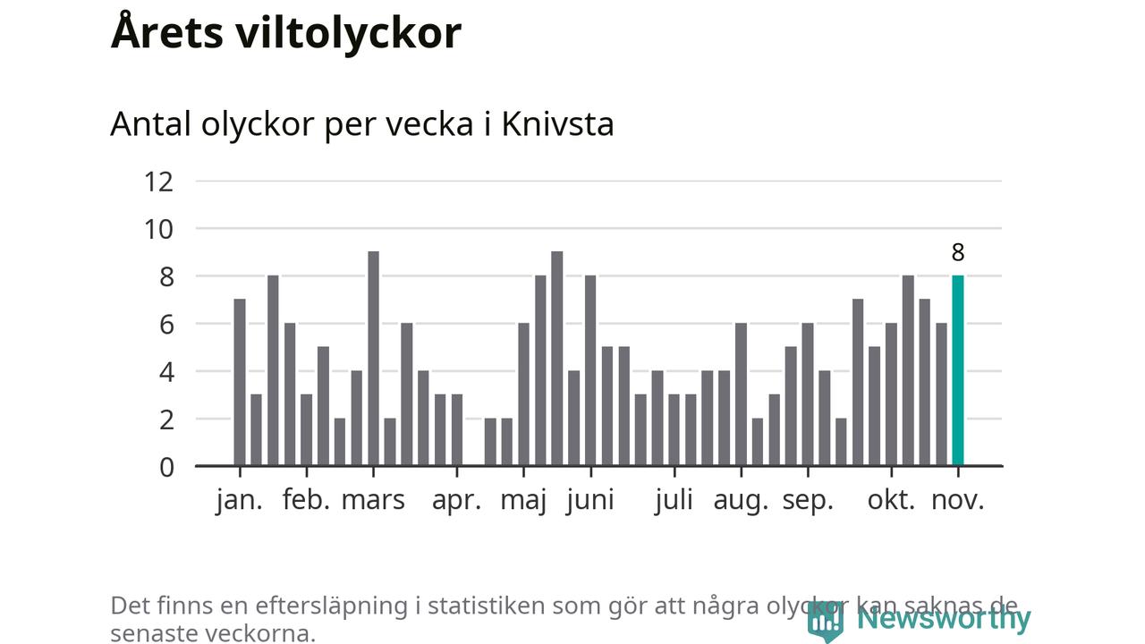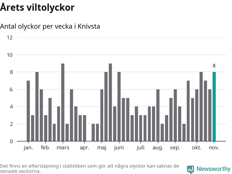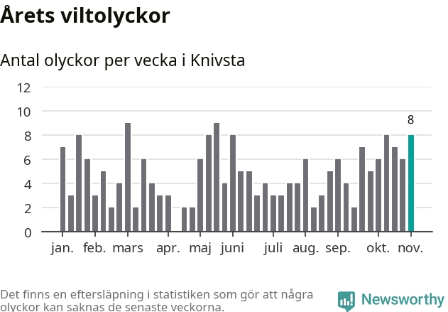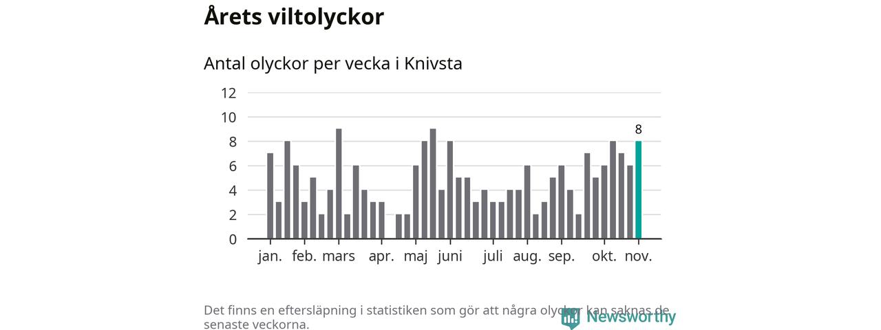 Hittills har åtta viltolyckor rapporterats in i Knivsta kommun från vecka 45. Se listan här.