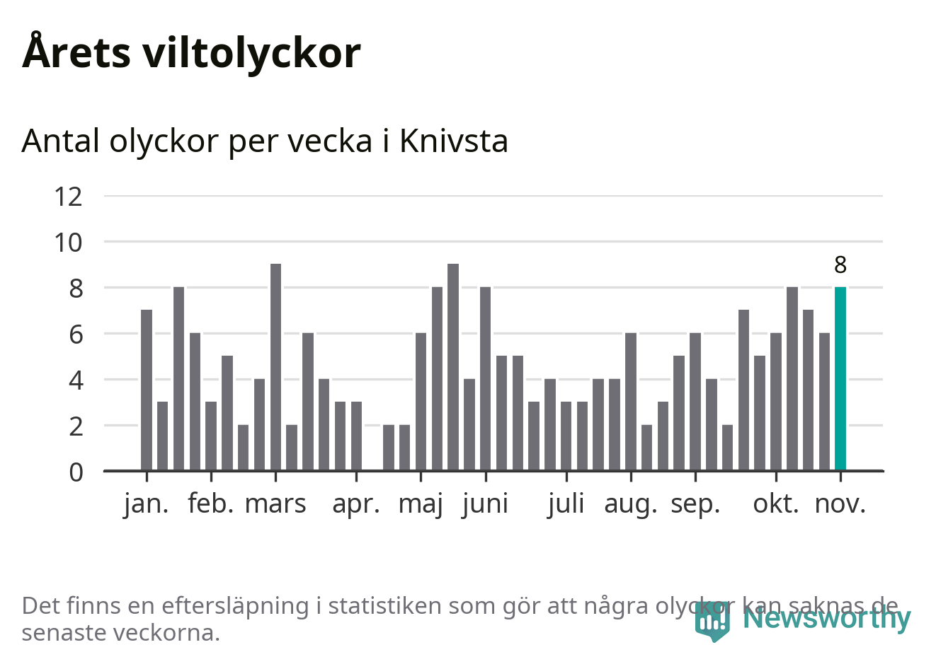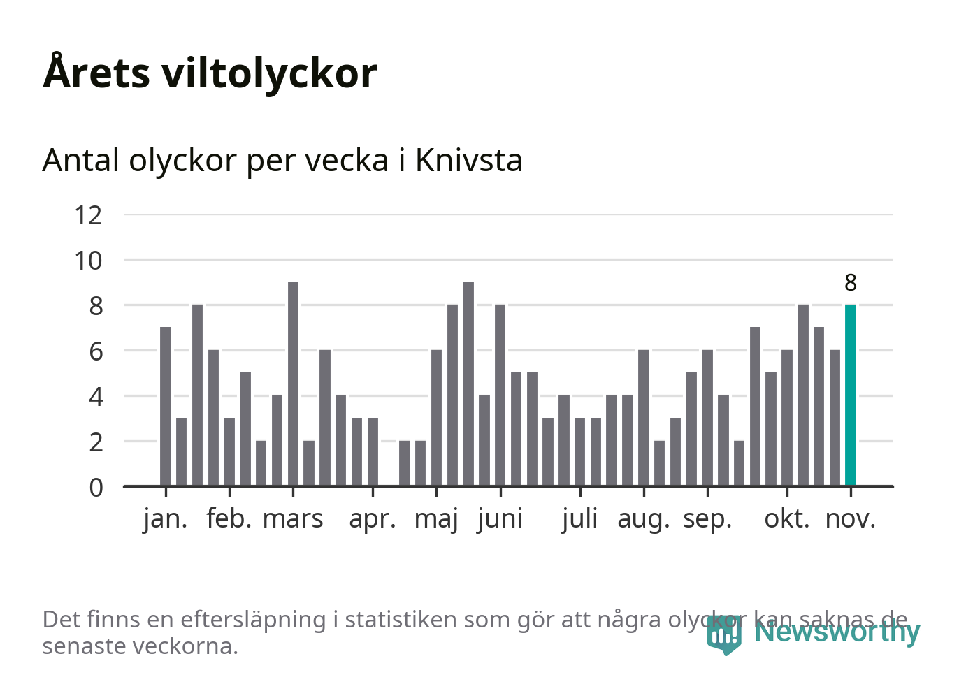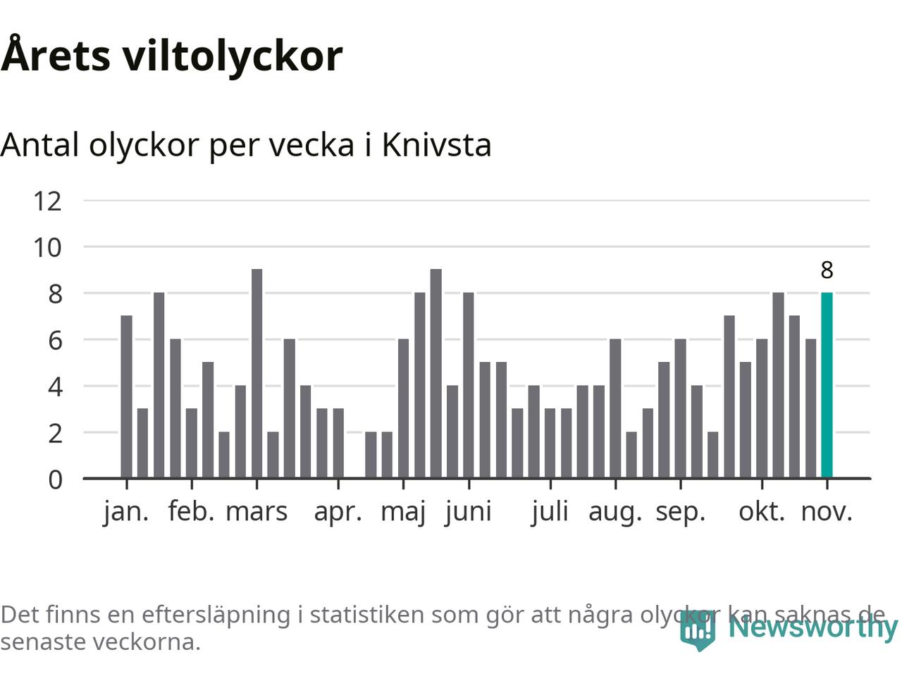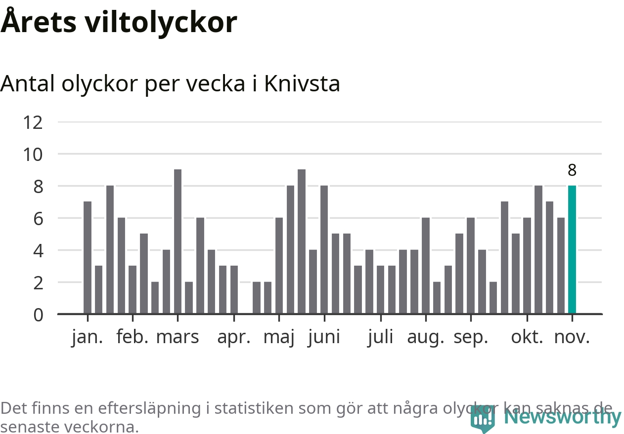 Hittills har åtta viltolyckor rapporterats in i Knivsta kommun från vecka 45. Se listan här.