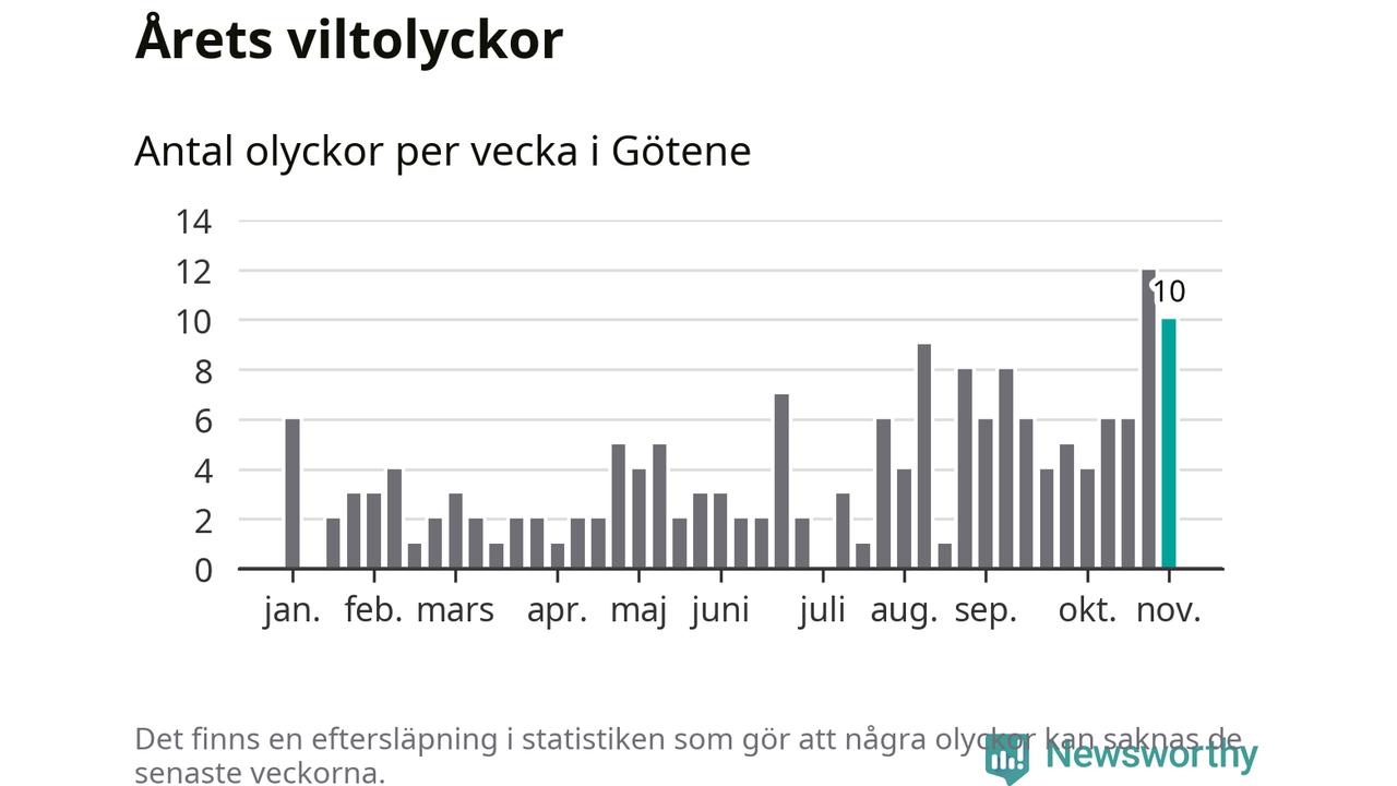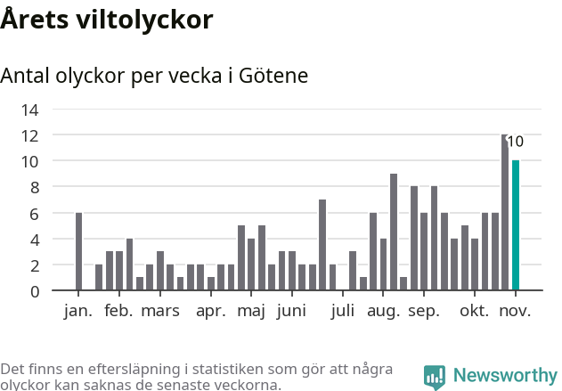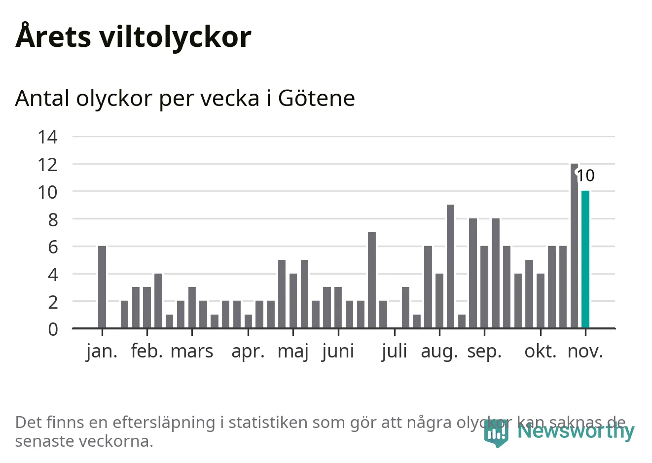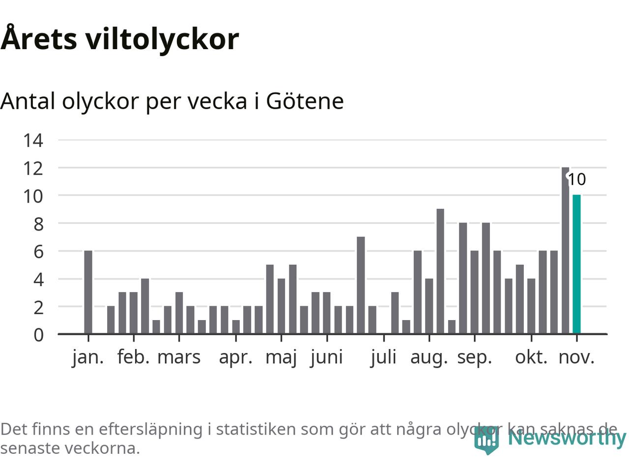 Hittills har tio viltolyckor rapporterats in i Götene kommun från vecka 45. Se listan här.