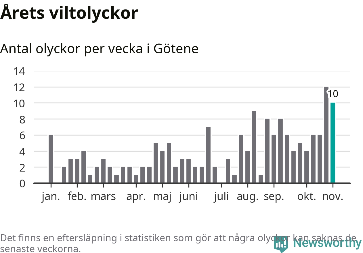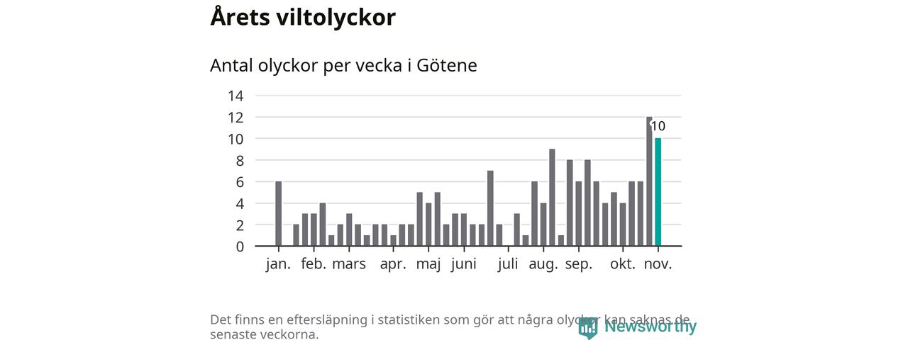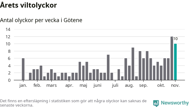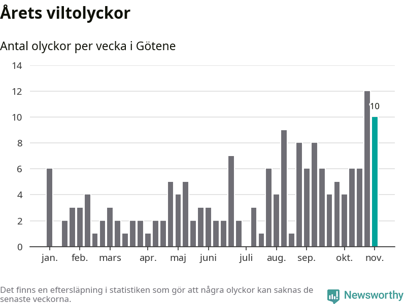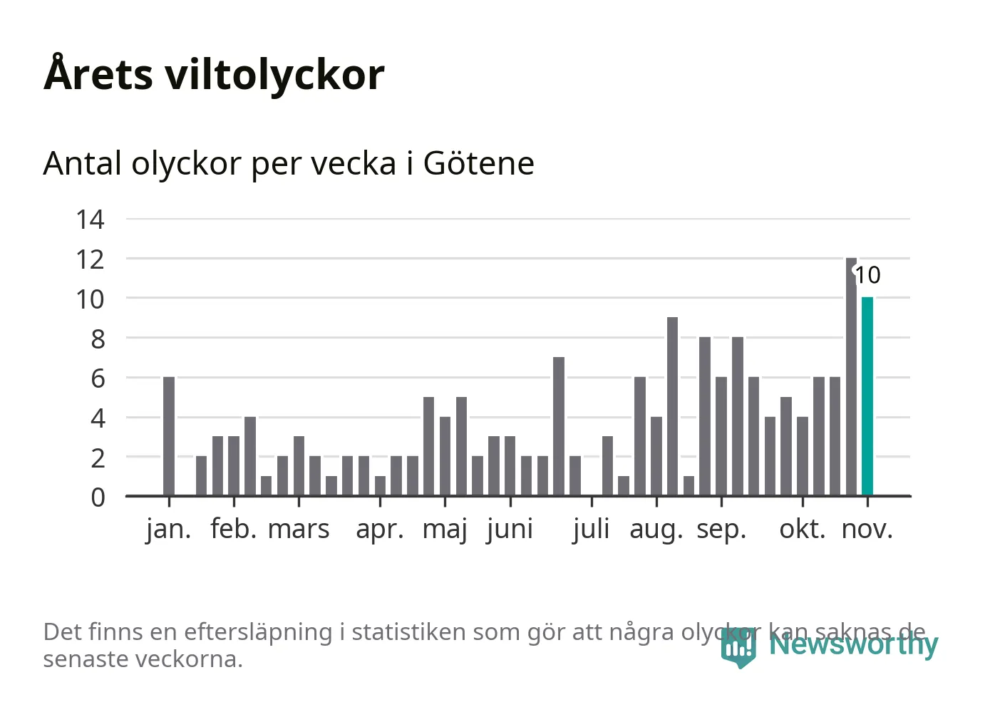 Hittills har tio viltolyckor rapporterats in i Götene kommun från vecka 45. Se listan här.