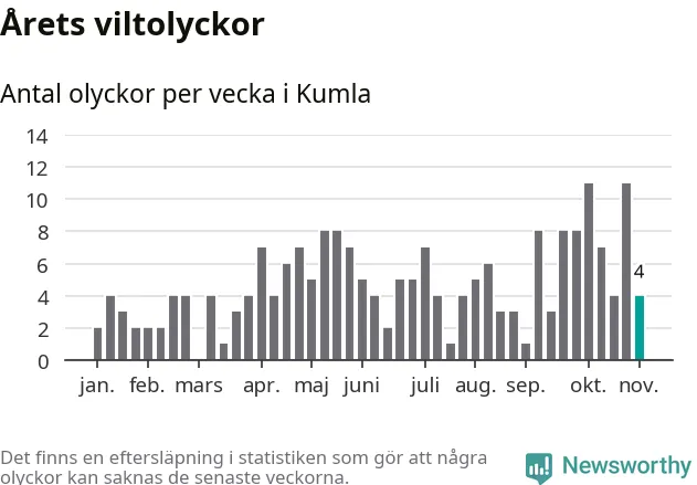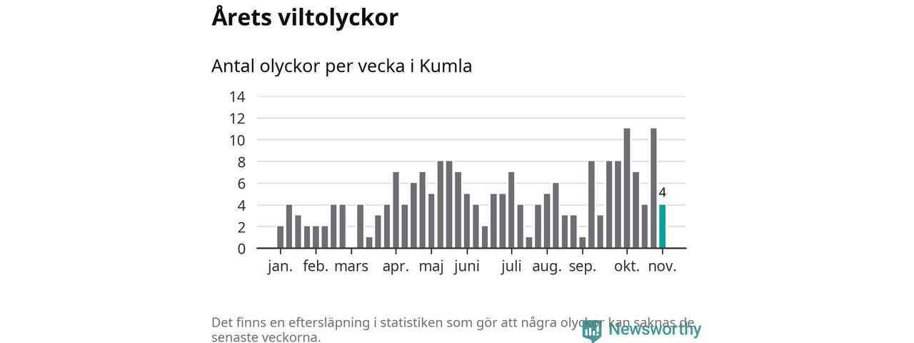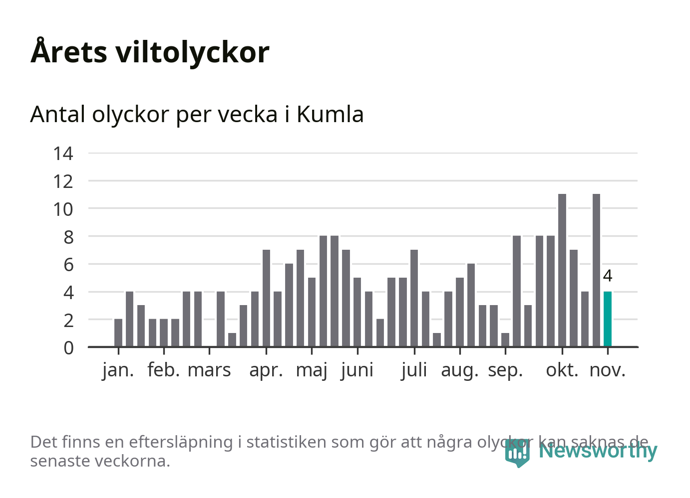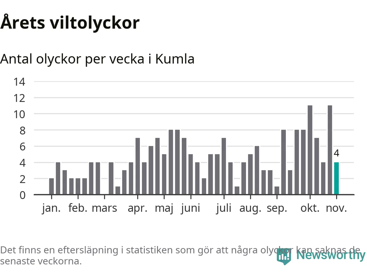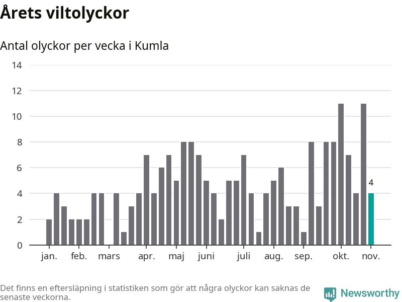 Hittills har fyra viltolyckor rapporterats in i Kumla kommun från vecka 45. Se listan här.