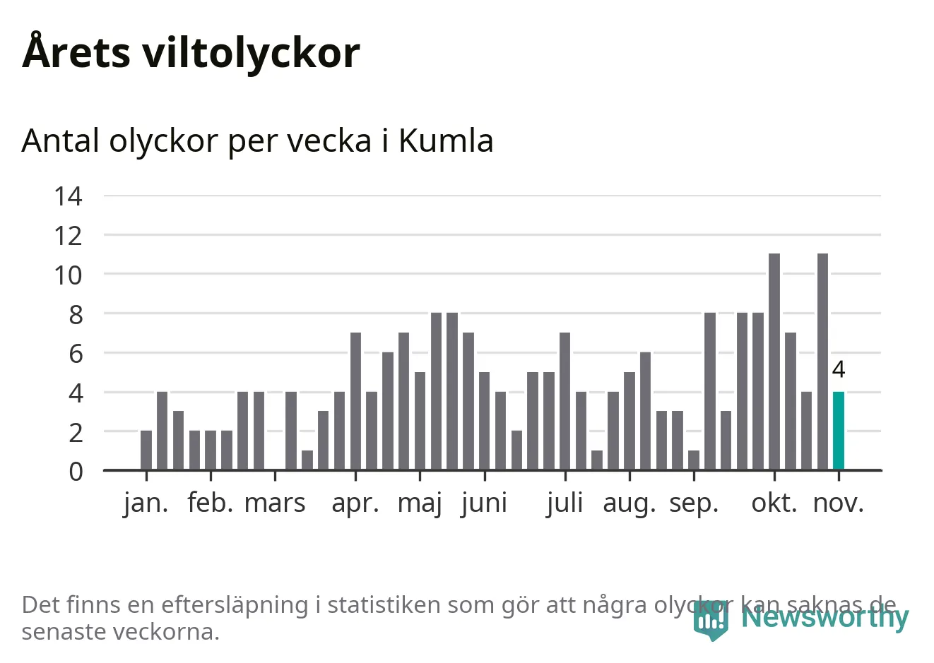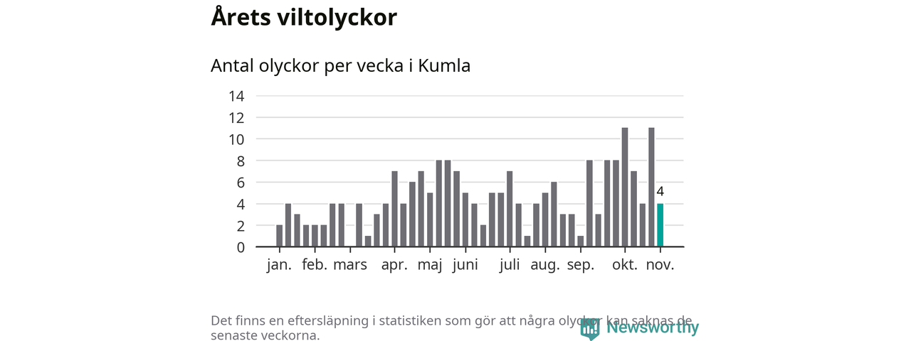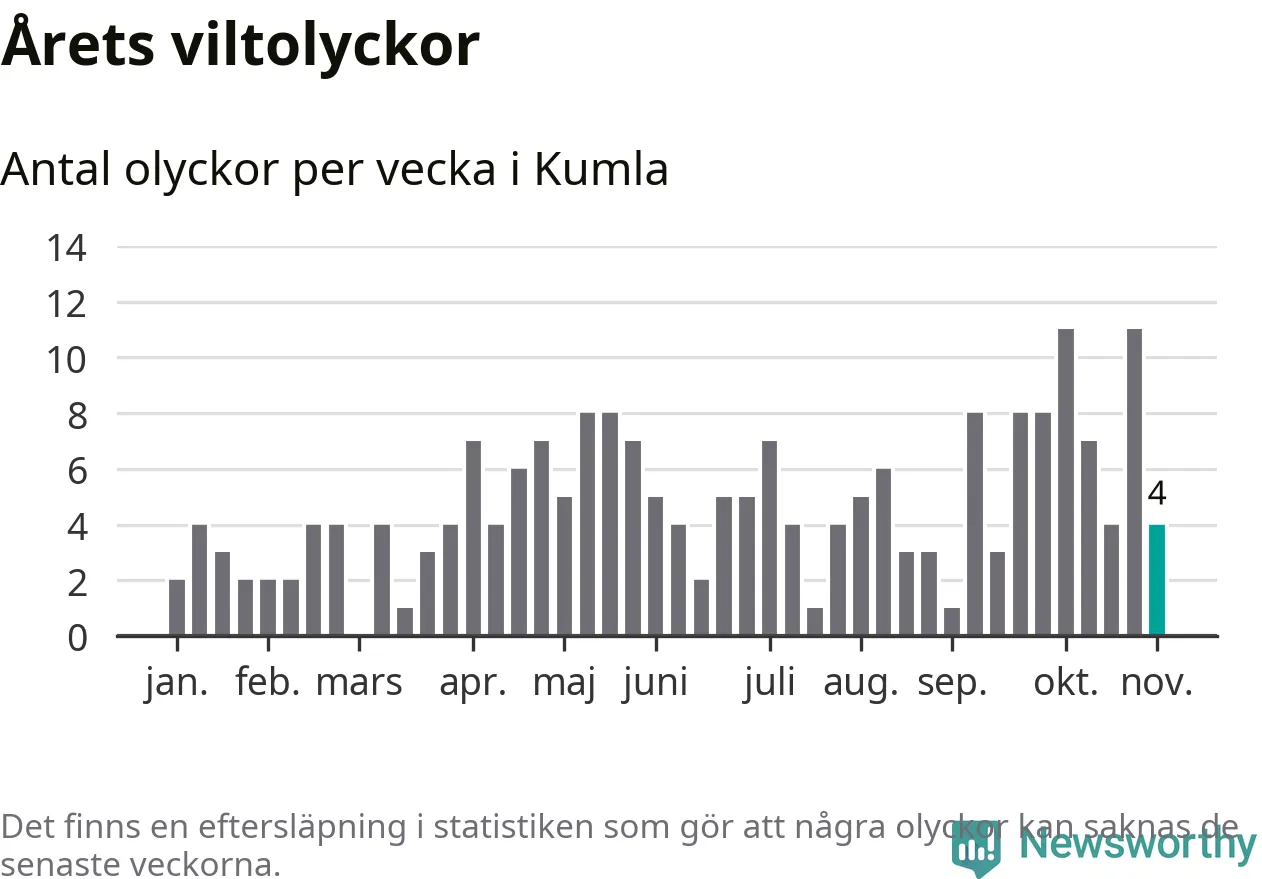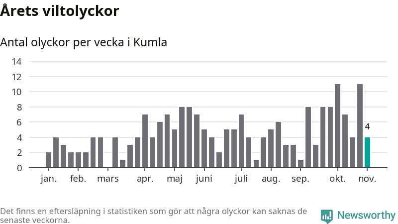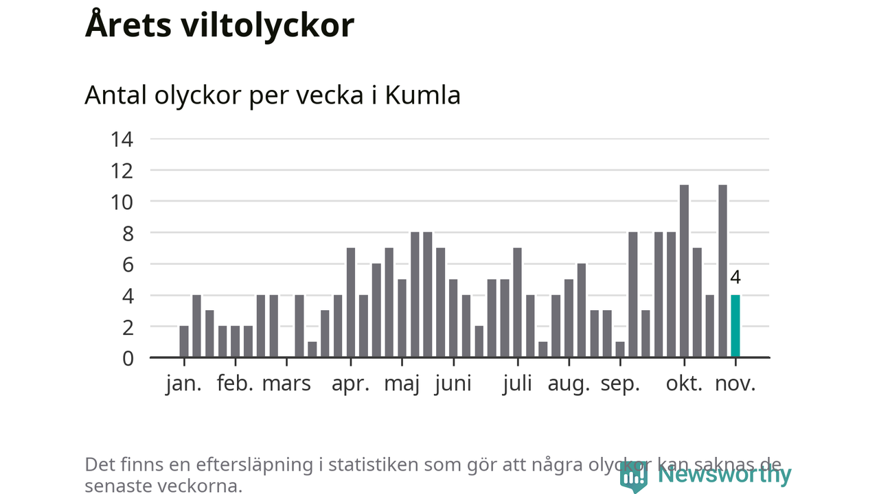 Hittills har fyra viltolyckor rapporterats in i Kumla kommun från vecka 45. Se listan här.