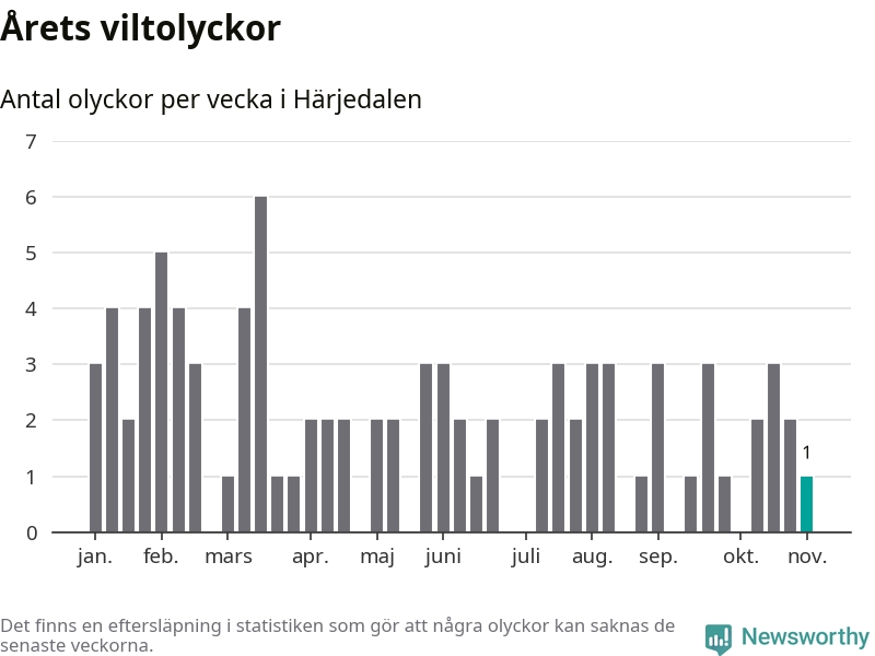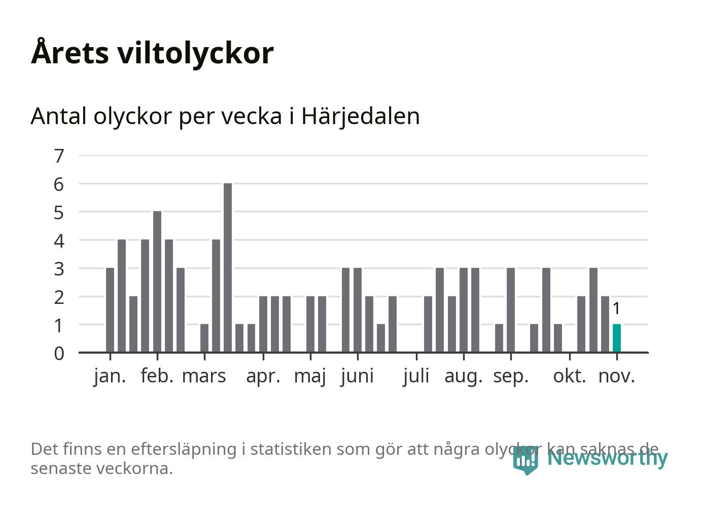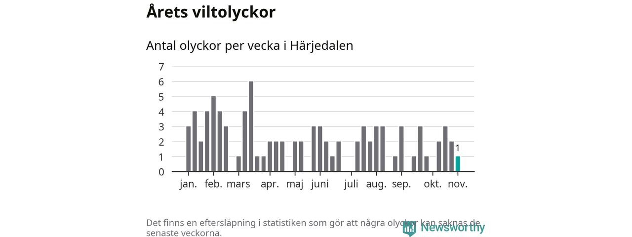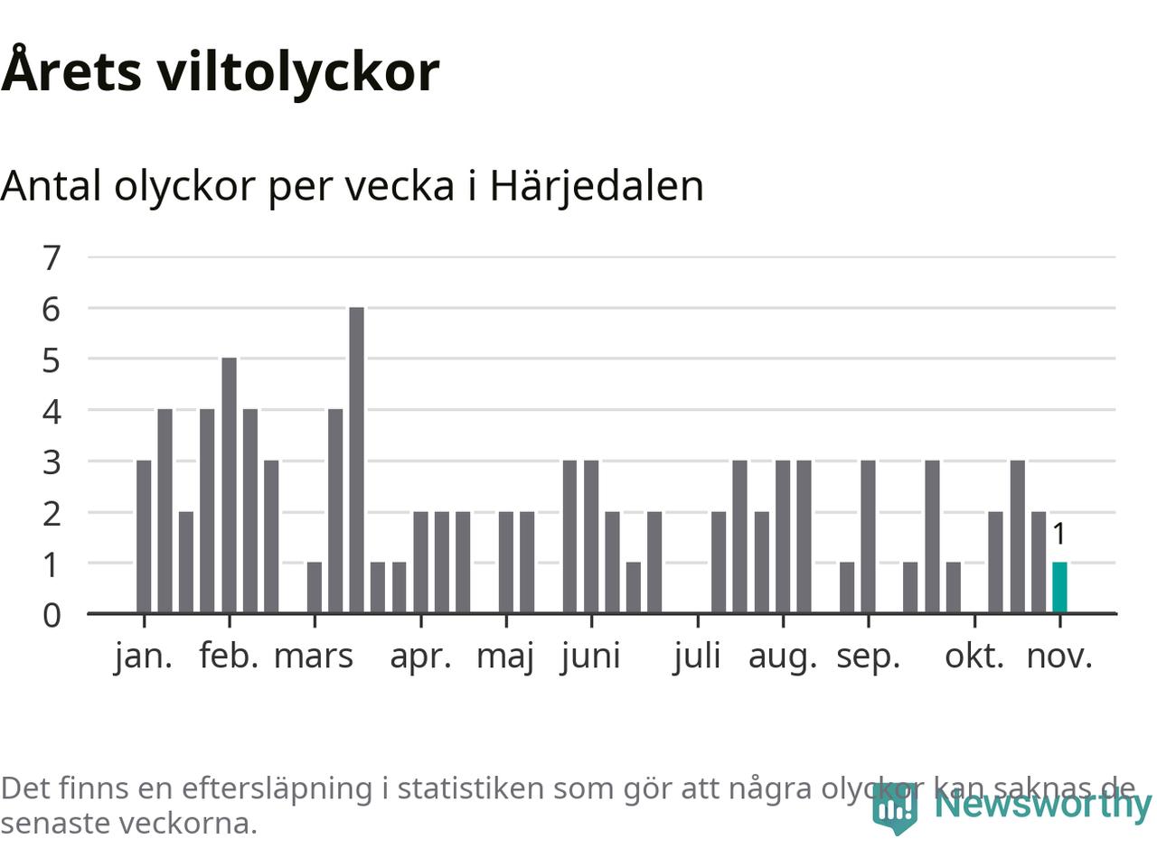 Från förra veckan (vecka 45) har hittills en viltolycka rapporterats in i Härjedalens kommun.