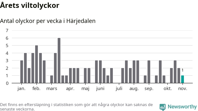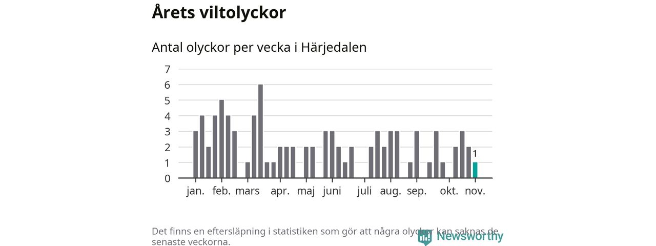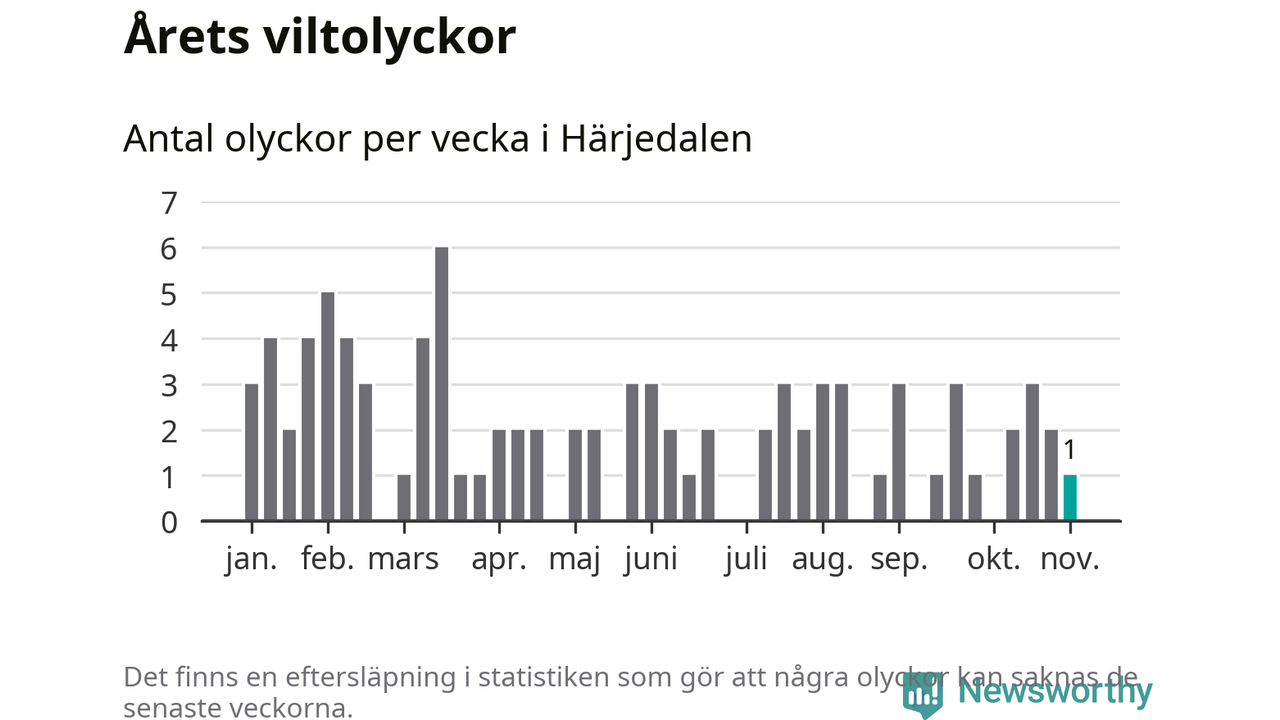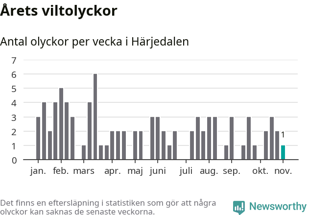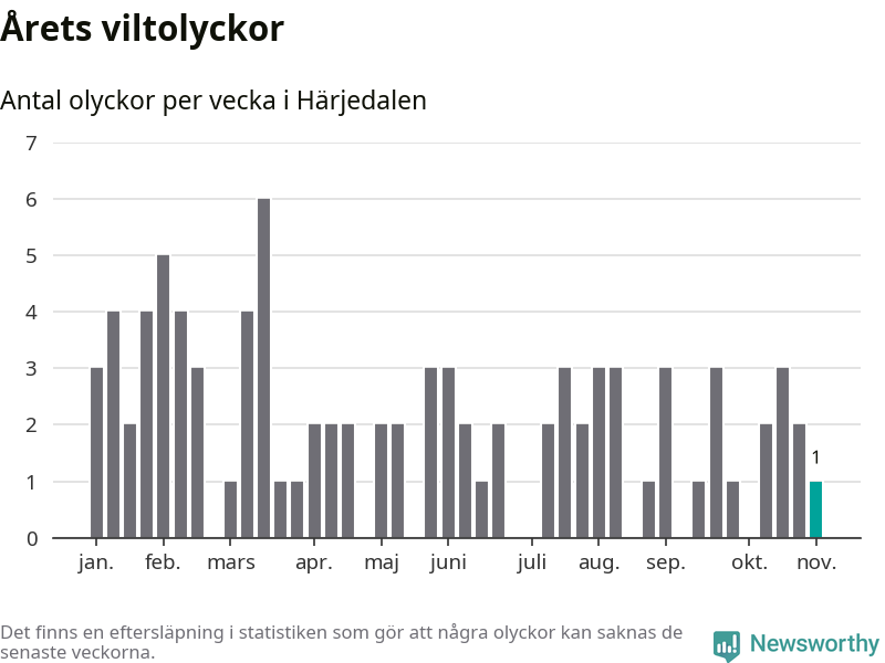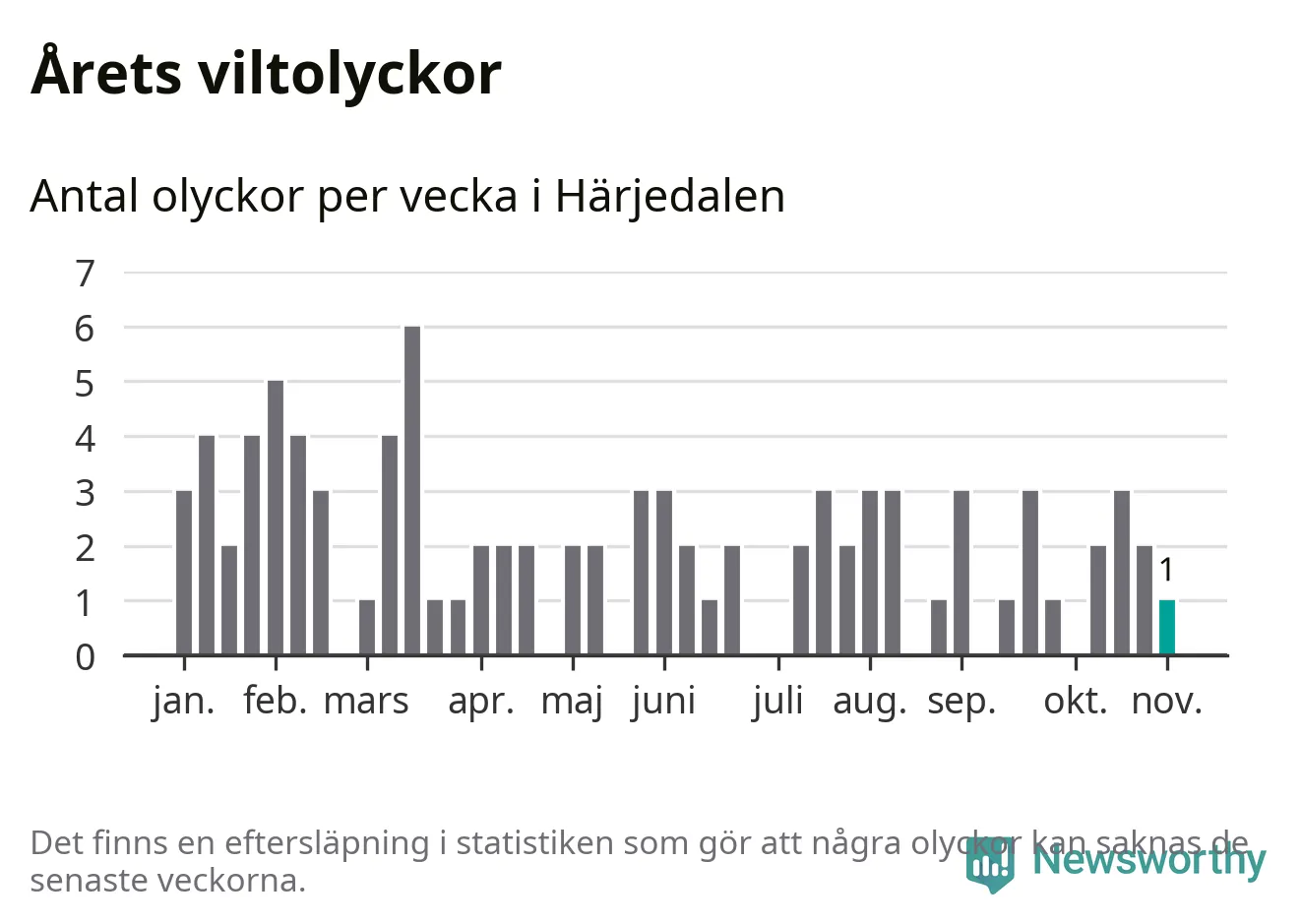 Från förra veckan (vecka 45) har hittills en viltolycka rapporterats in i Härjedalens kommun.