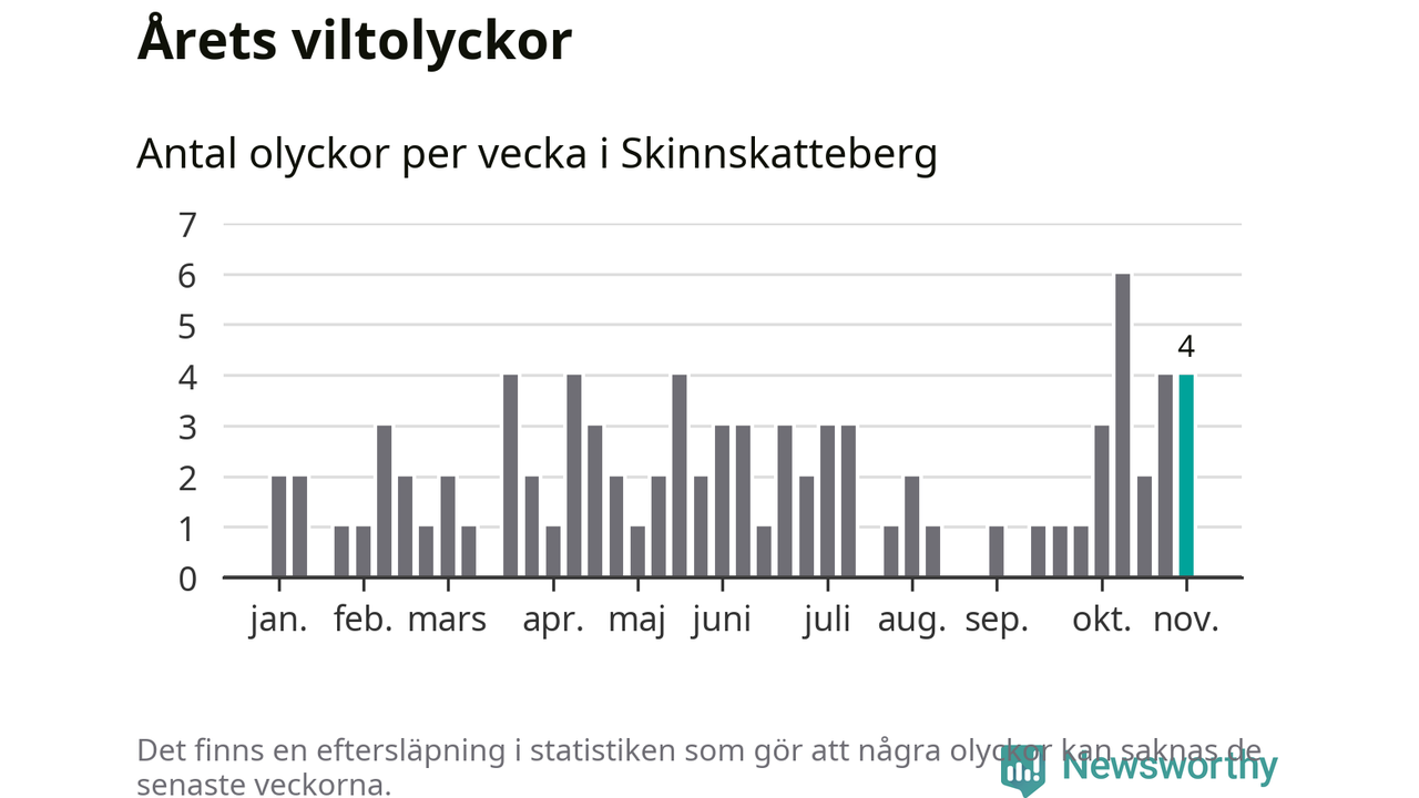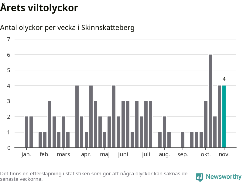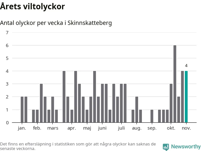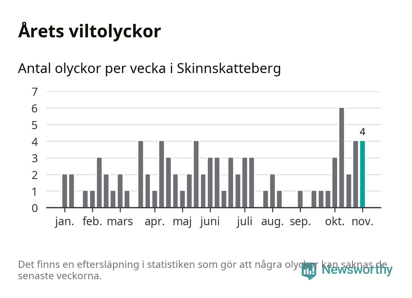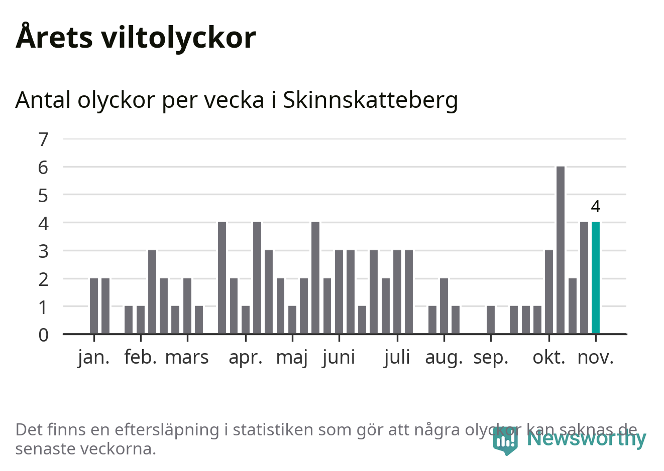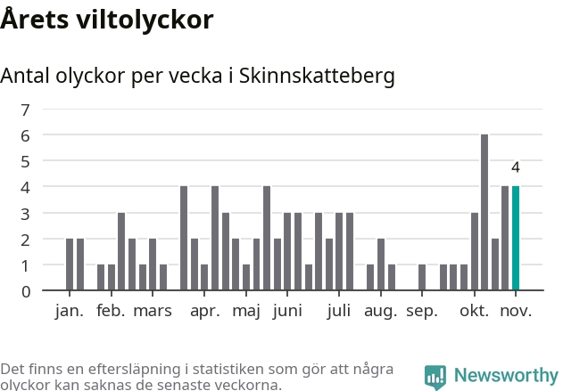 Hittills har fyra viltolyckor rapporterats in i Skinnskattebergs kommun från vecka 45. Se listan här.