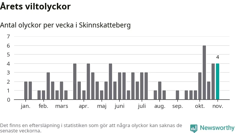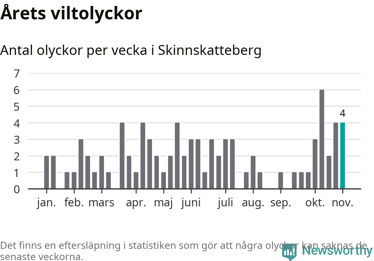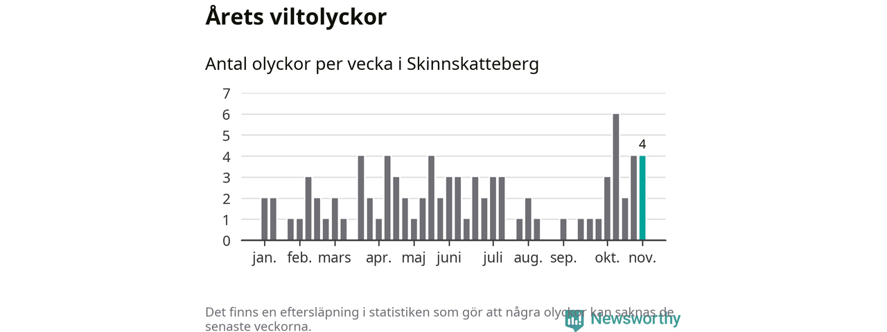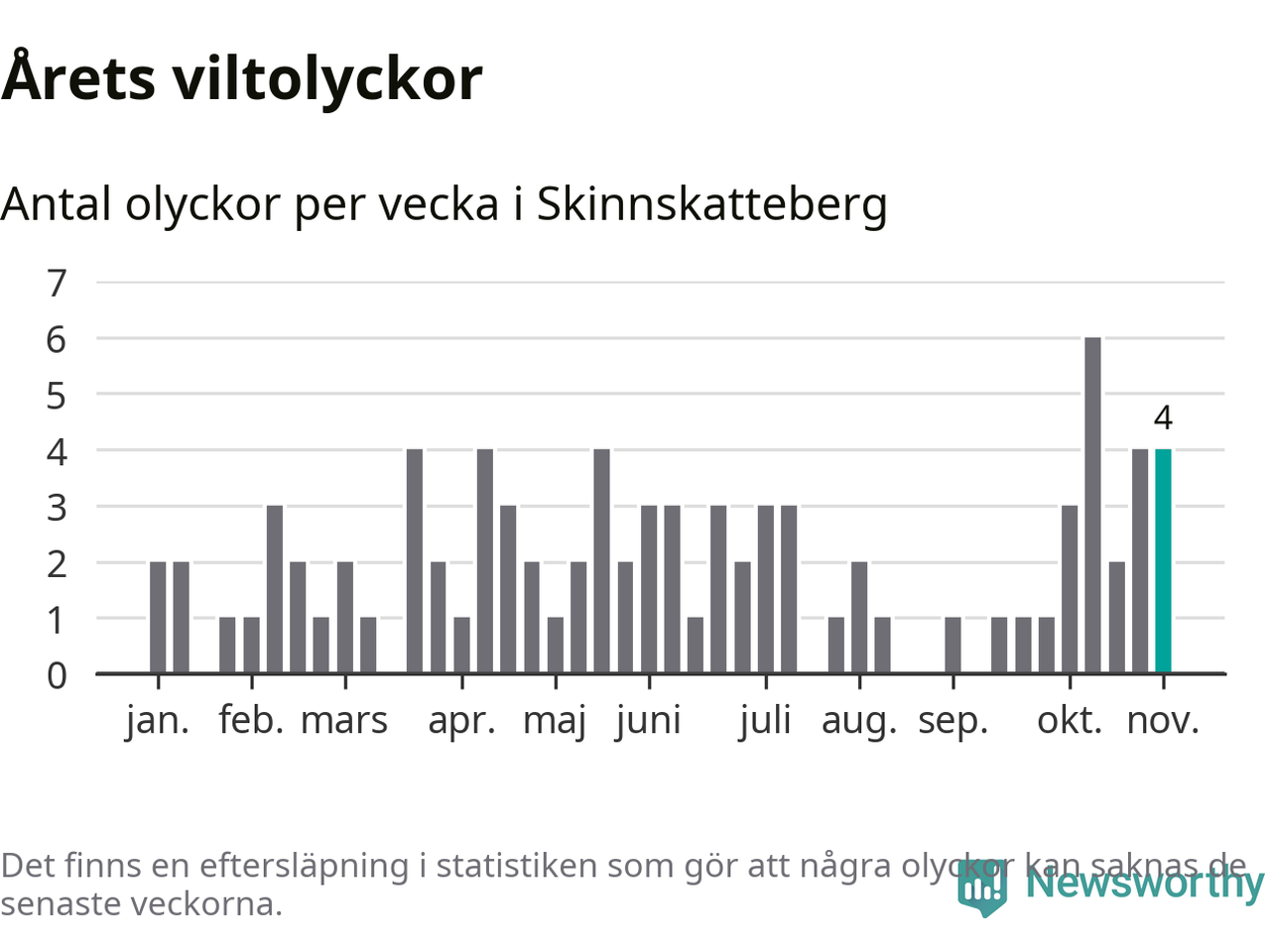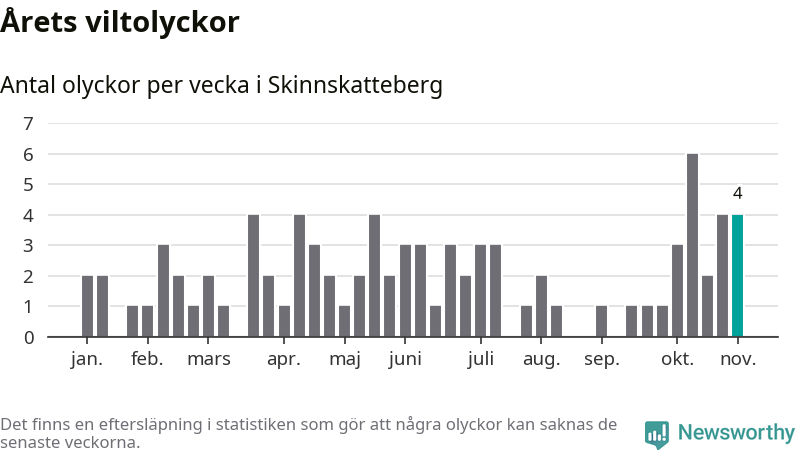 Hittills har fyra viltolyckor rapporterats in i Skinnskattebergs kommun från vecka 45. Se listan här.