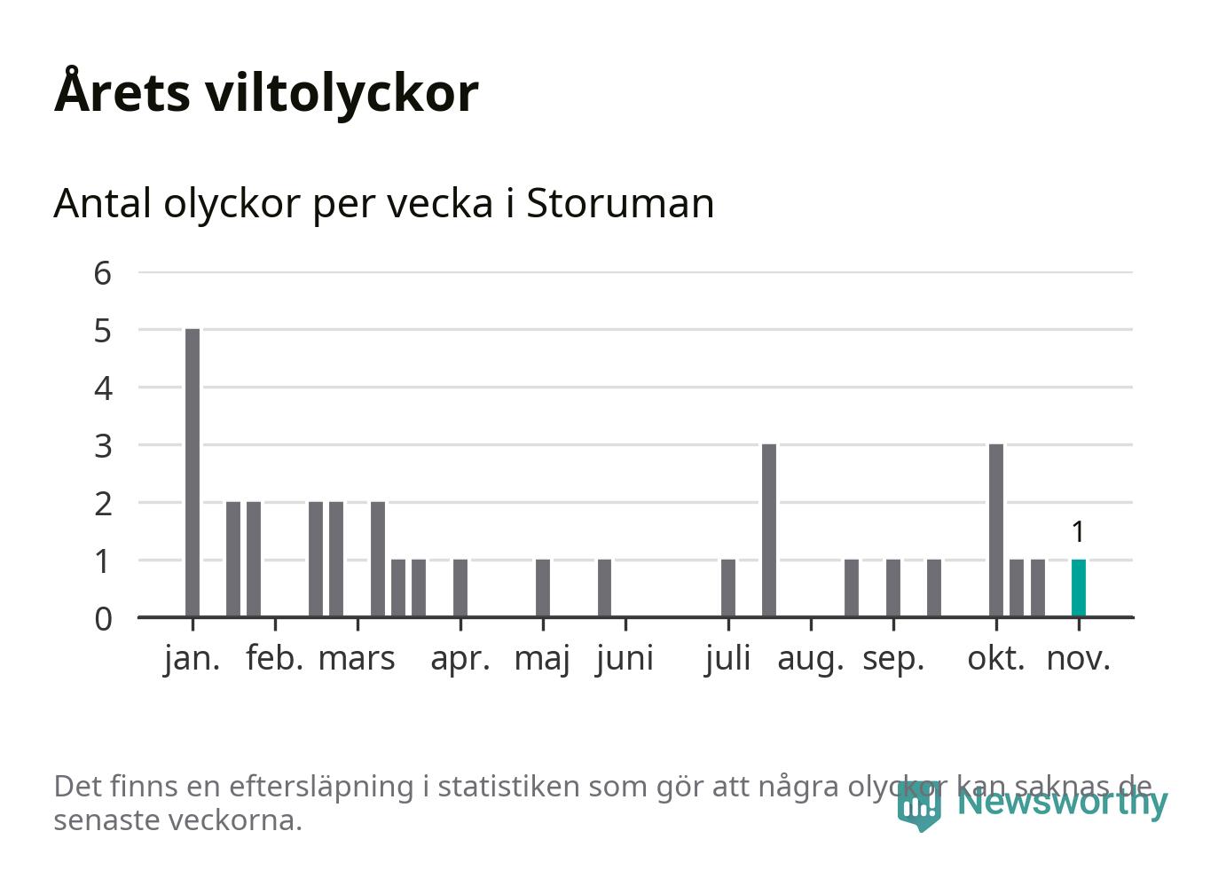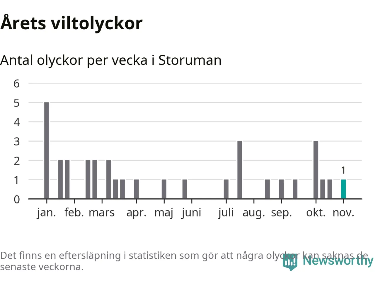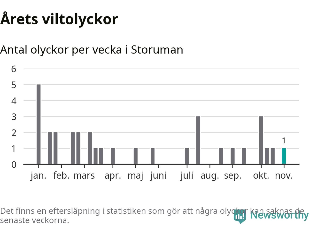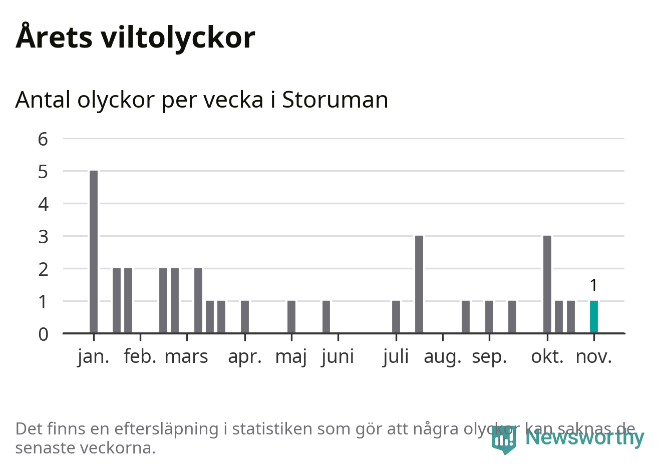 Från förra veckan (vecka 45) har hittills en viltolycka rapporterats in i Storumans kommun.