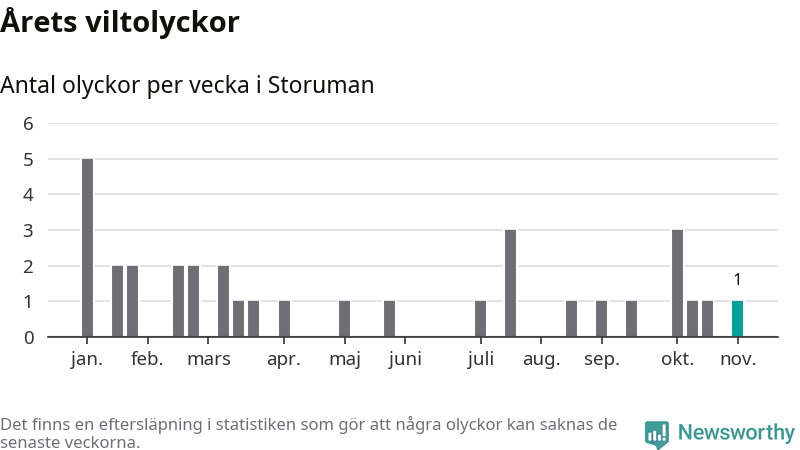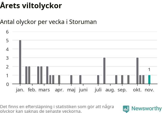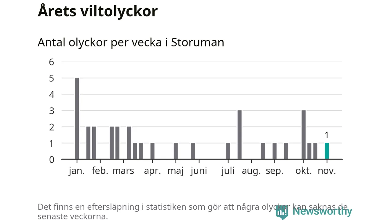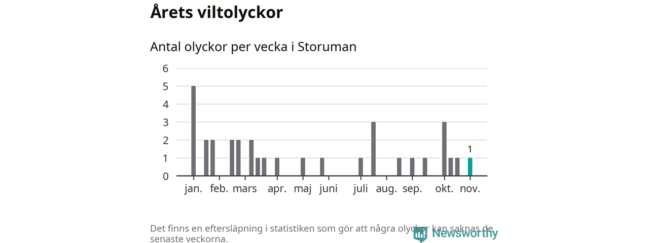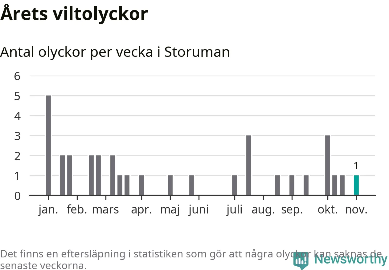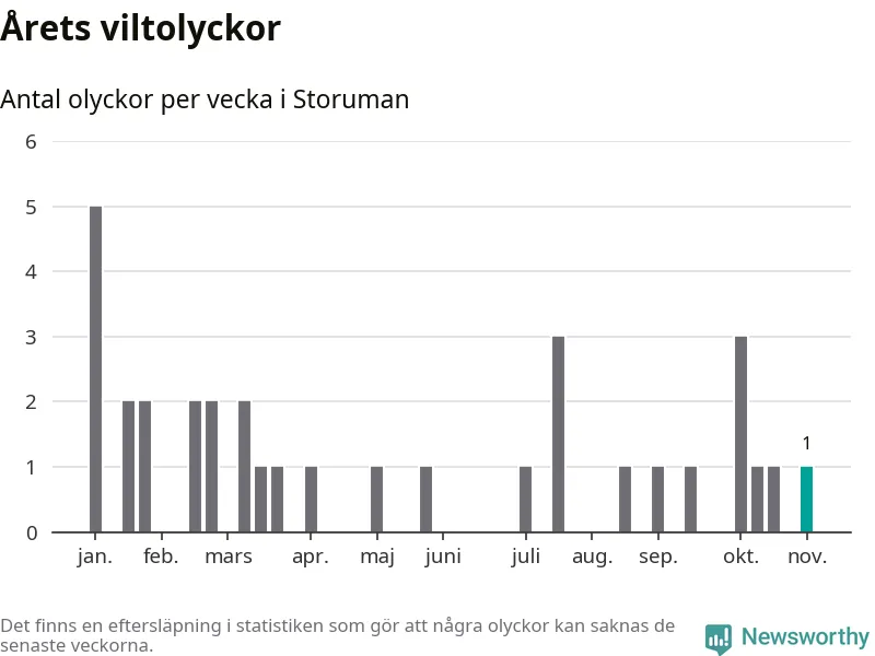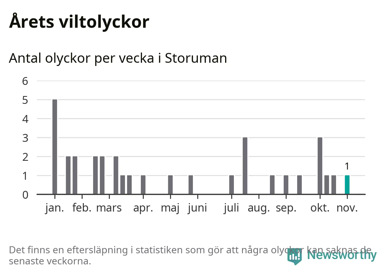 Från förra veckan (vecka 45) har hittills en viltolycka rapporterats in i Storumans kommun.